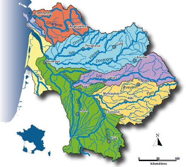 Carte de la circonscription du COGEPOMI Garonne-Dordogne-Charente-Seudre-Leyre ; identification des sous-bassins; source : PLAGEPOMI 2022-2027