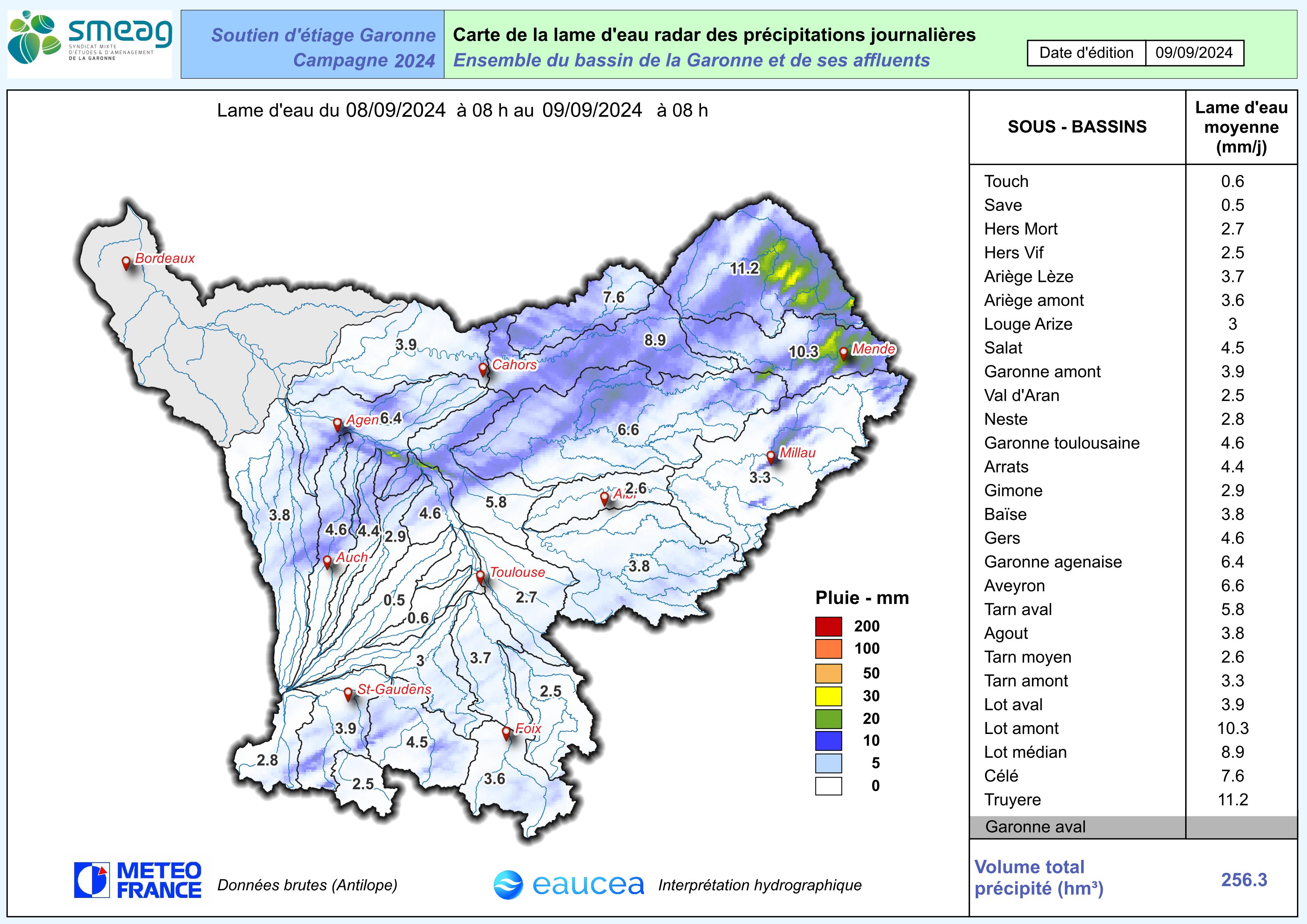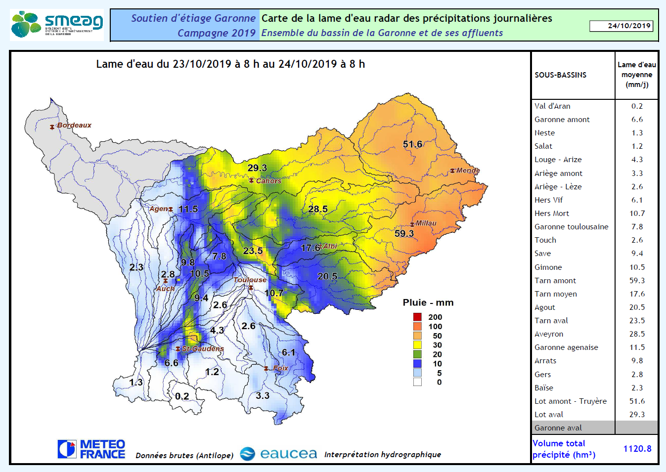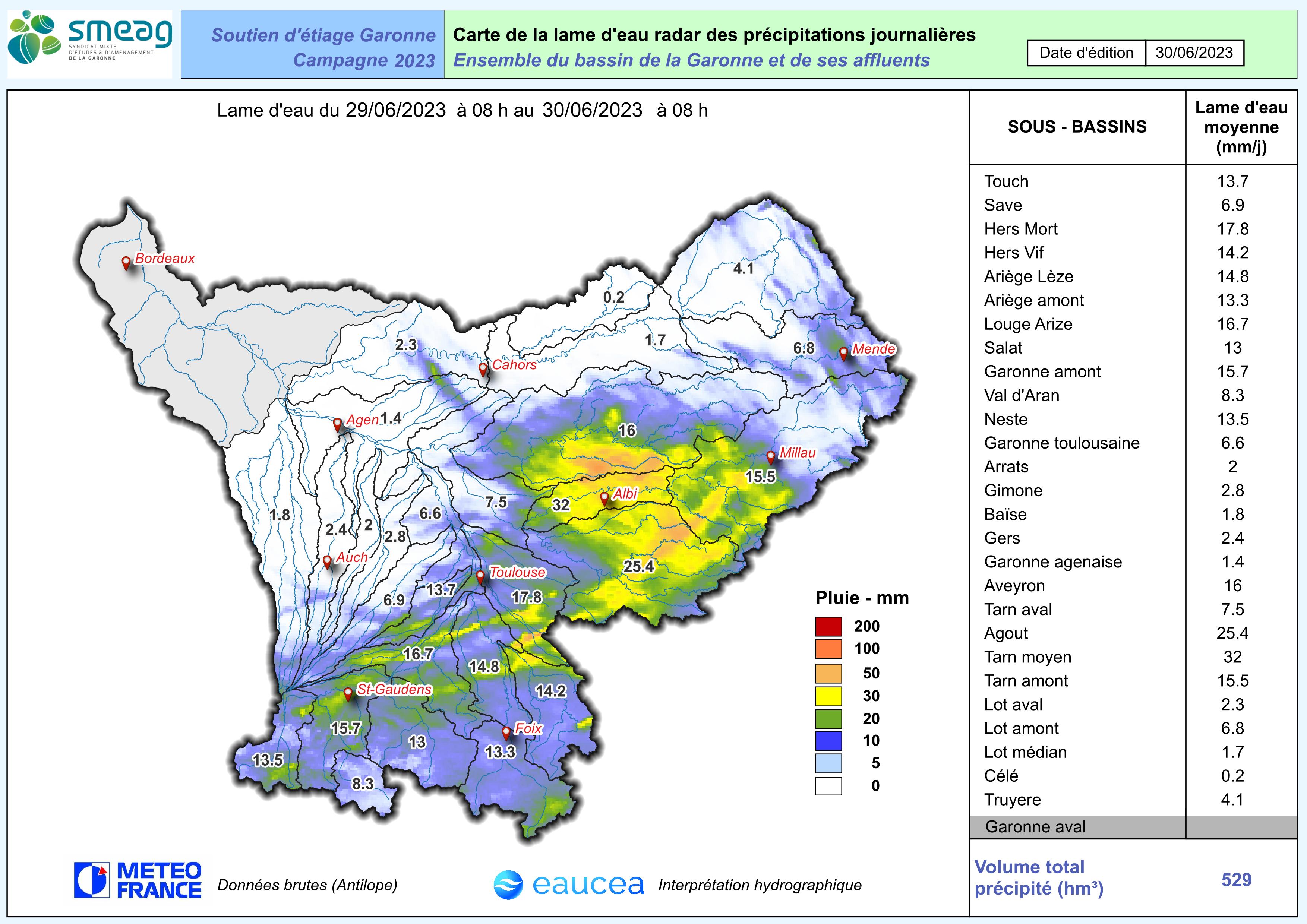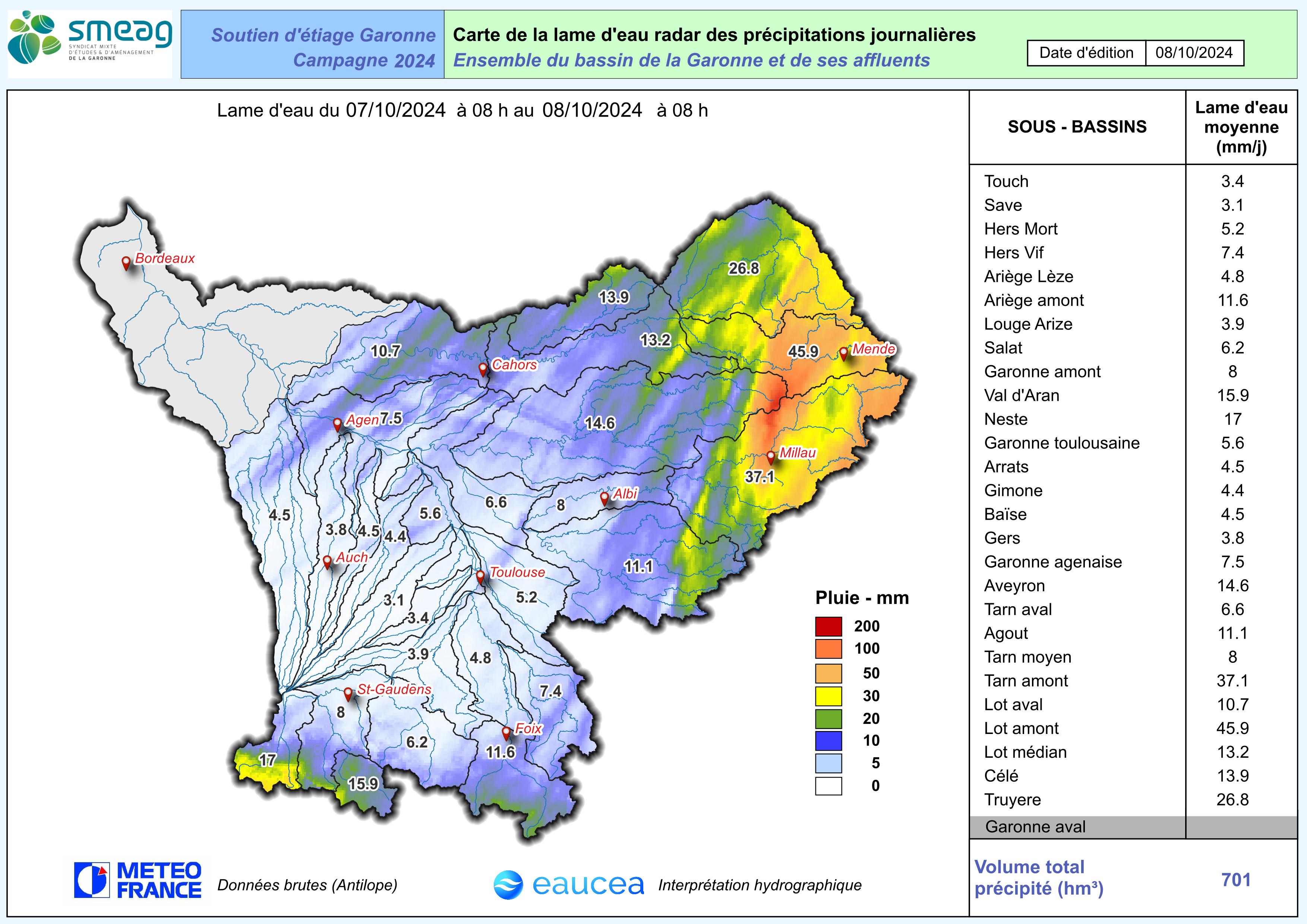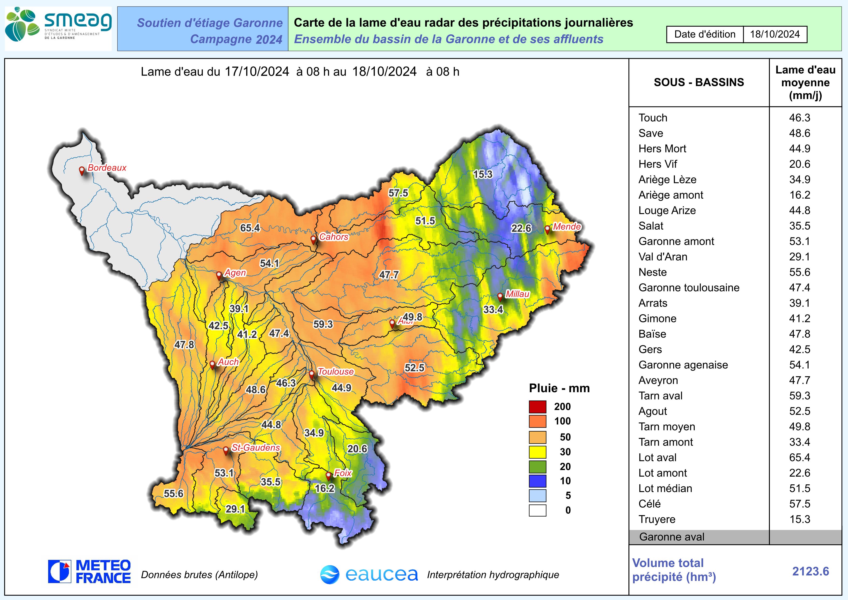 Cette carte illustre les quantités d'eau précipitées sur 24 heures par sous-bassins versants (source : images radar Météo France).