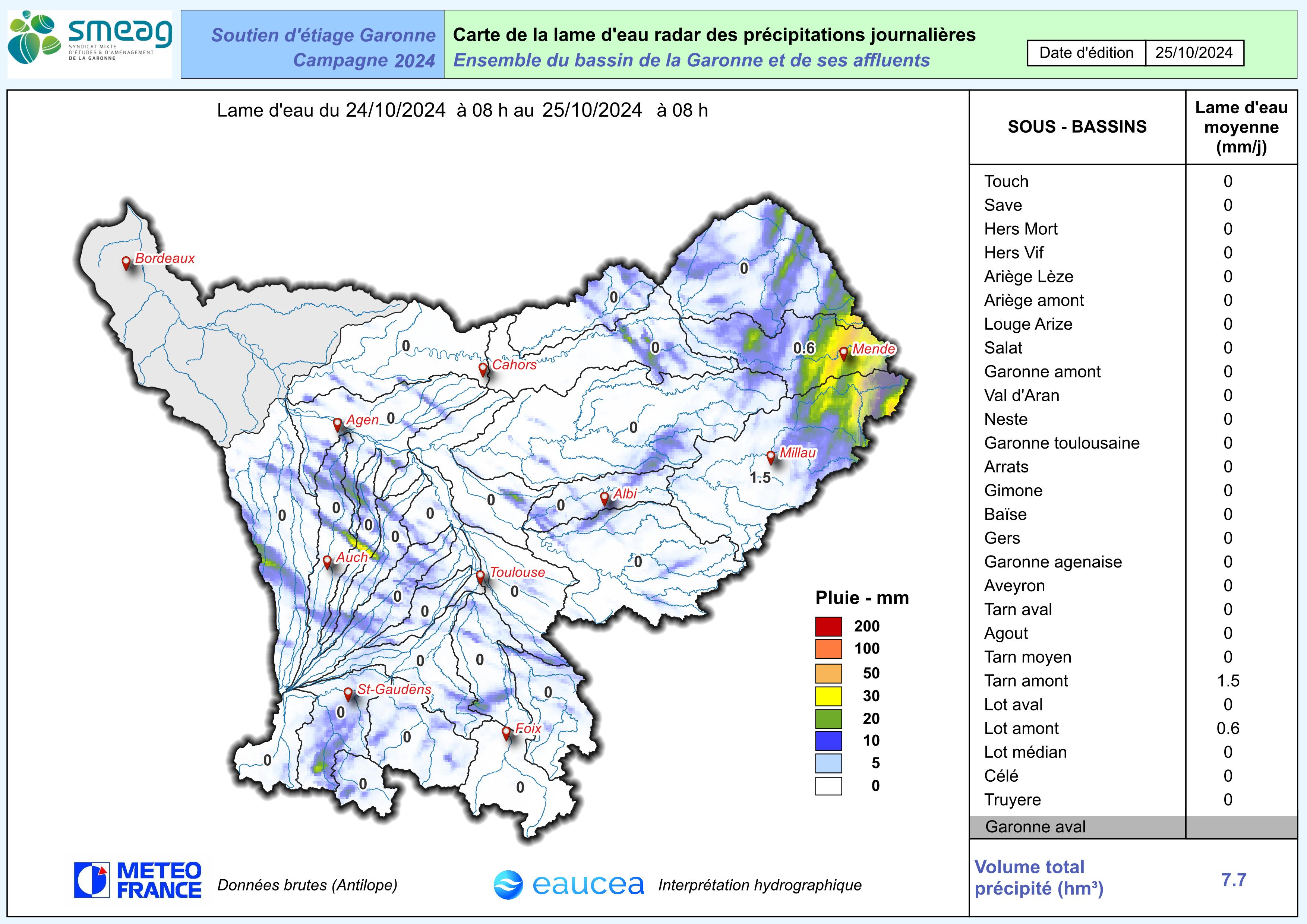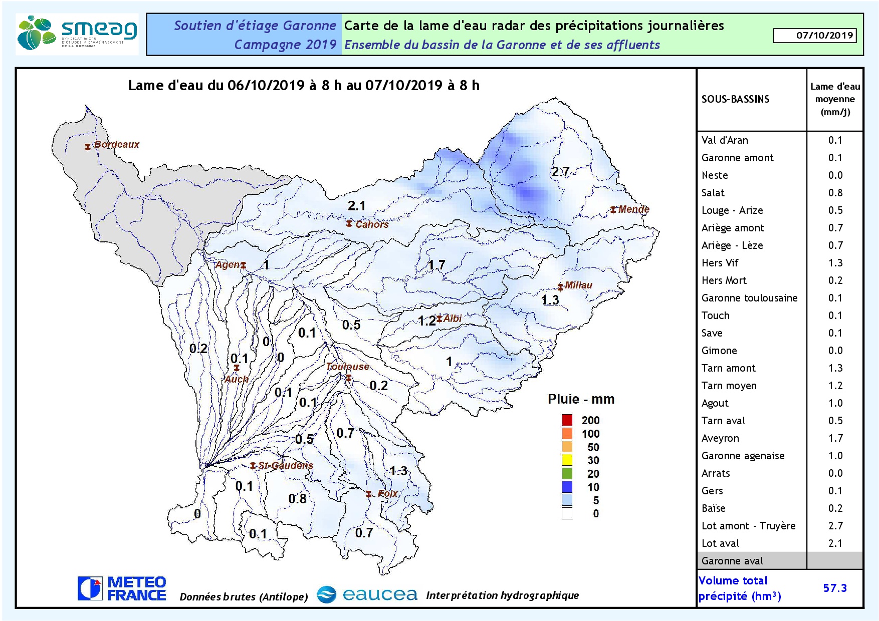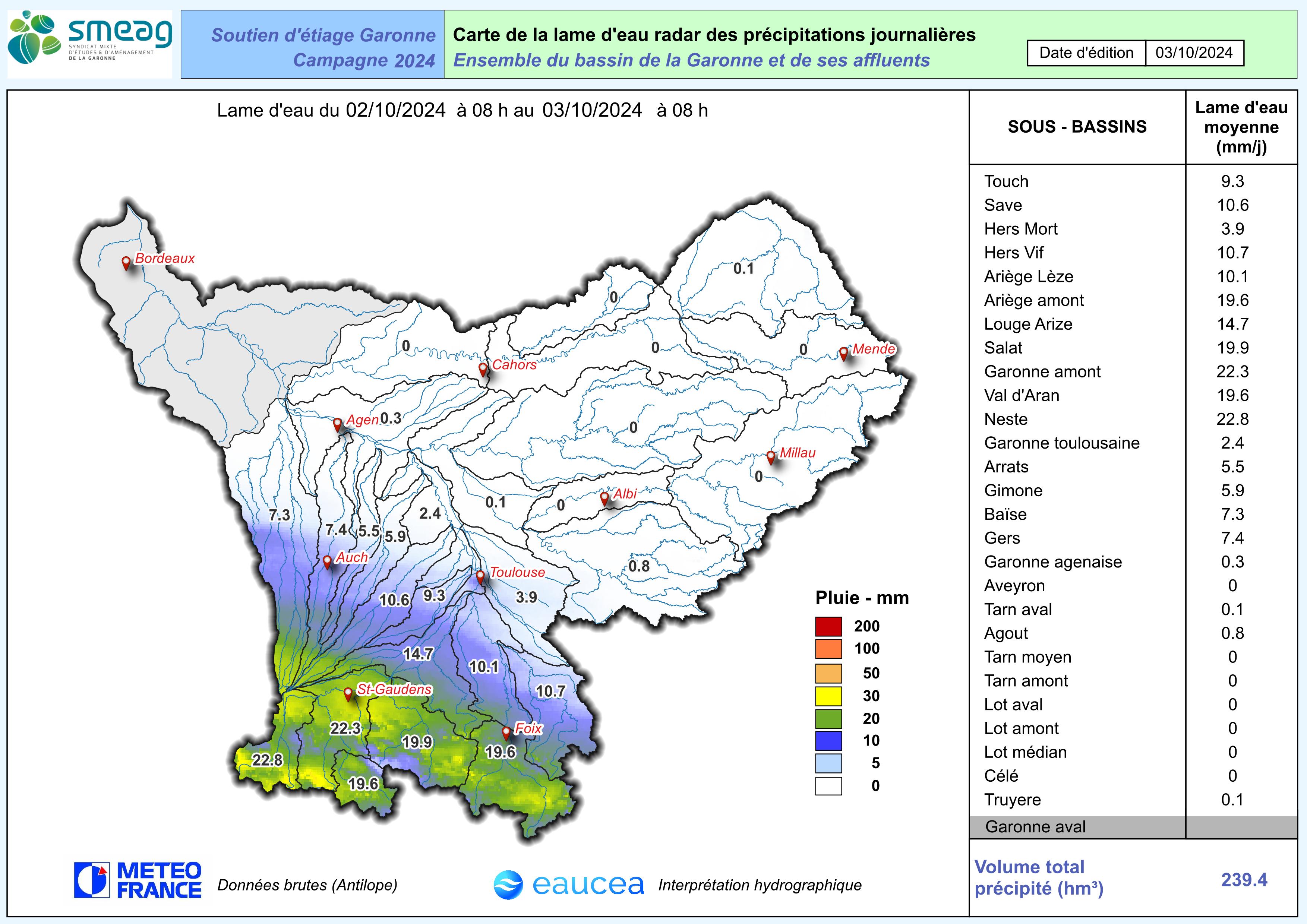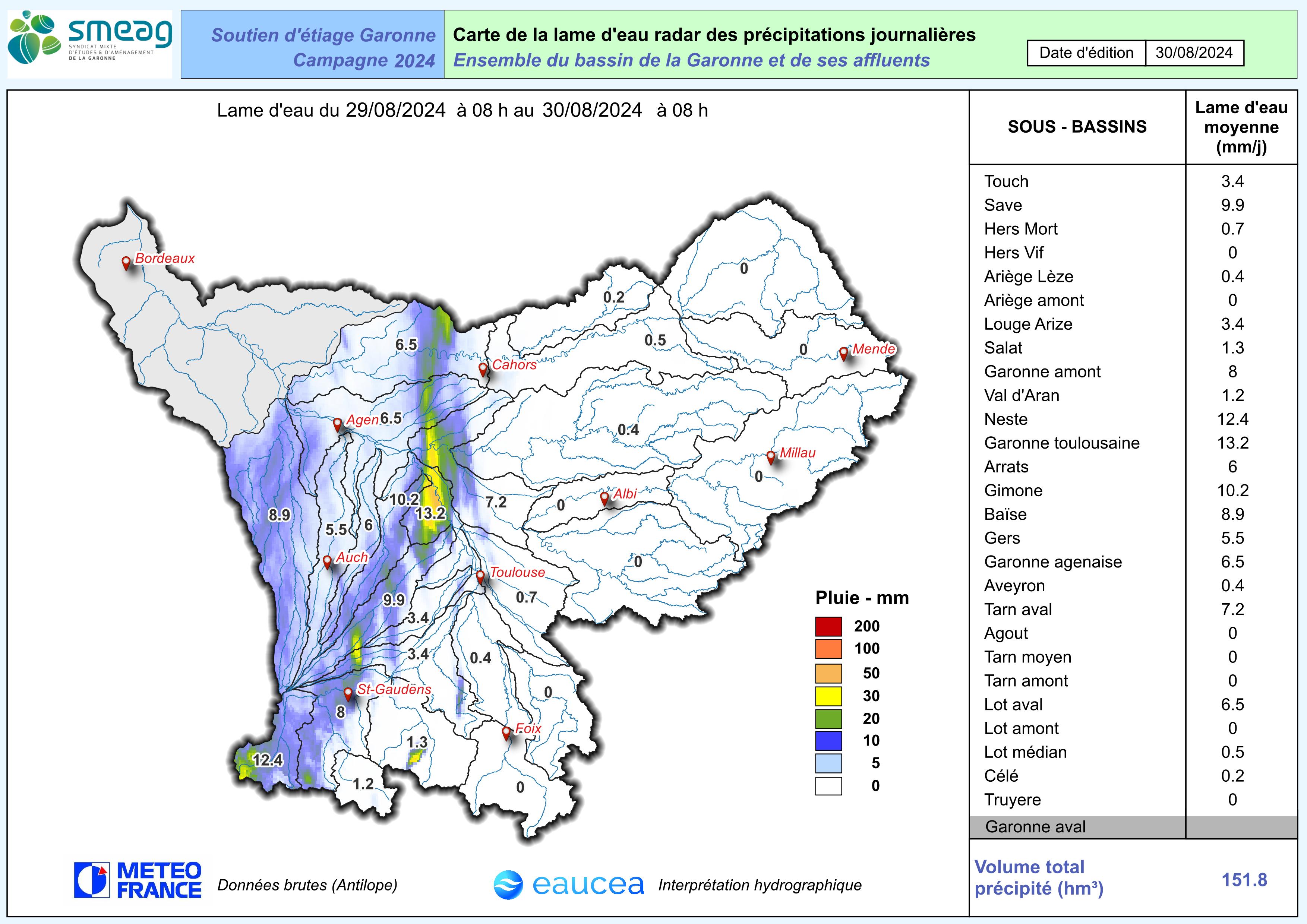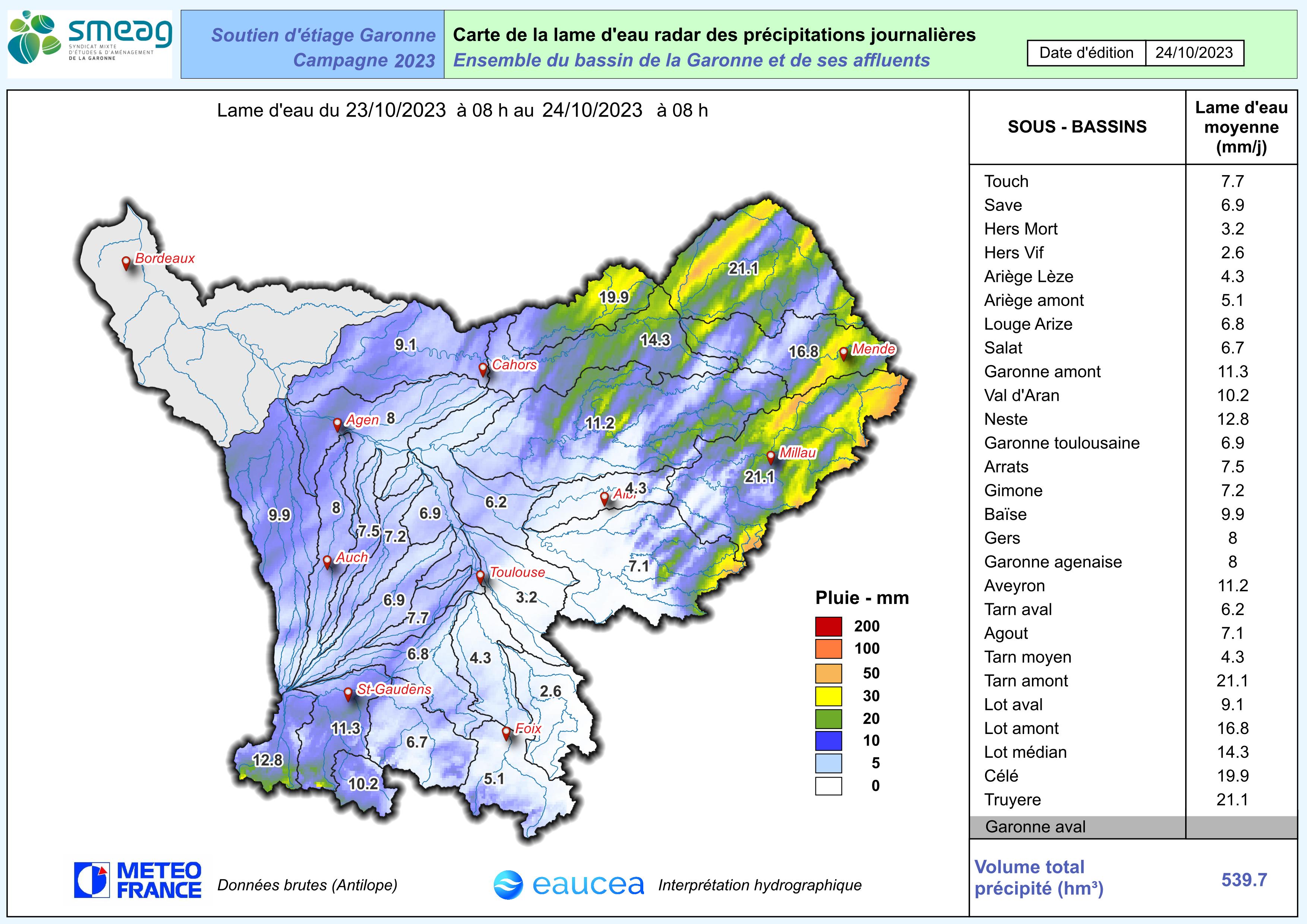 Cette carte illustre les quantités d'eau précipitées sur 24 heures par sous-bassins versants (source : images radar Météo France).
