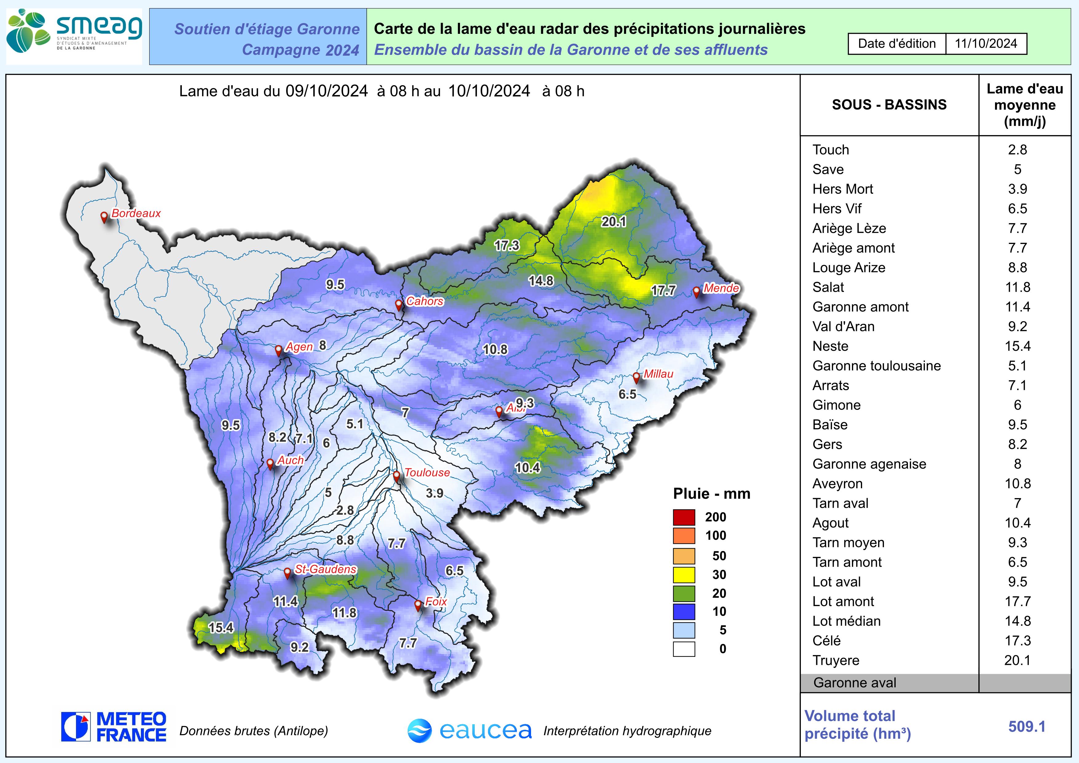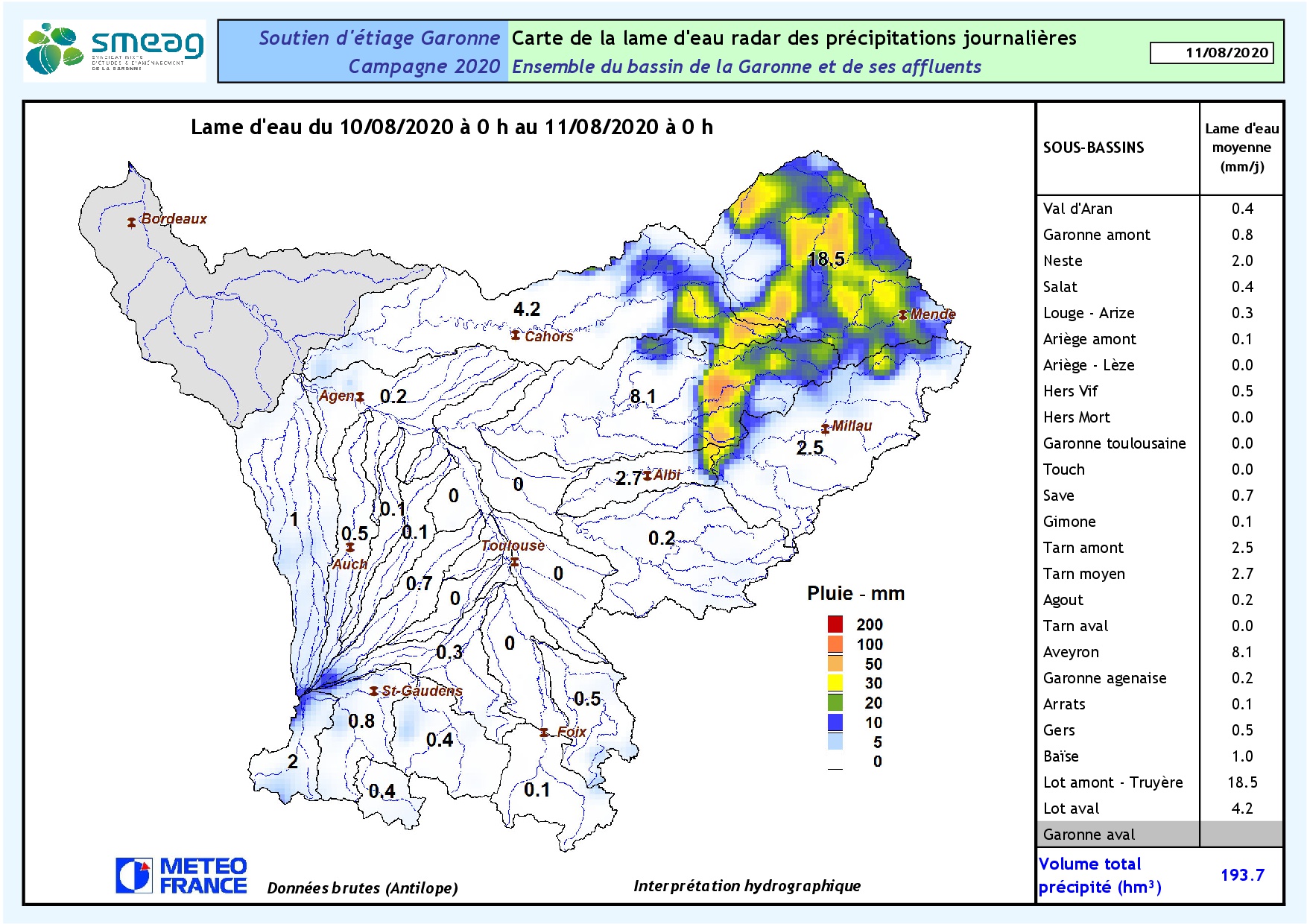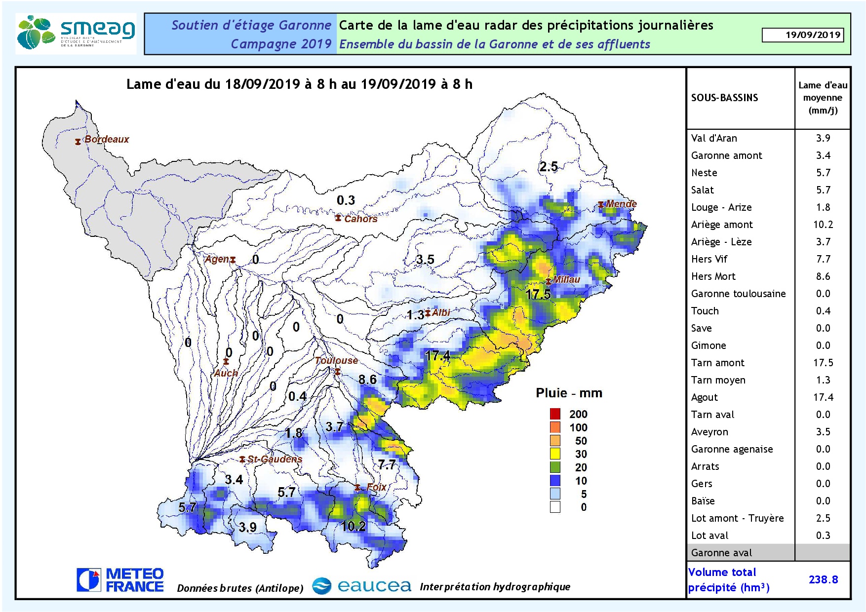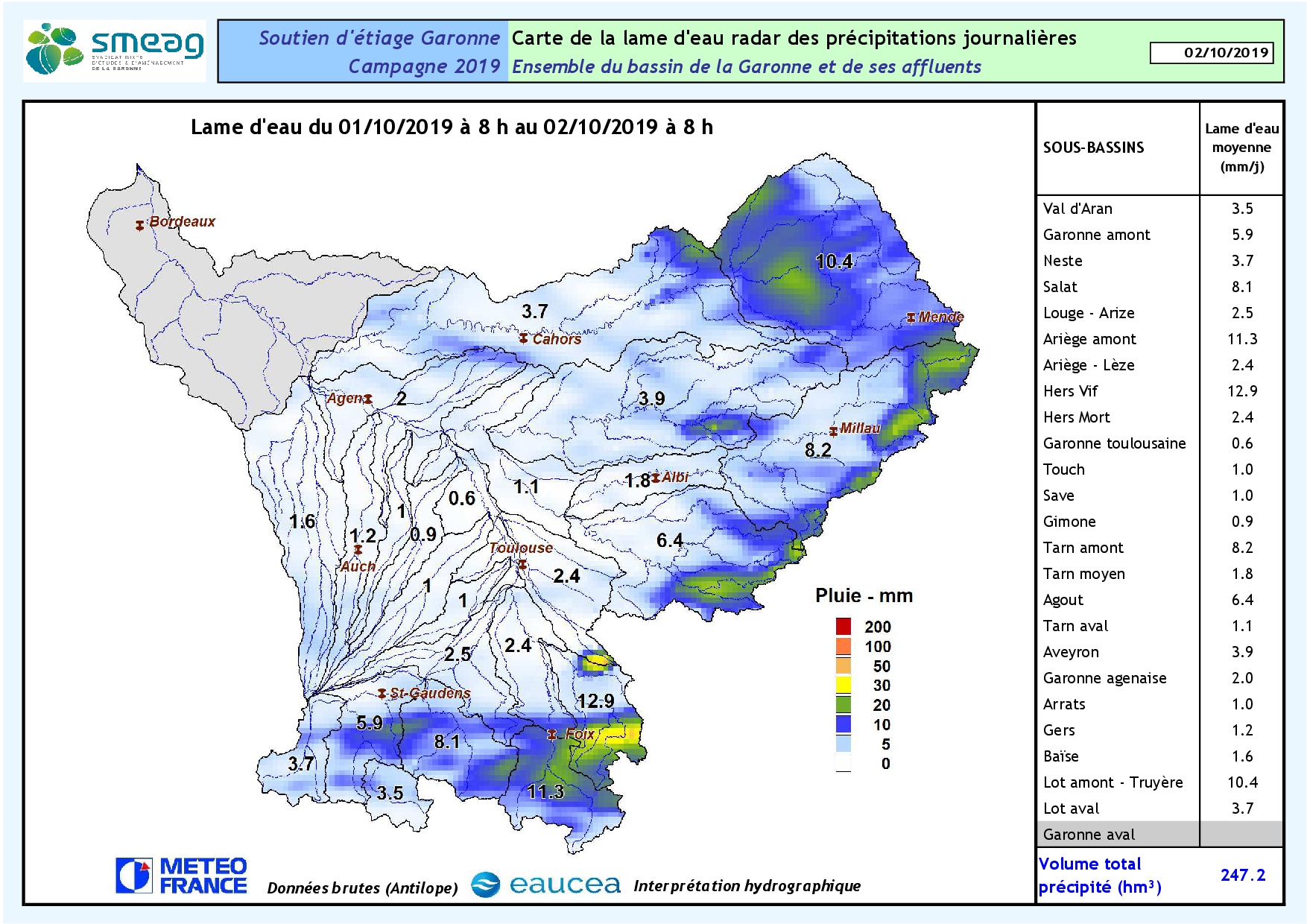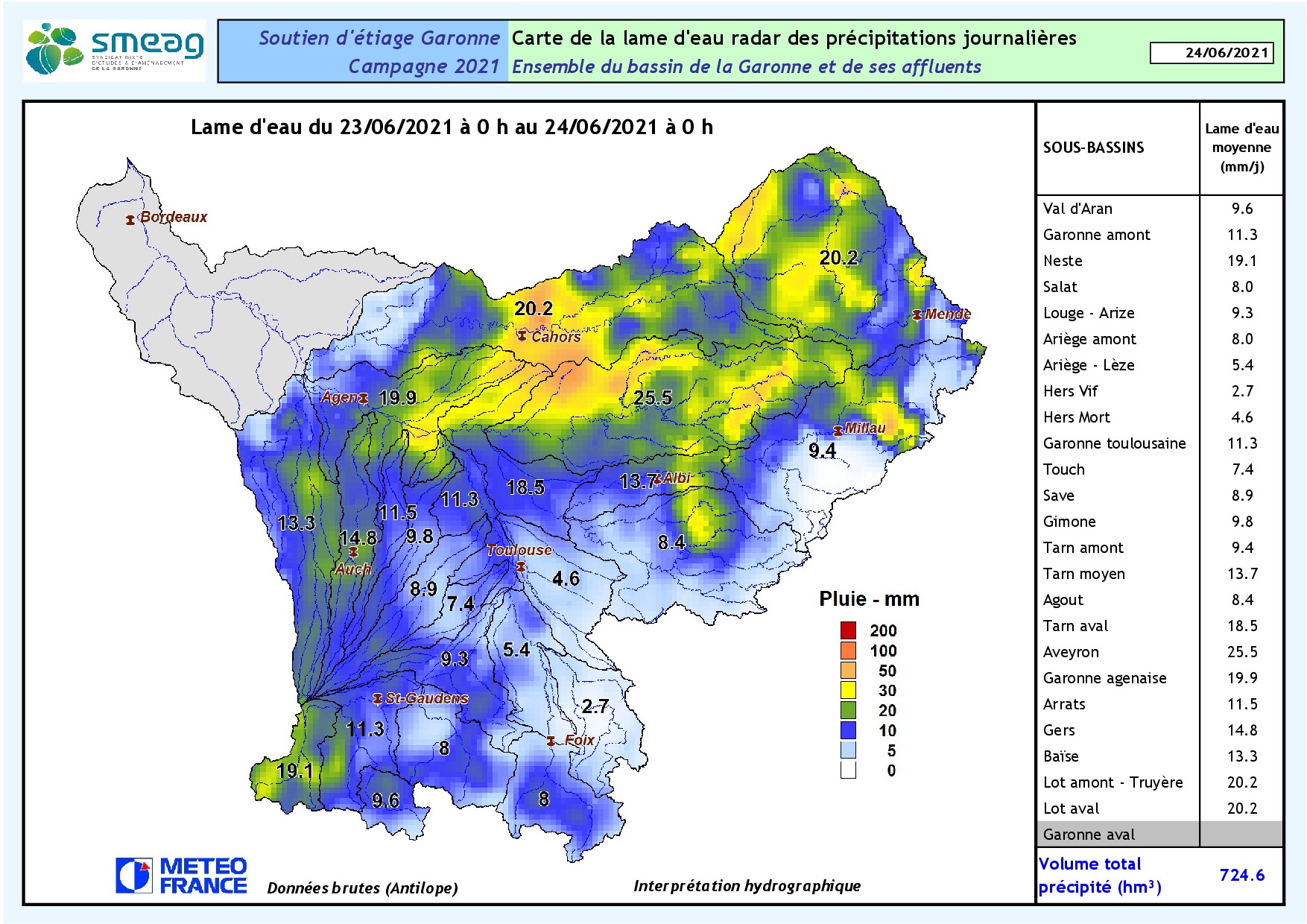 Cette carte illustre les quantités d'eau précipitées sur 24 heures par sous-bassins versants (source : images radar Météo France).