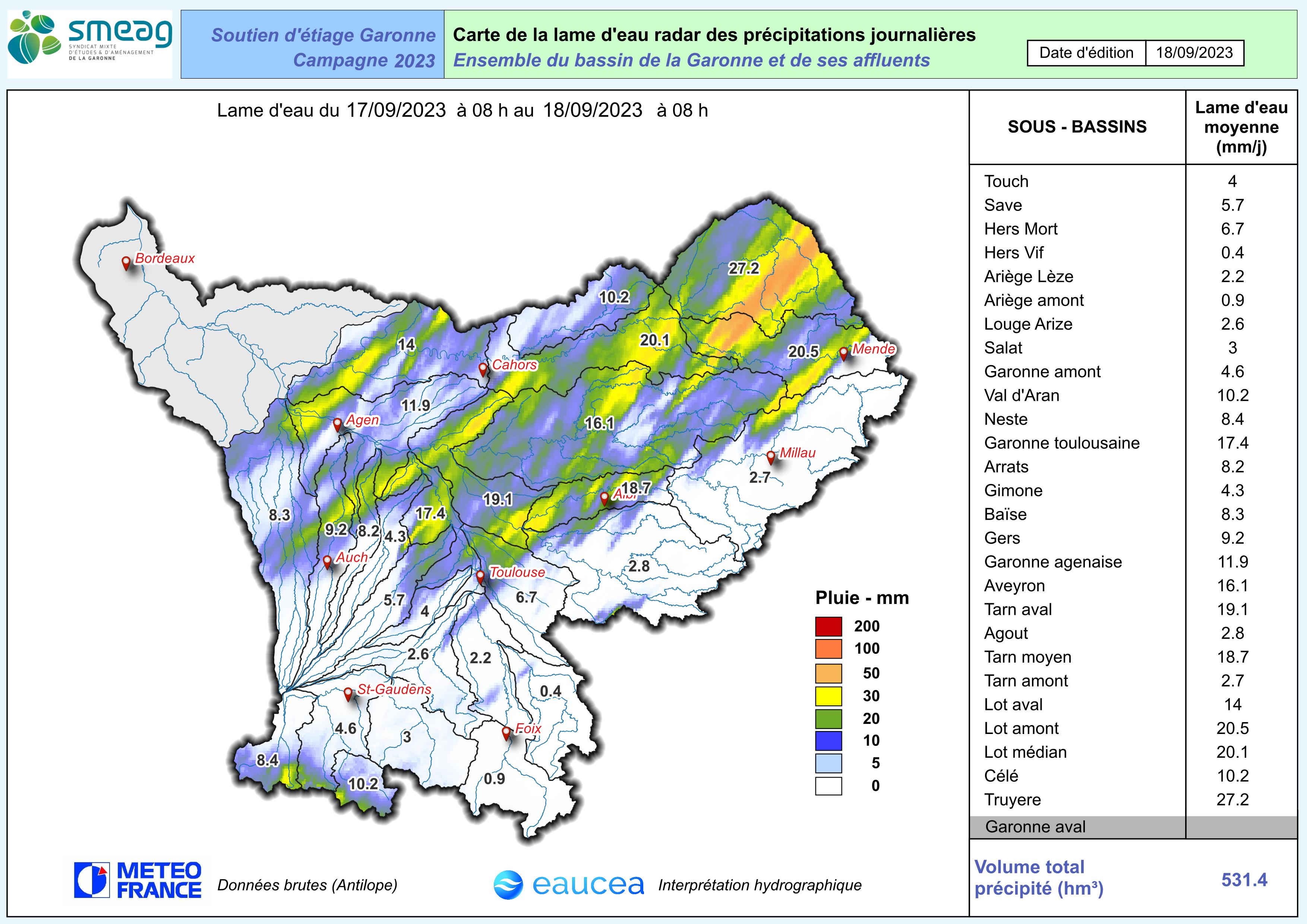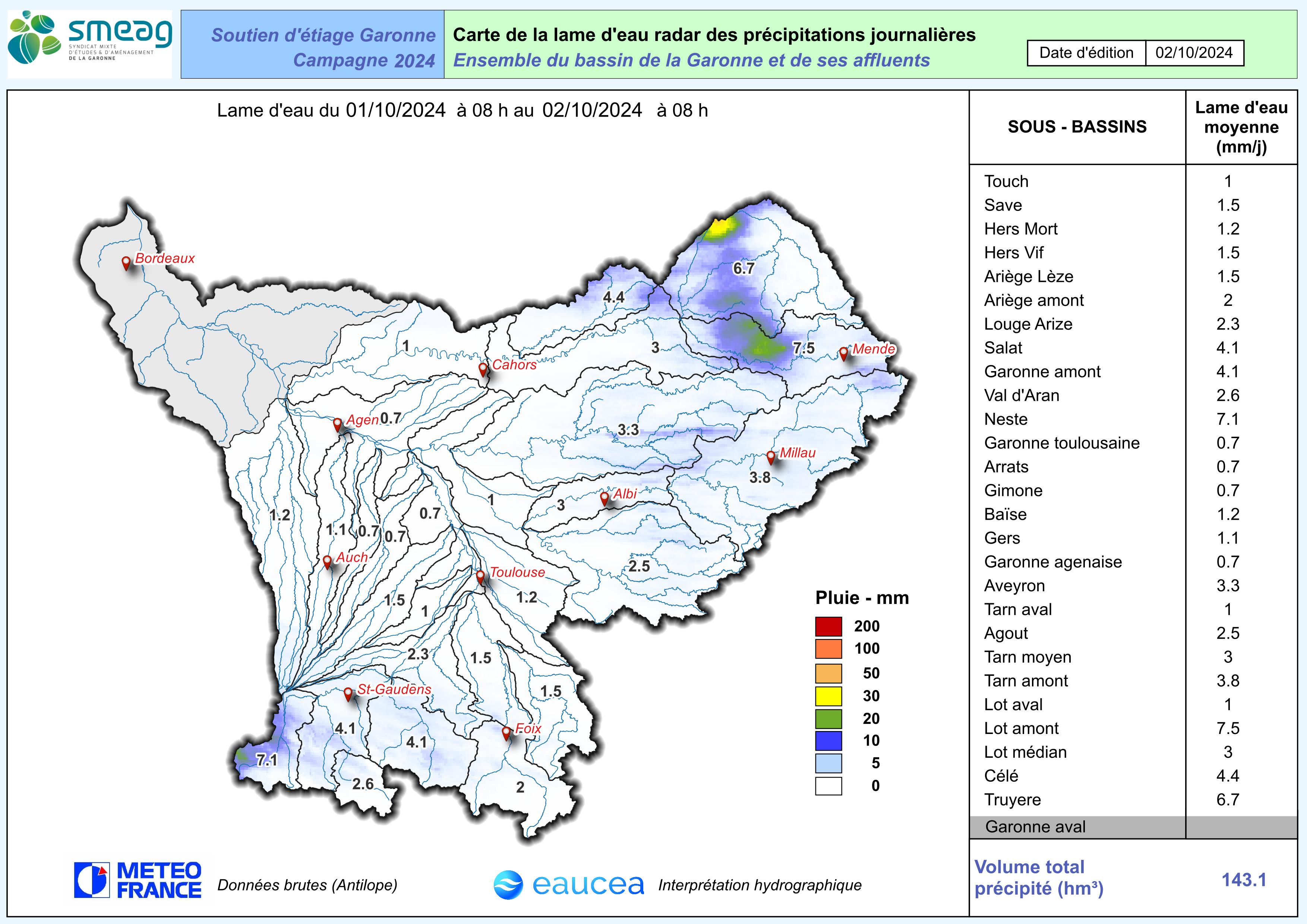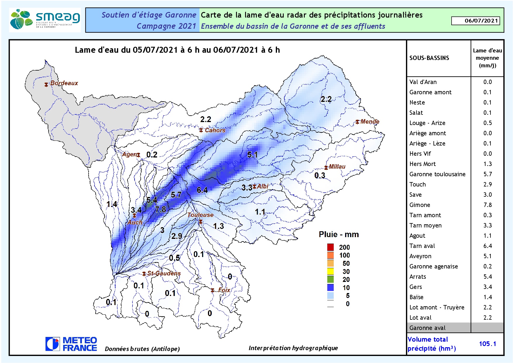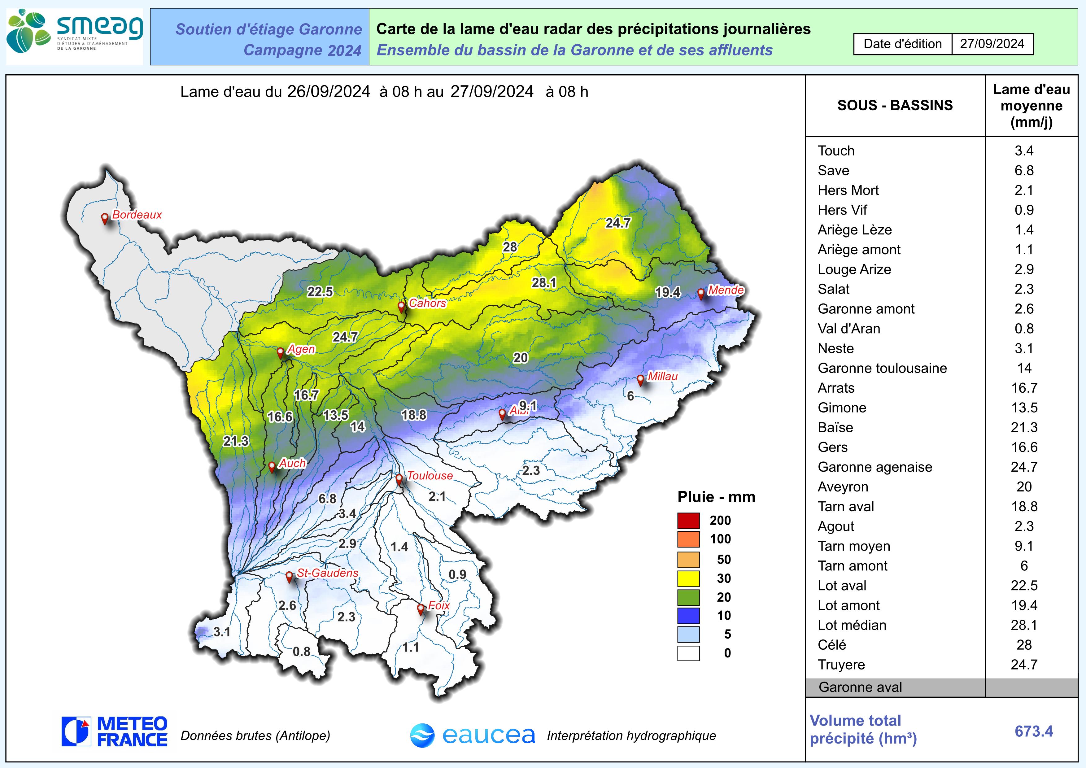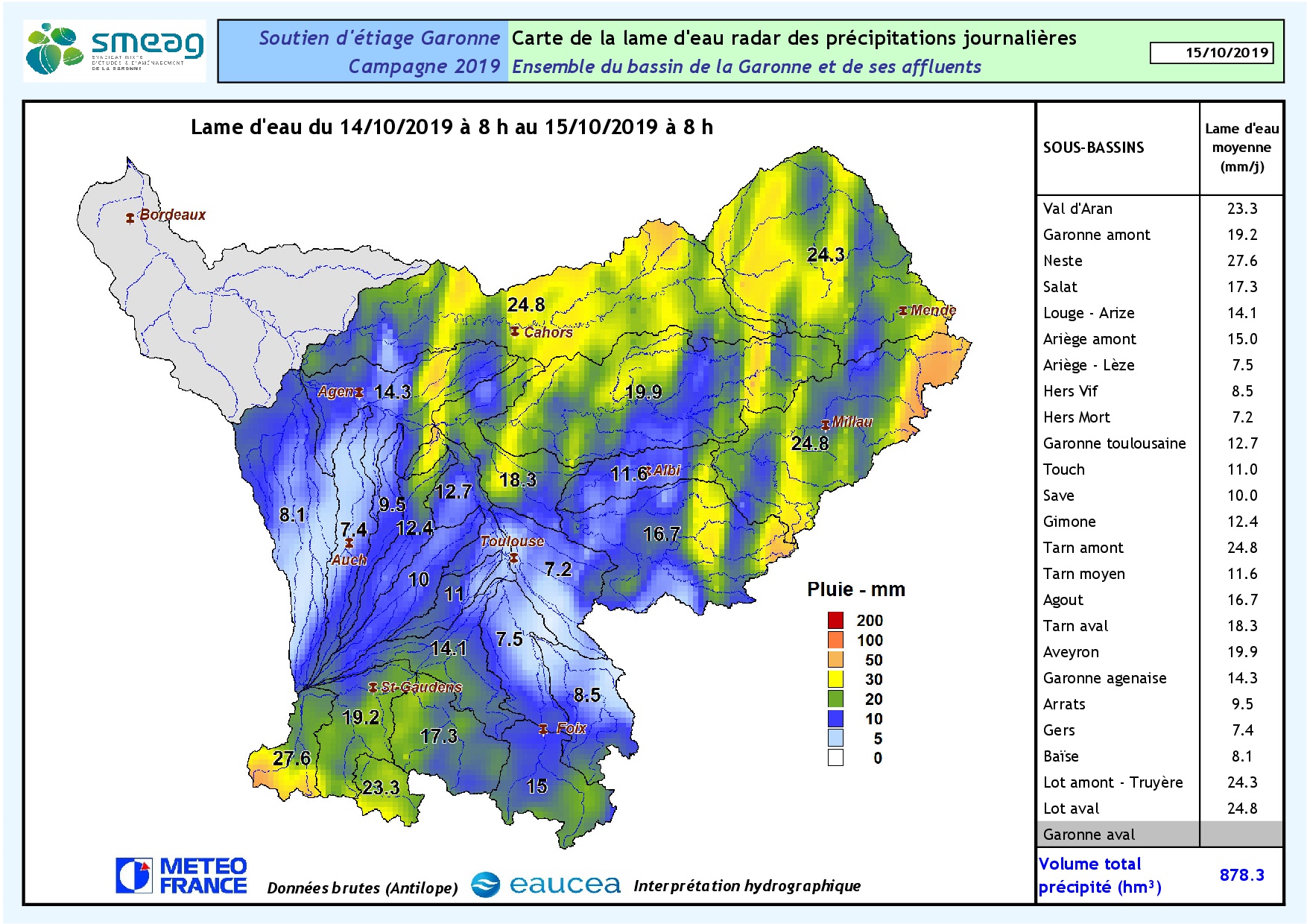 Cette carte illustre les quantités d'eau précipitées sur 24 heures par sous-bassins versants (source : images radar Météo France).