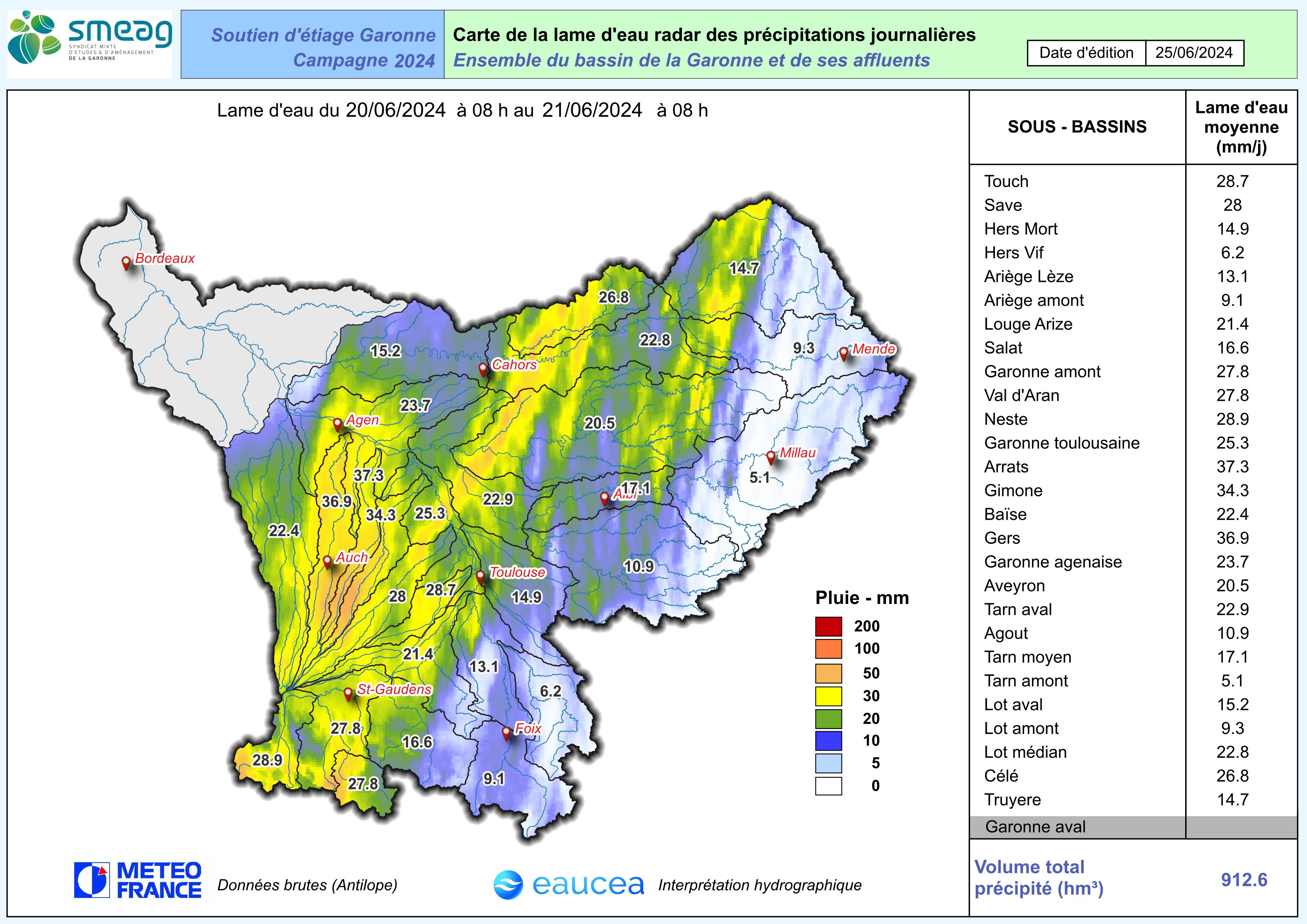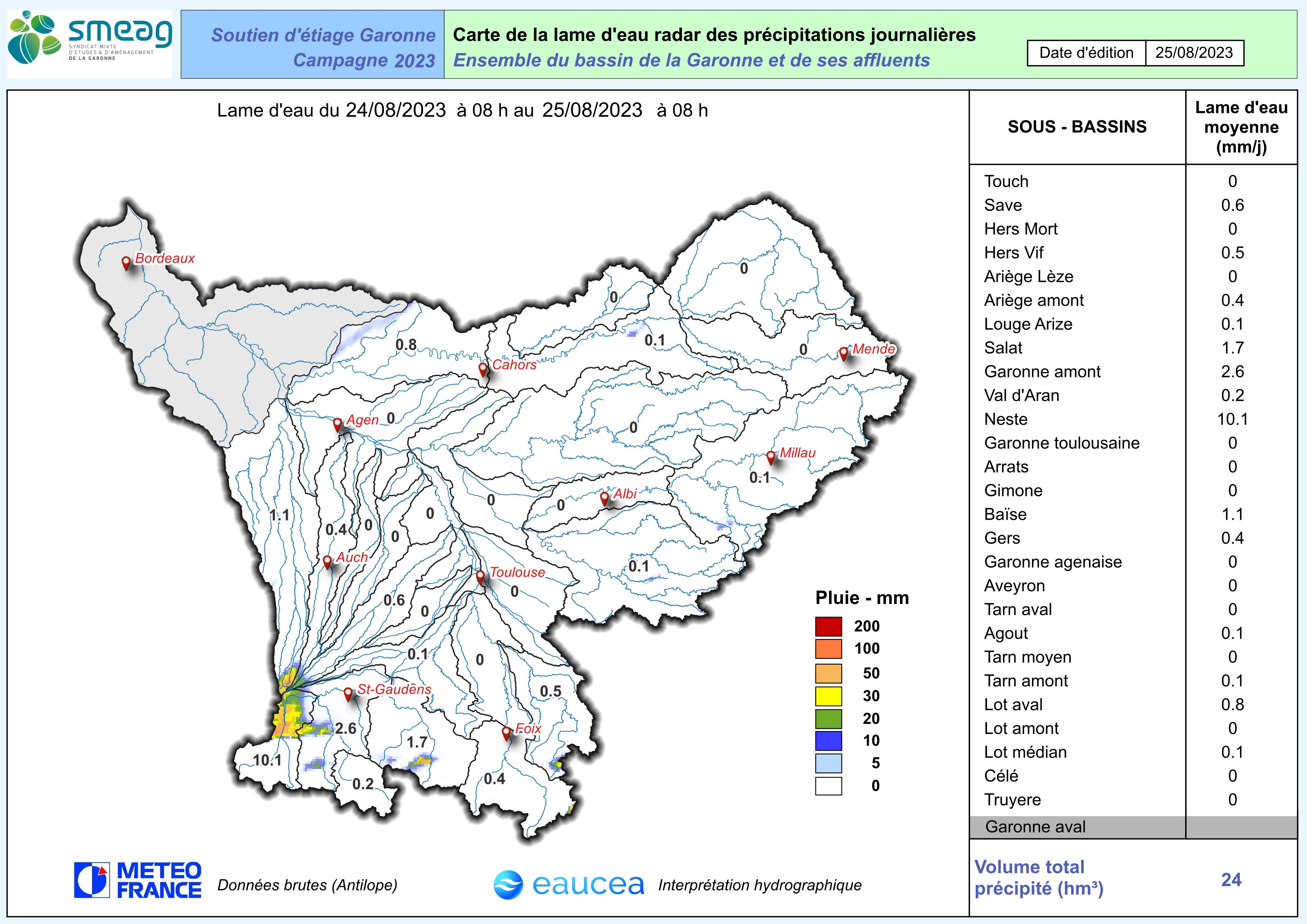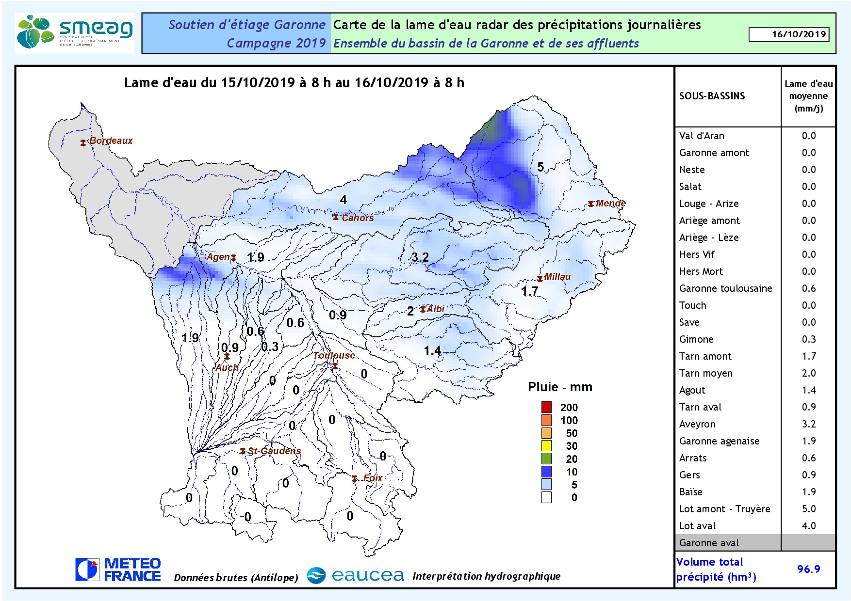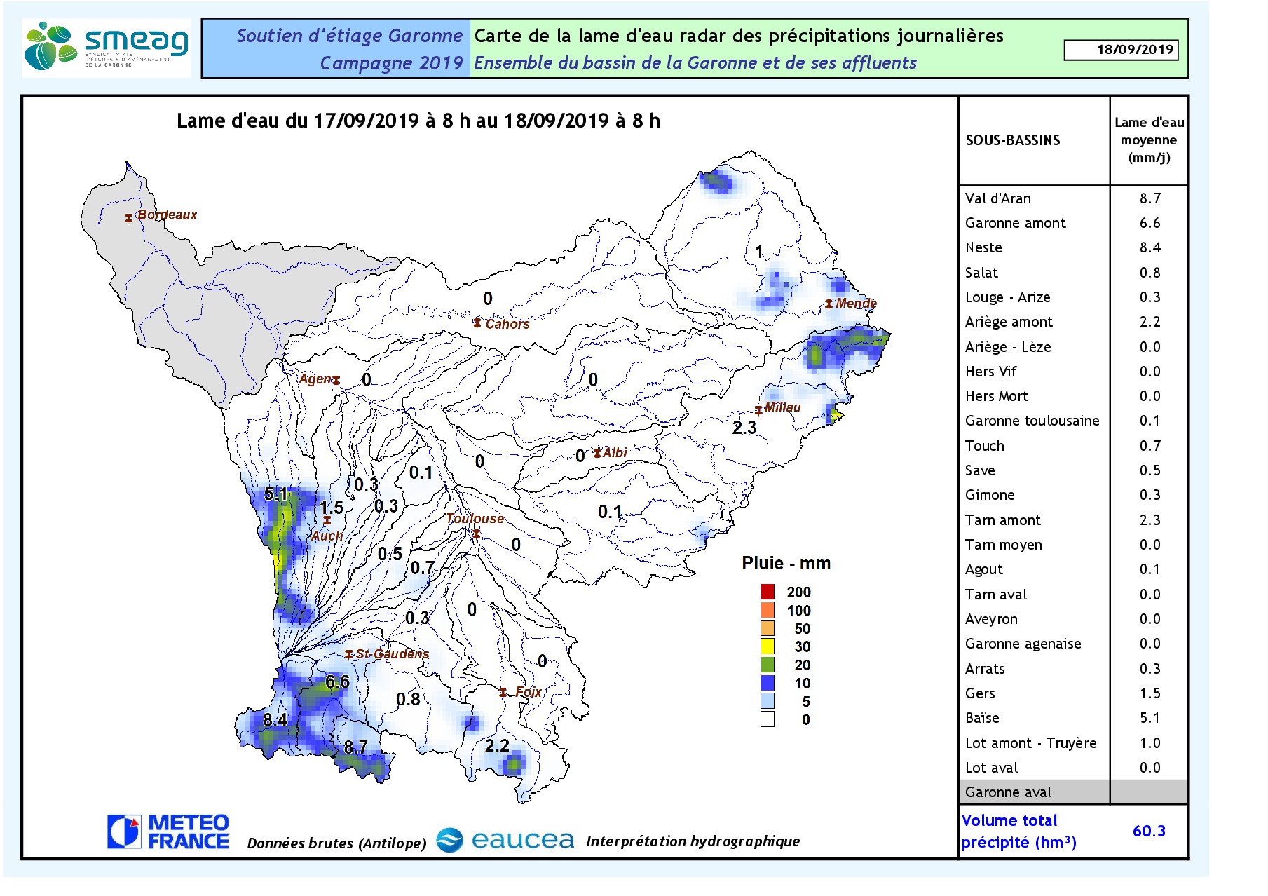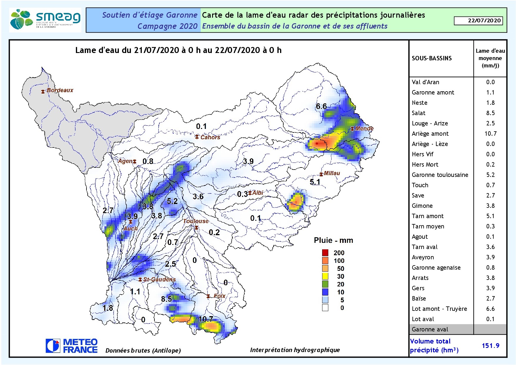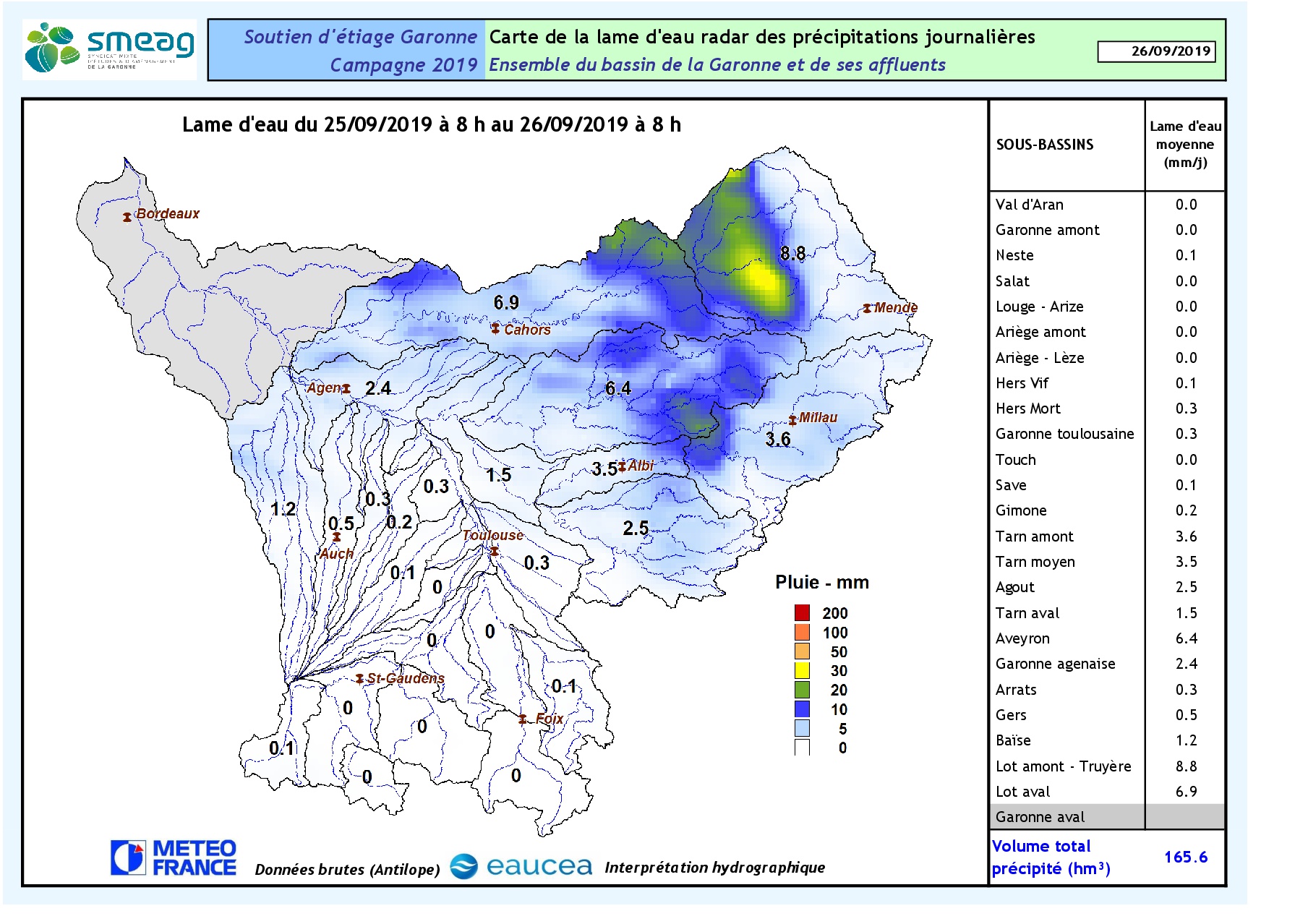 Cette carte illustre les quantités d'eau précipitées sur 24 heures par sous-bassins versants (source : images radar Météo France).