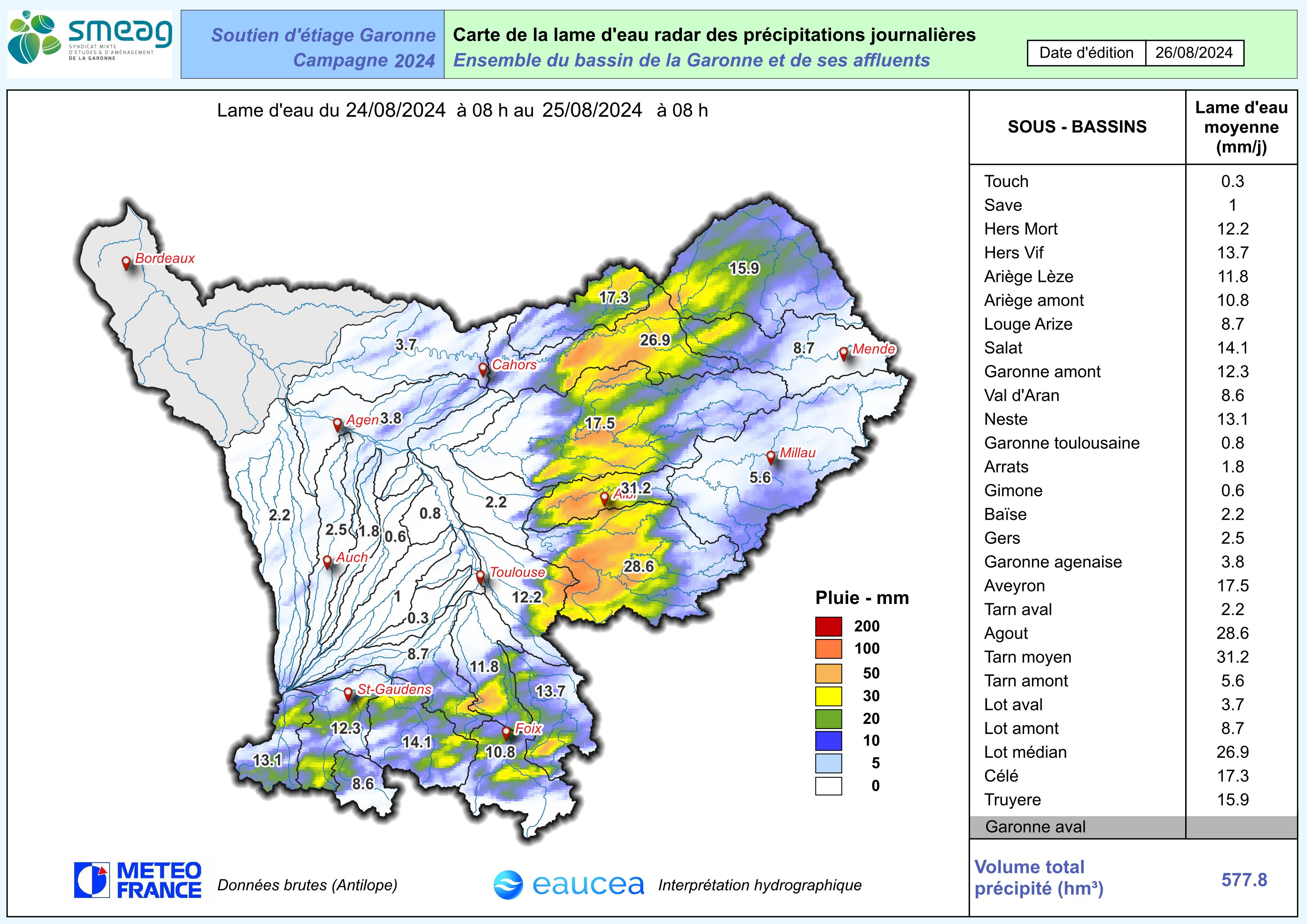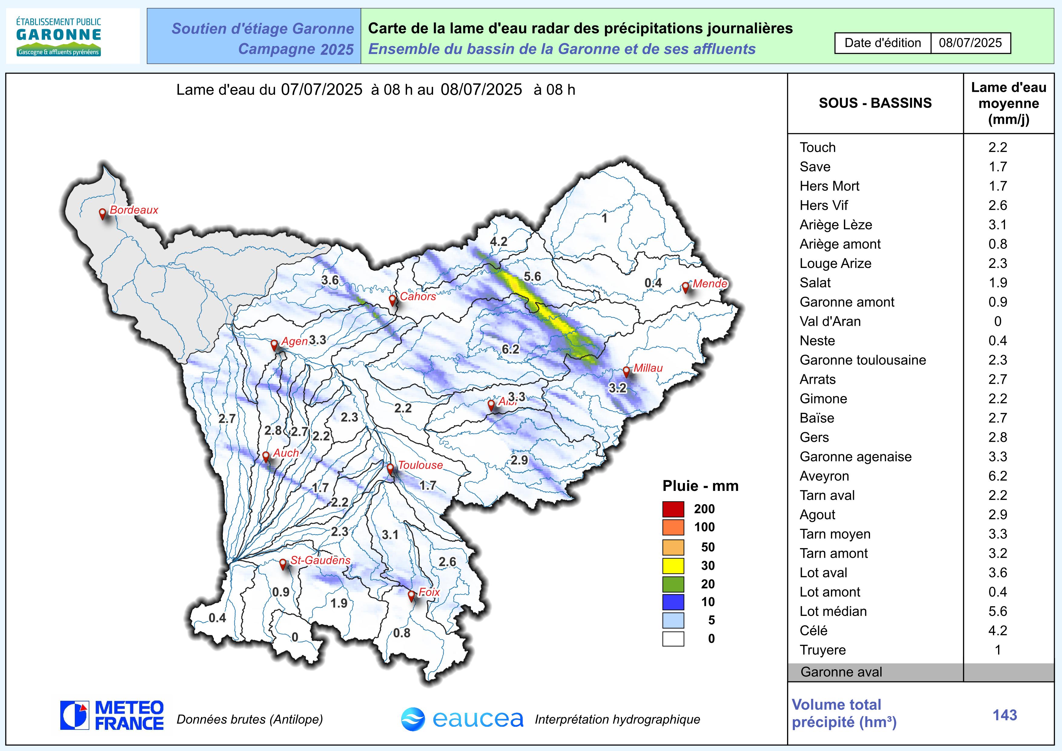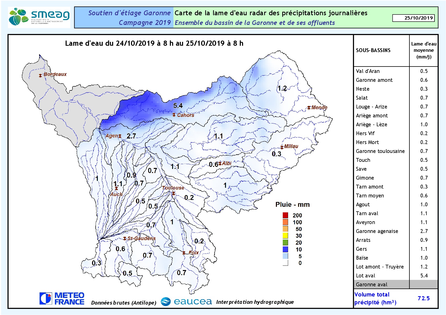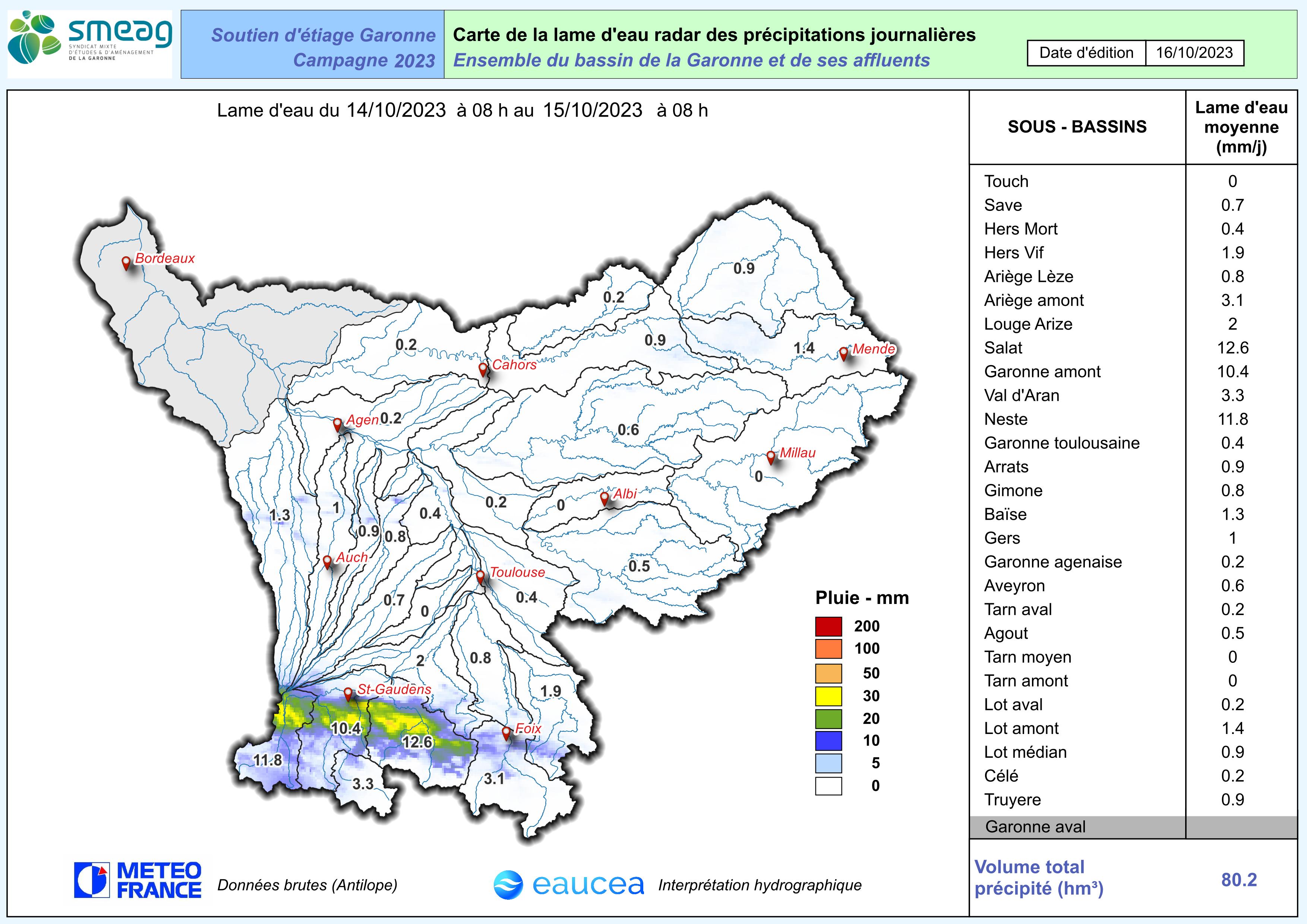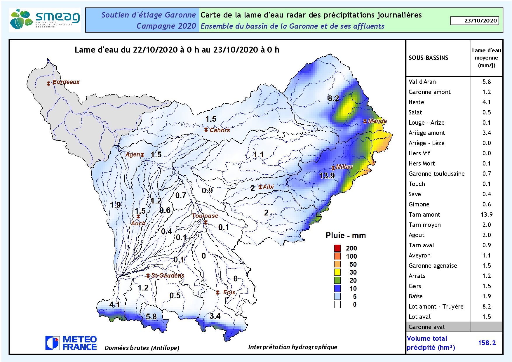 Cette carte illustre les quantités d'eau précipitées sur 24 heures par sous-bassins versants (source : images radar Météo France).