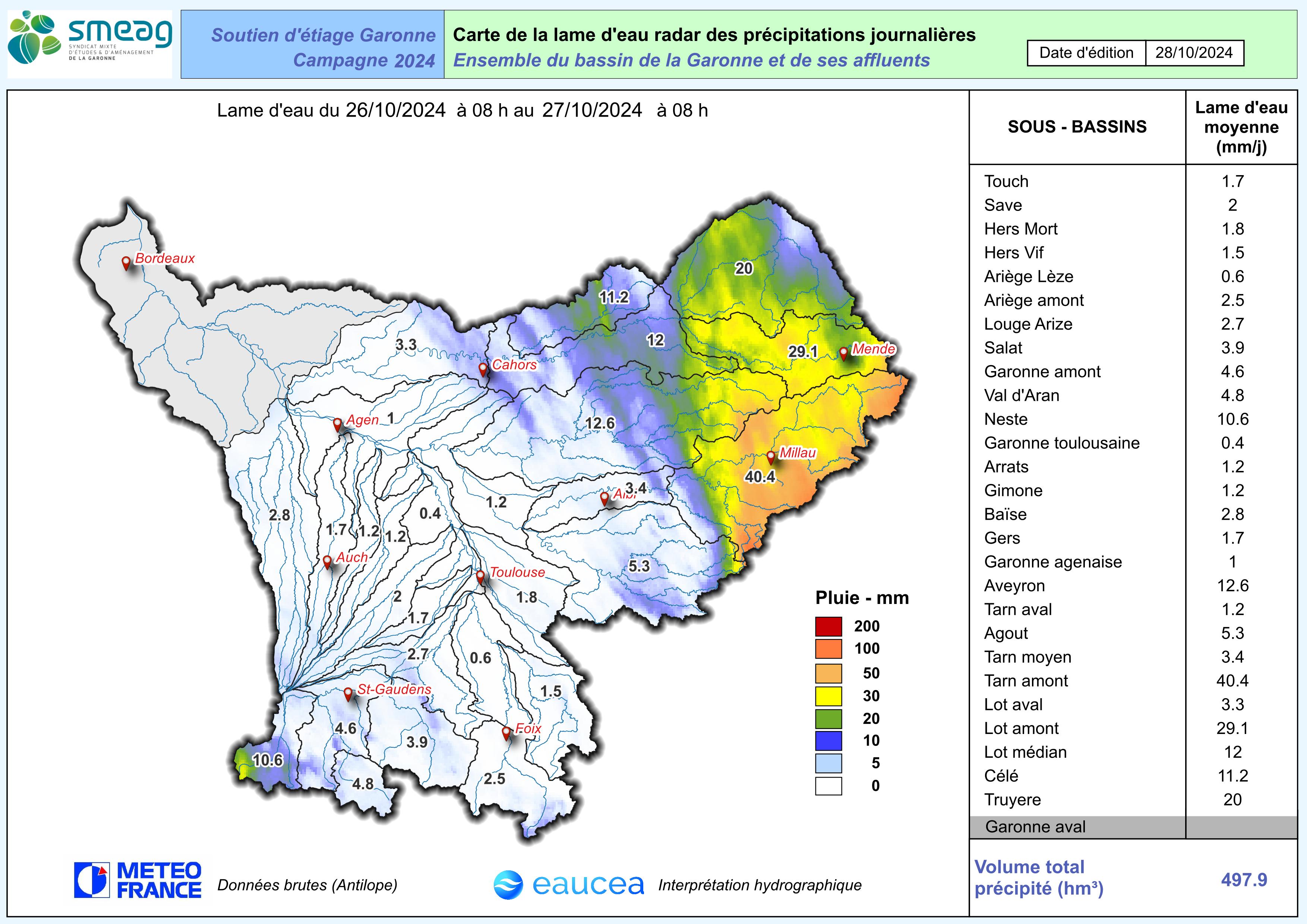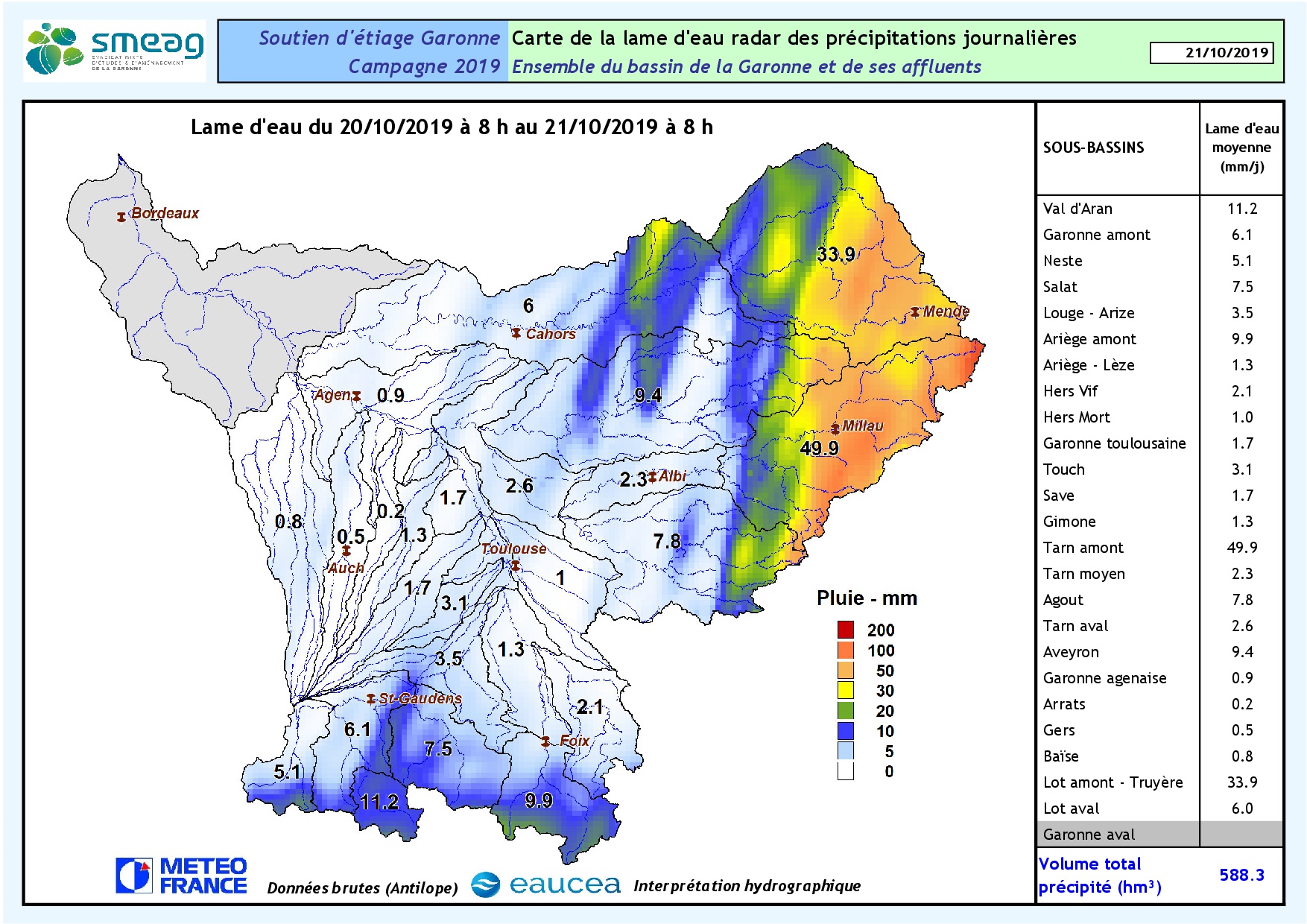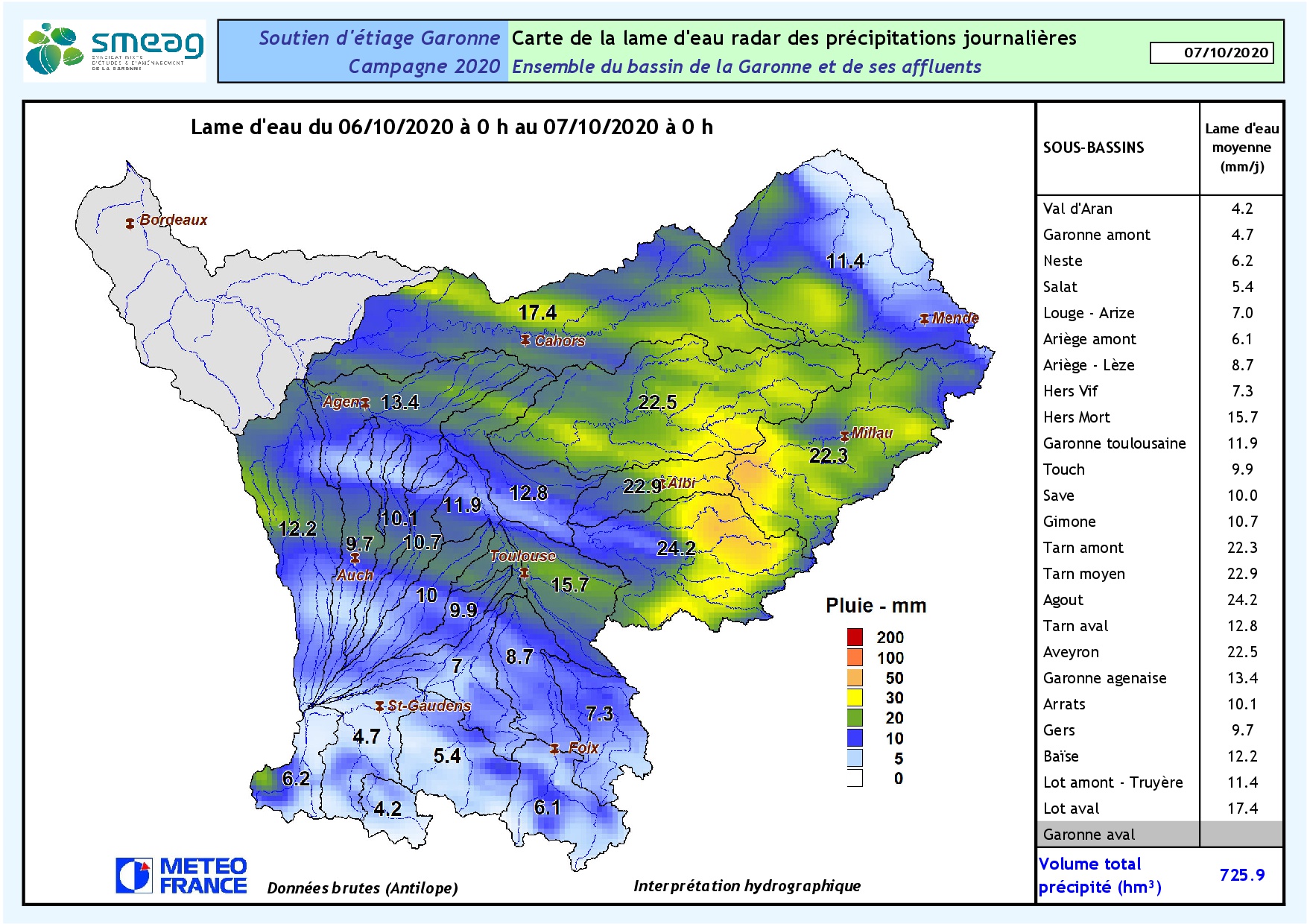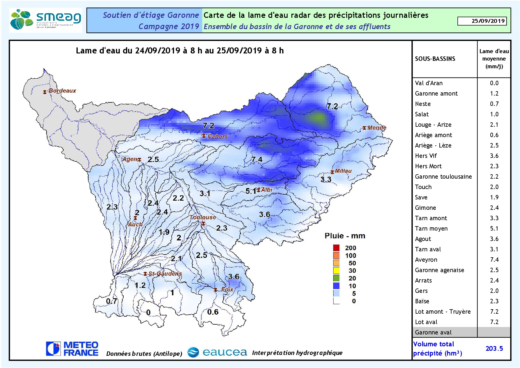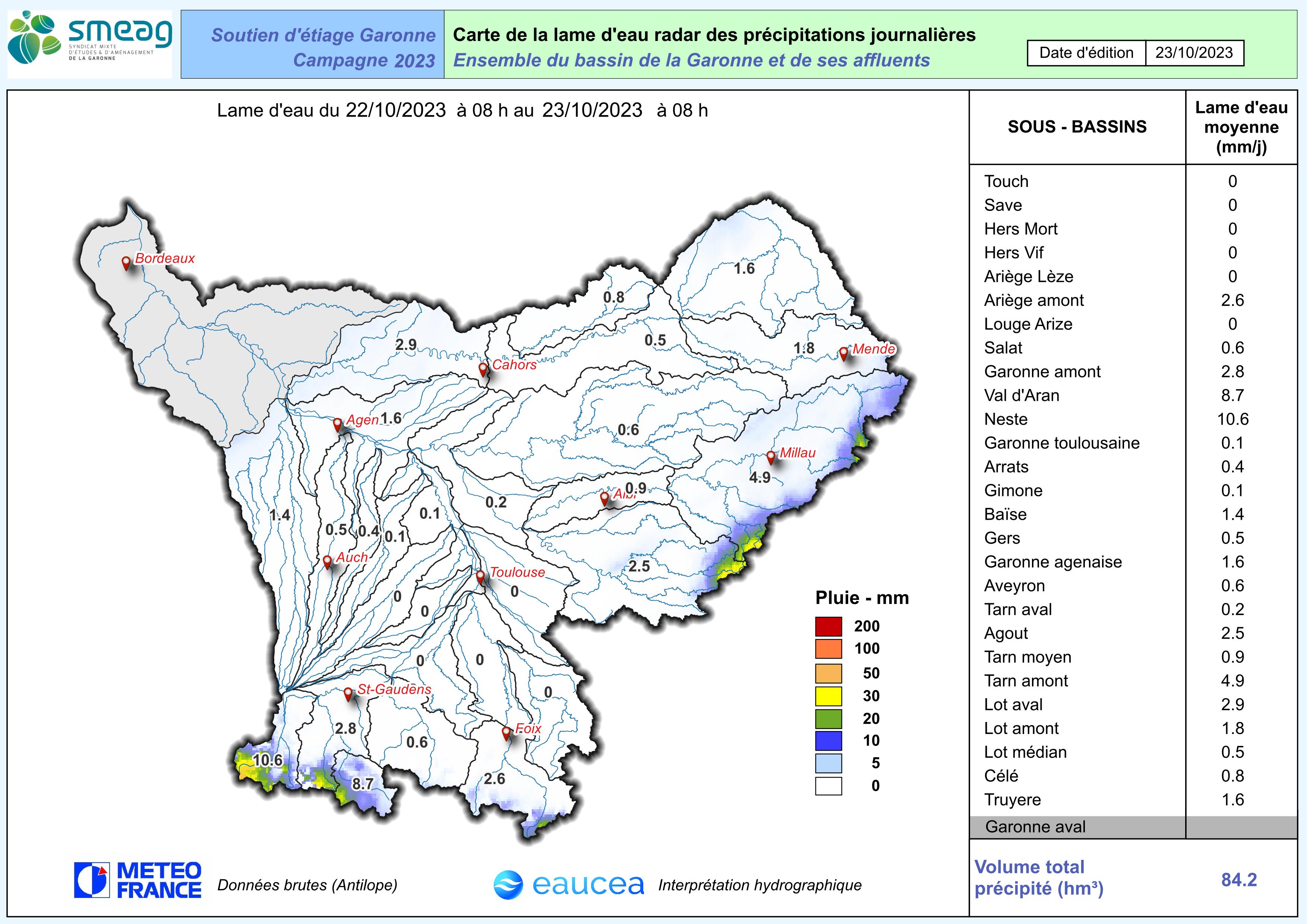 Cette carte illustre les quantités d'eau précipitées sur 24 heures par sous-bassins versants (source : images radar Météo France).