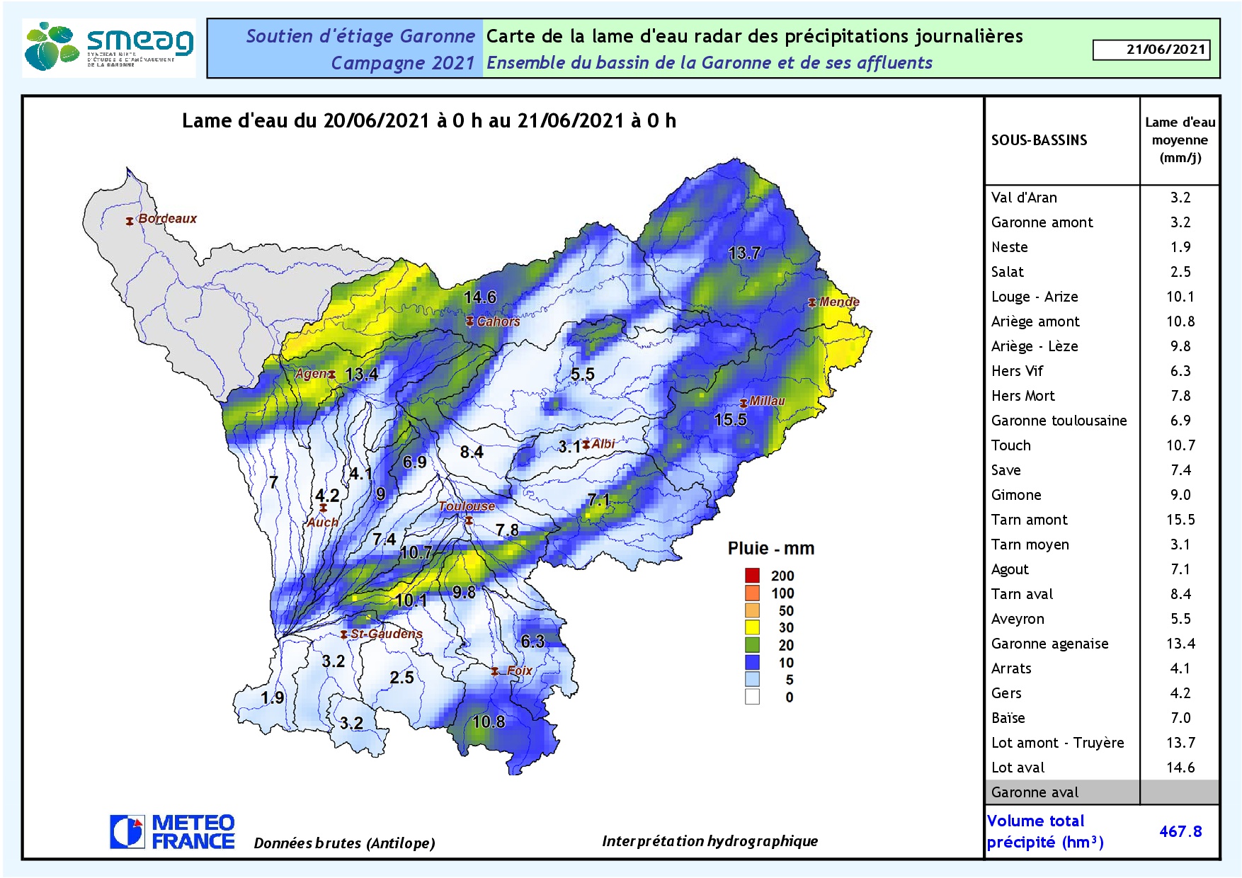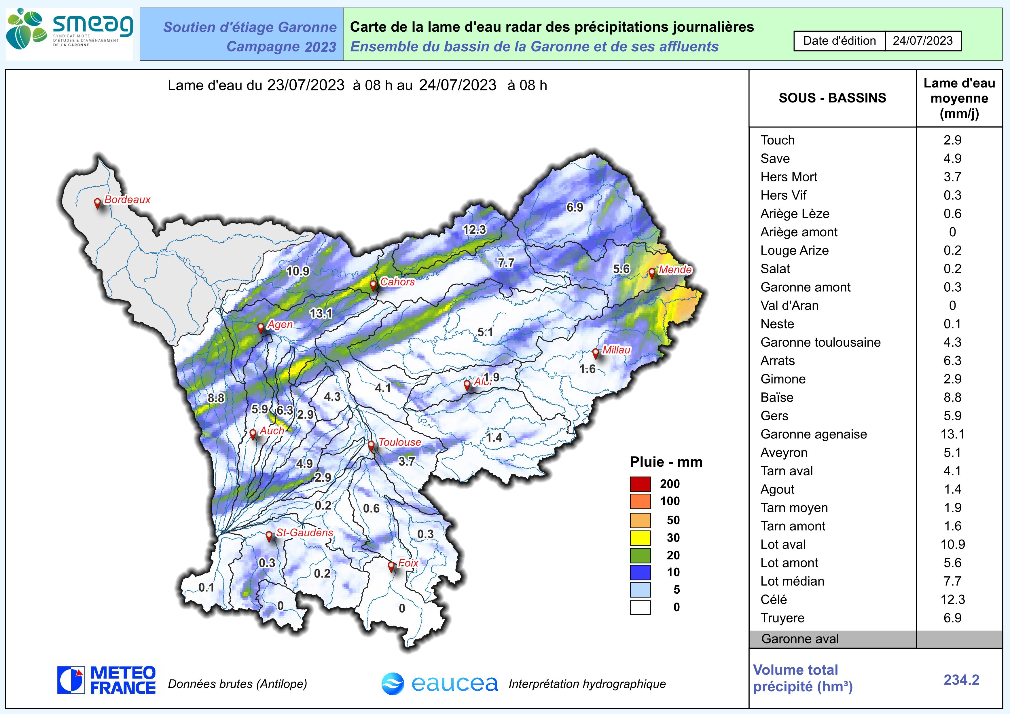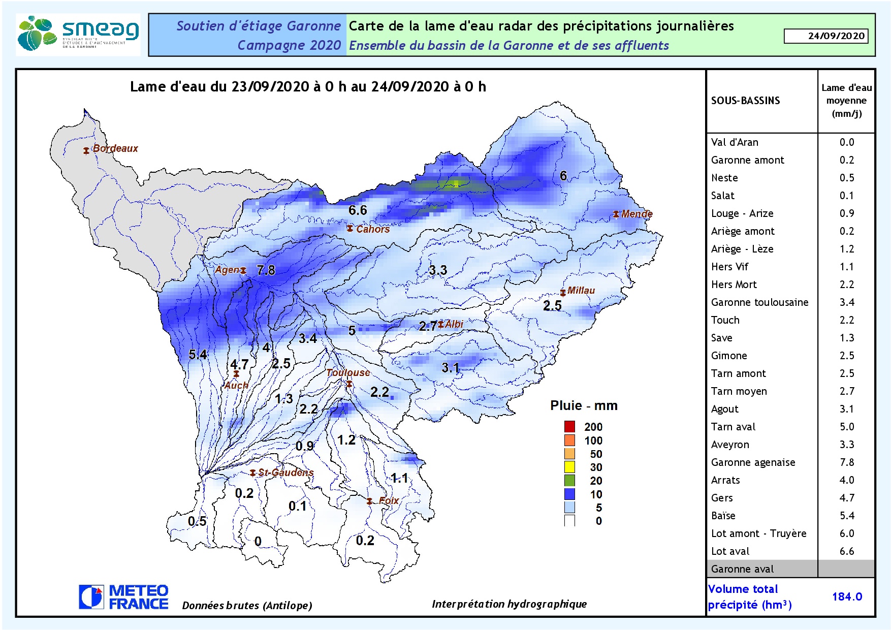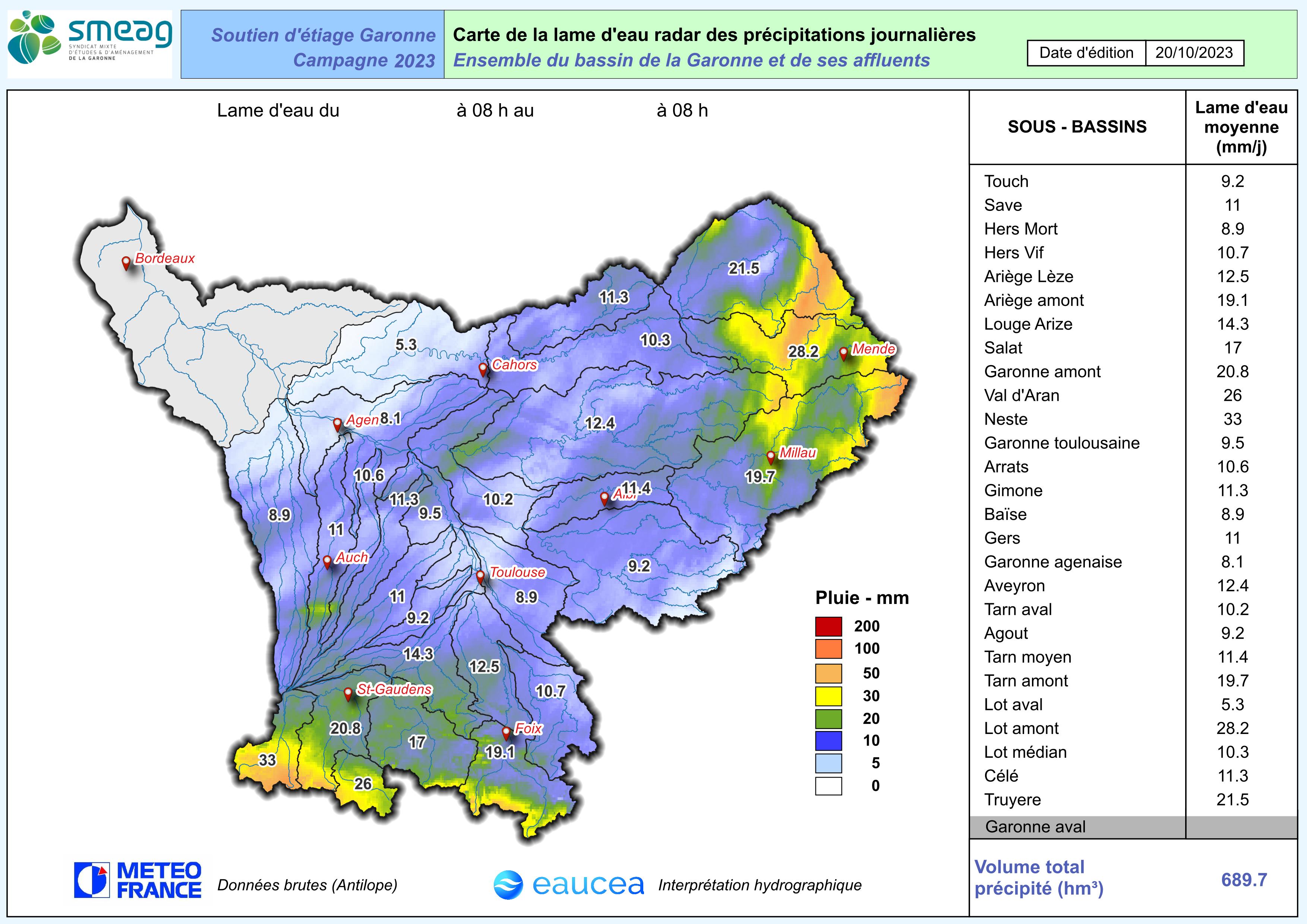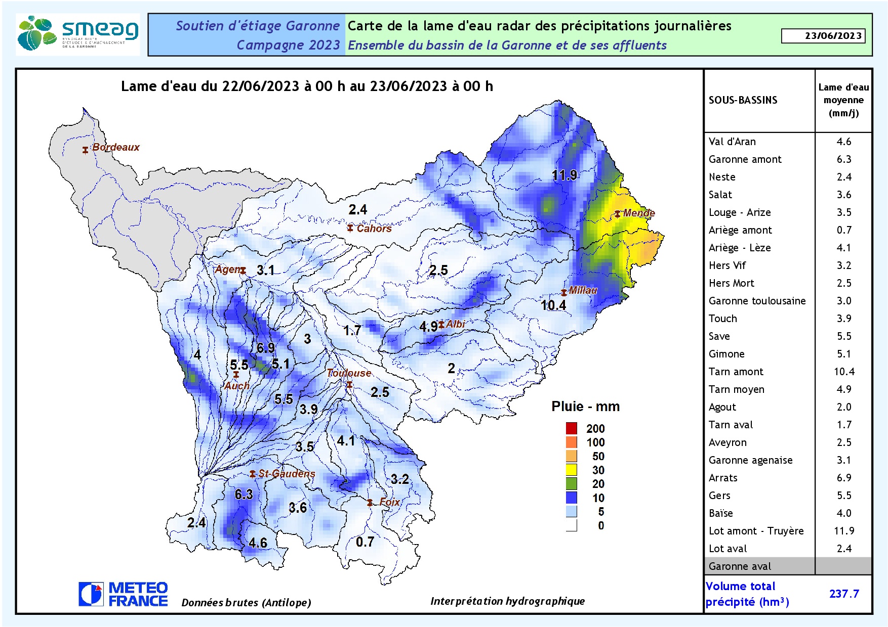 Cette carte illustre les quantités d'eau précipitées sur 24 heures par sous-bassins versants (source : images radar Météo France).