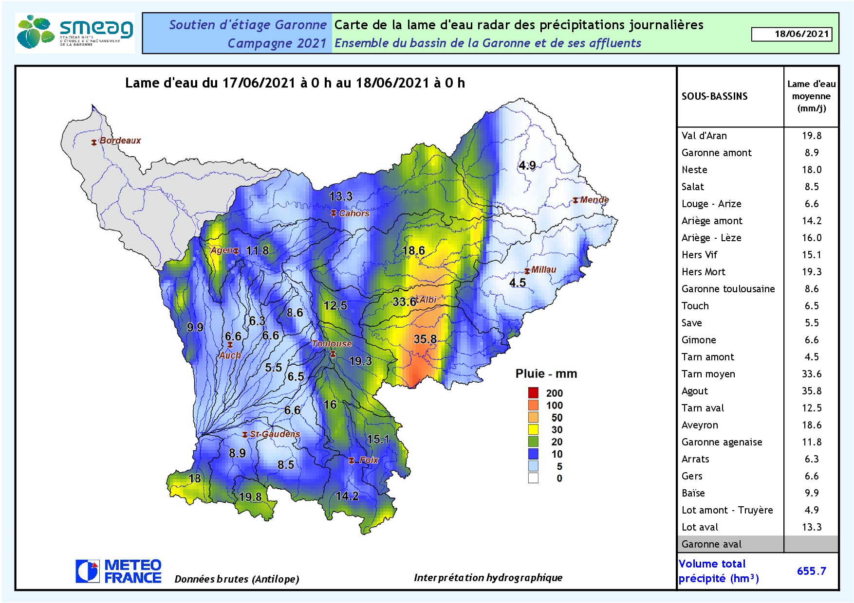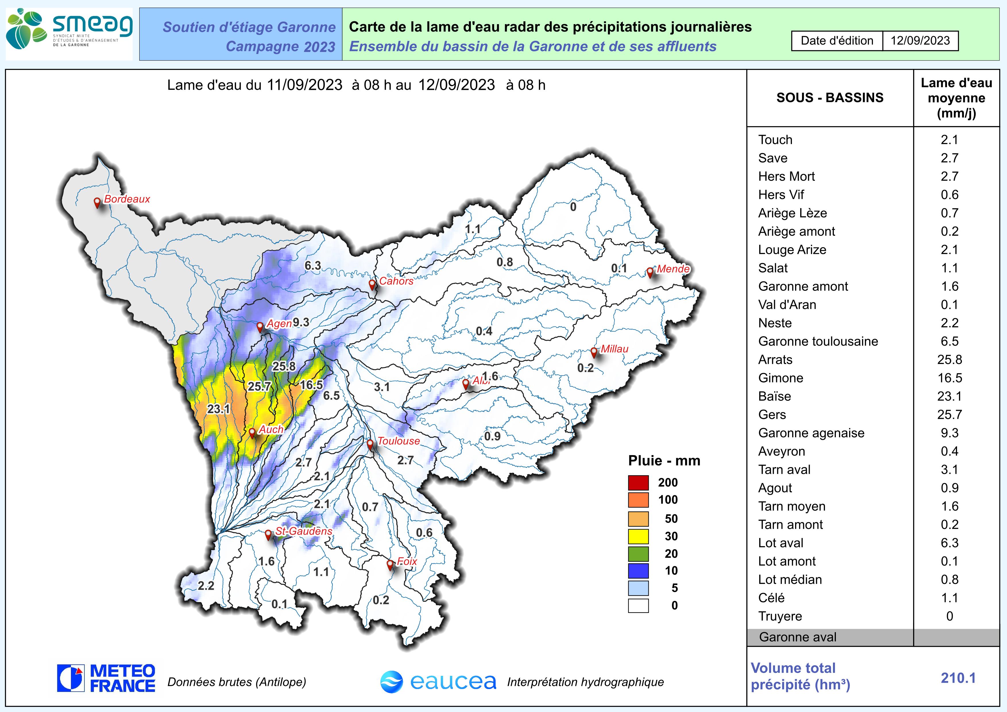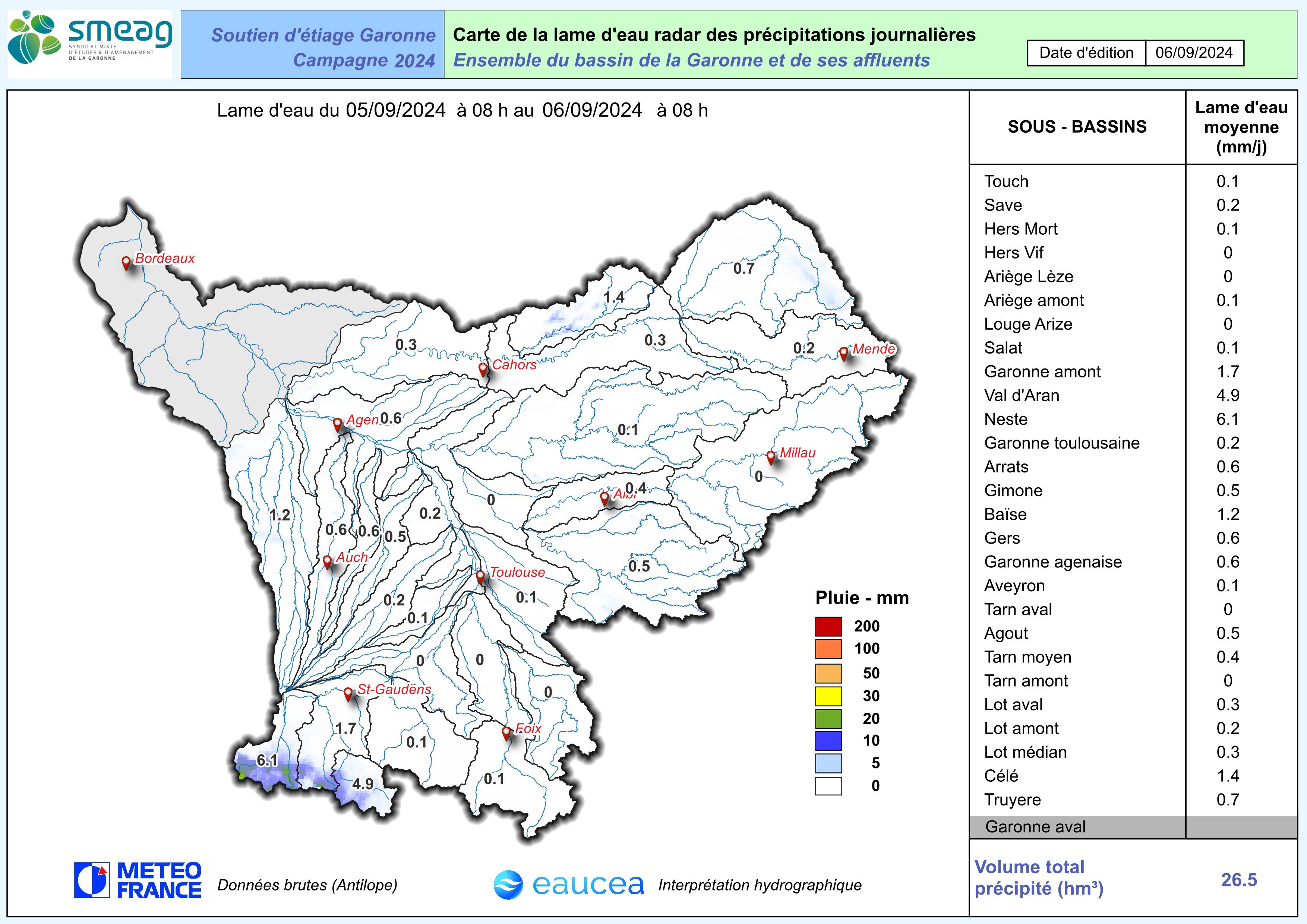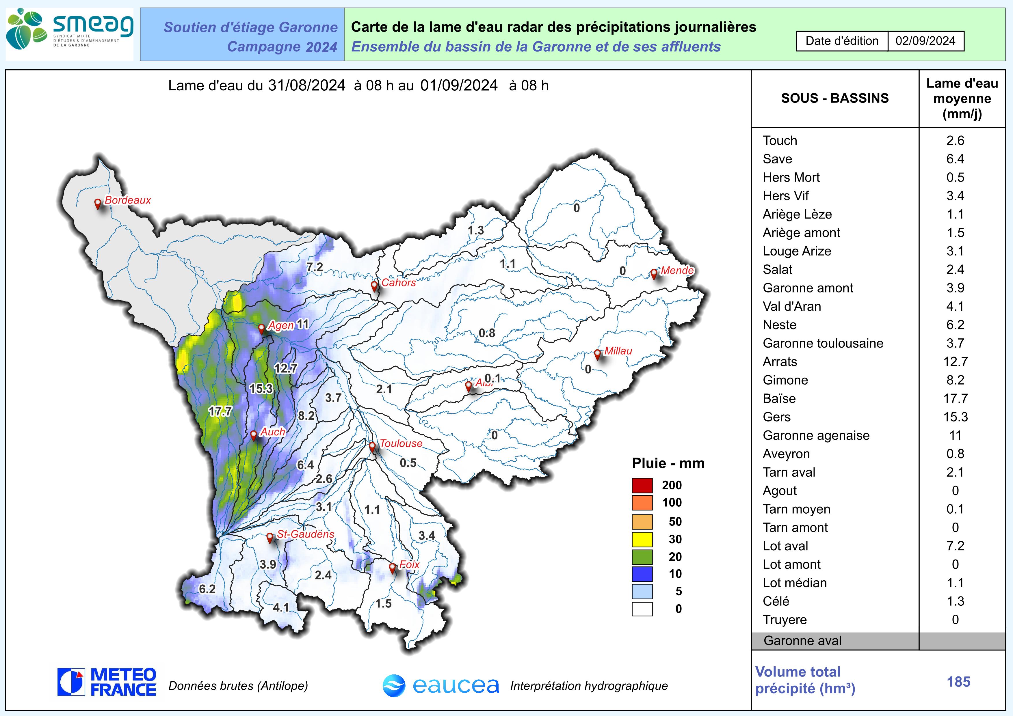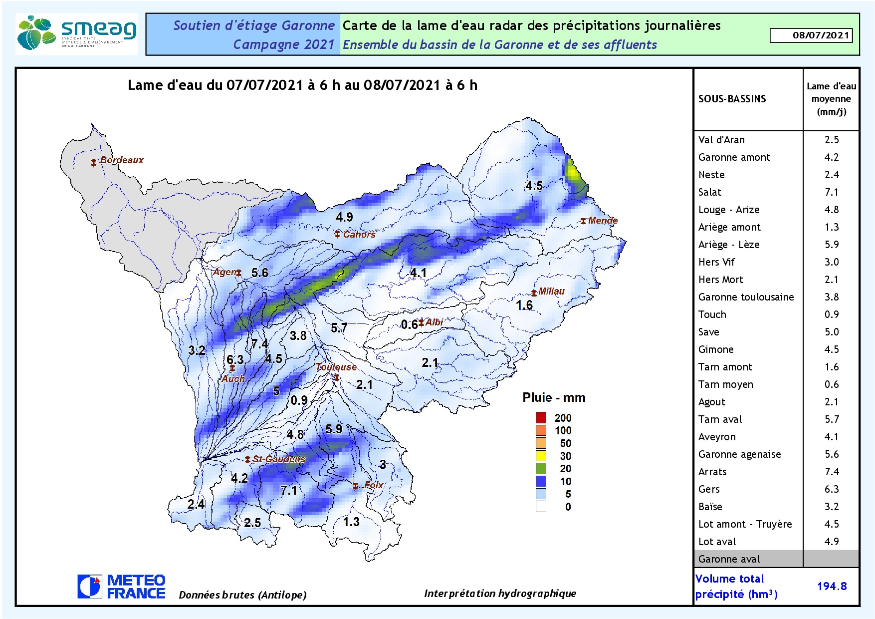 Cette carte illustre les quantités d'eau précipitées sur 24 heures par sous-bassins versants (source : images radar Météo France).