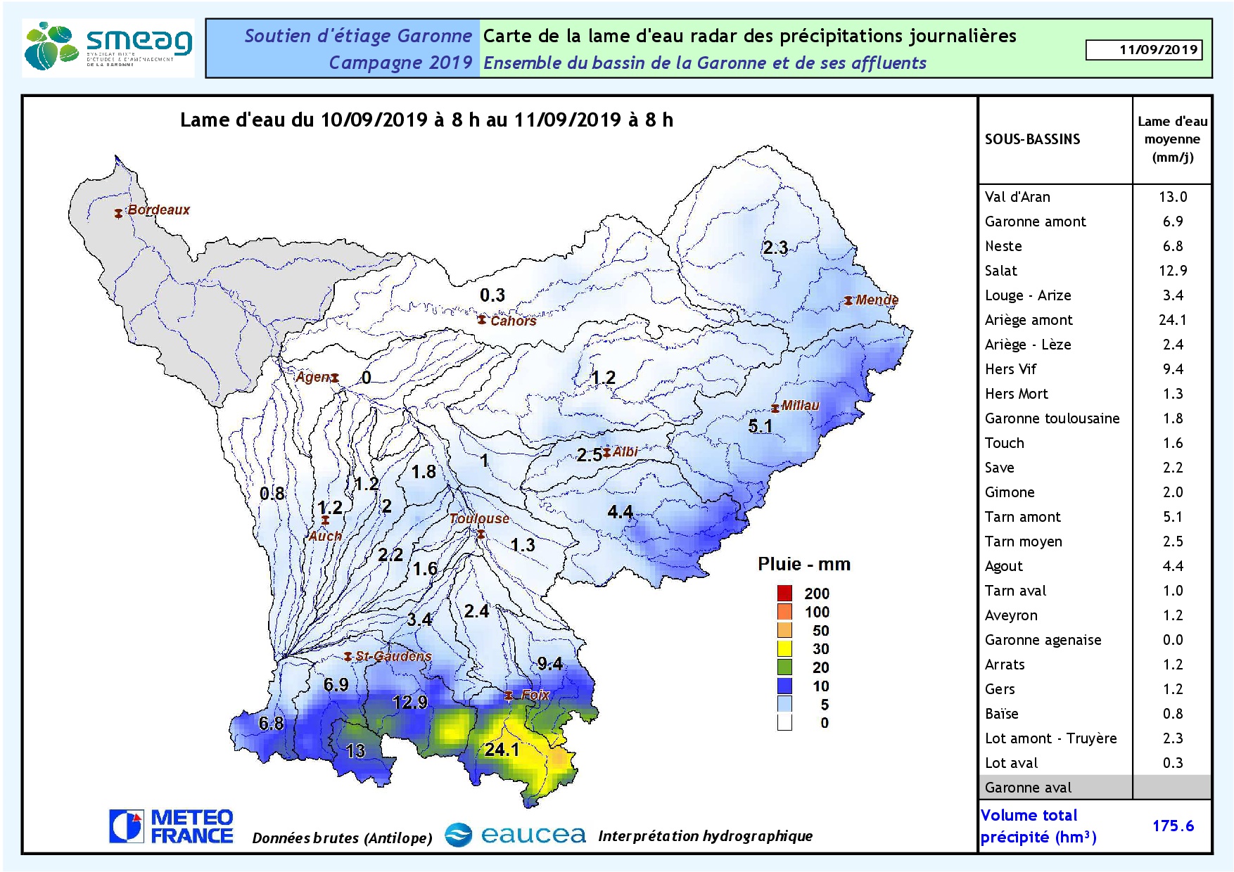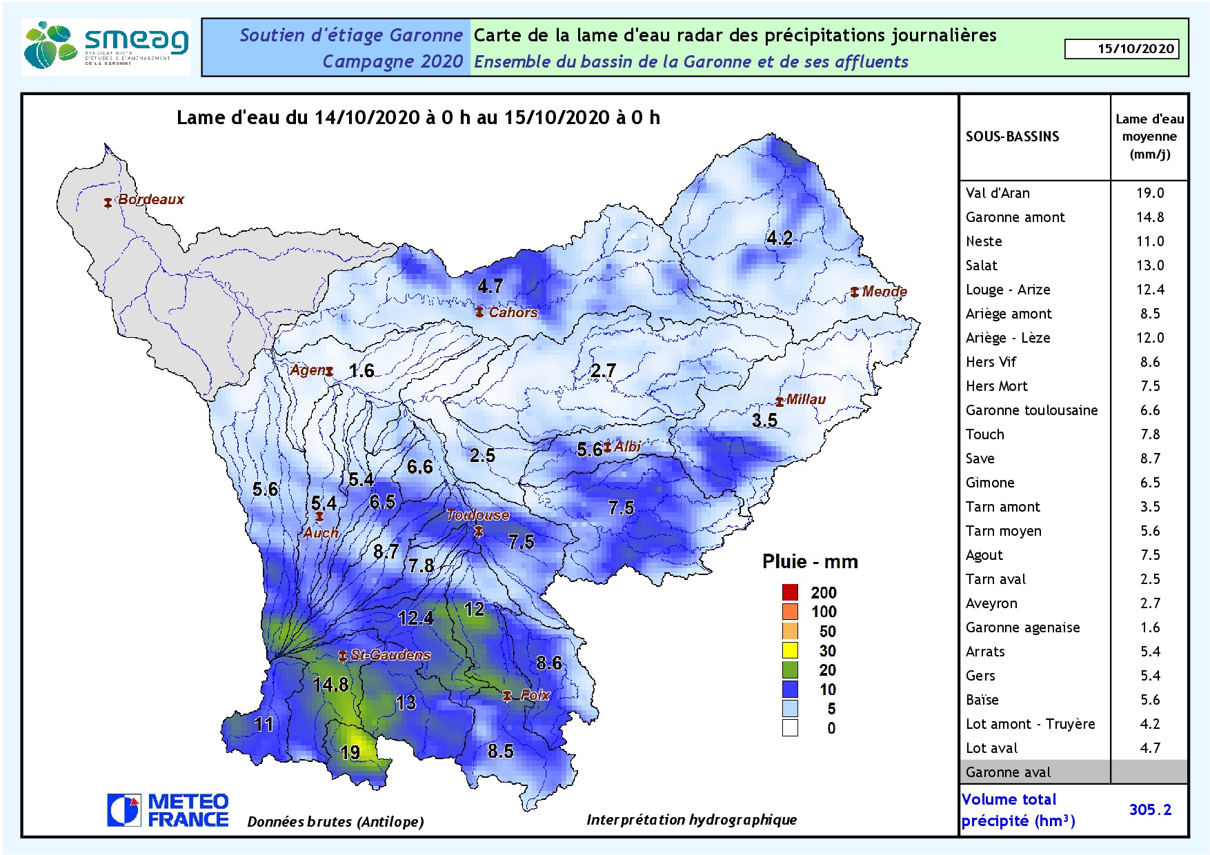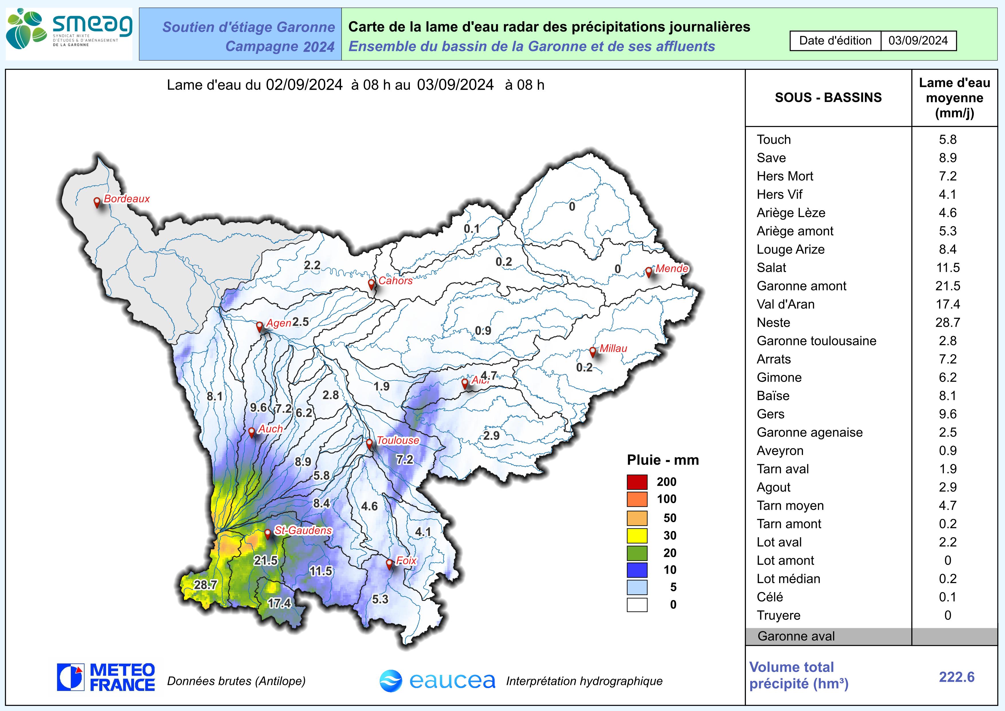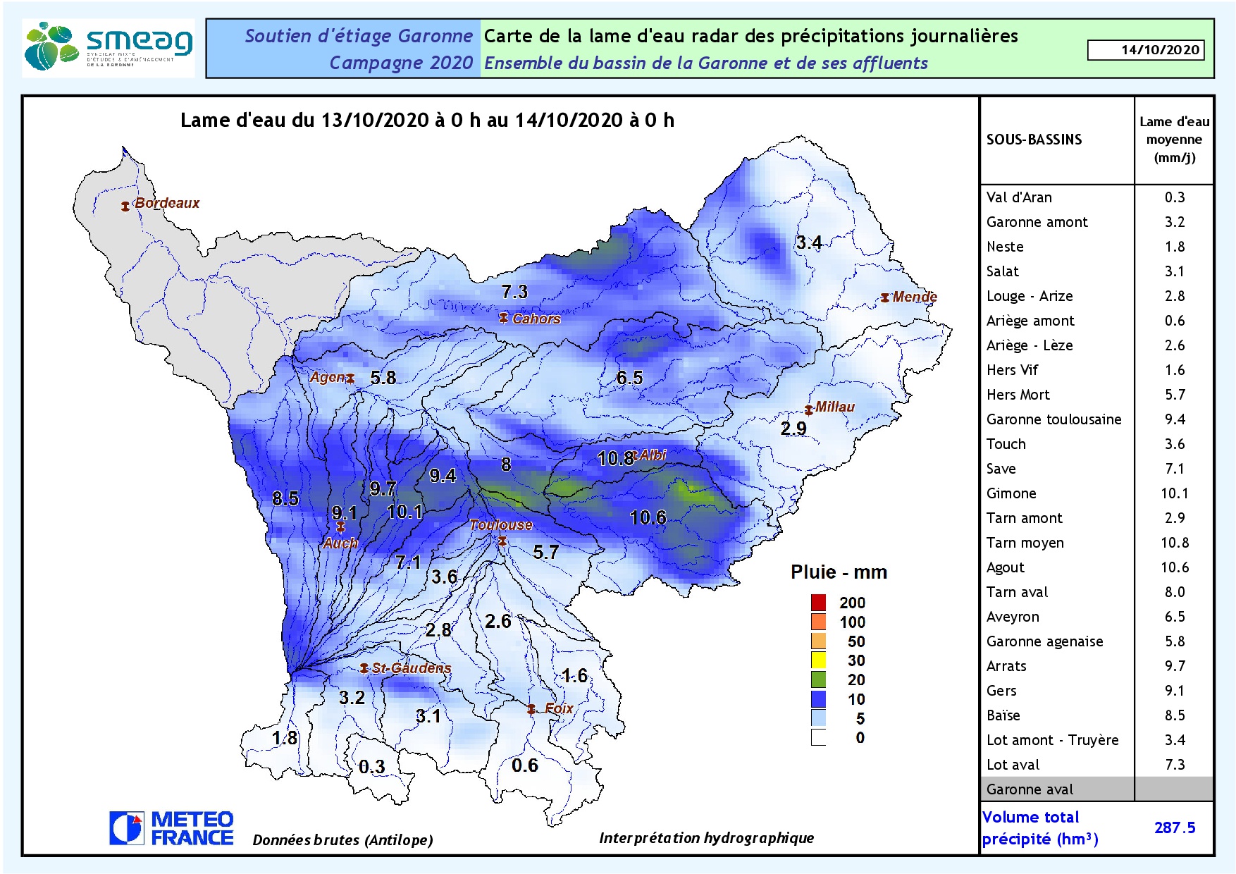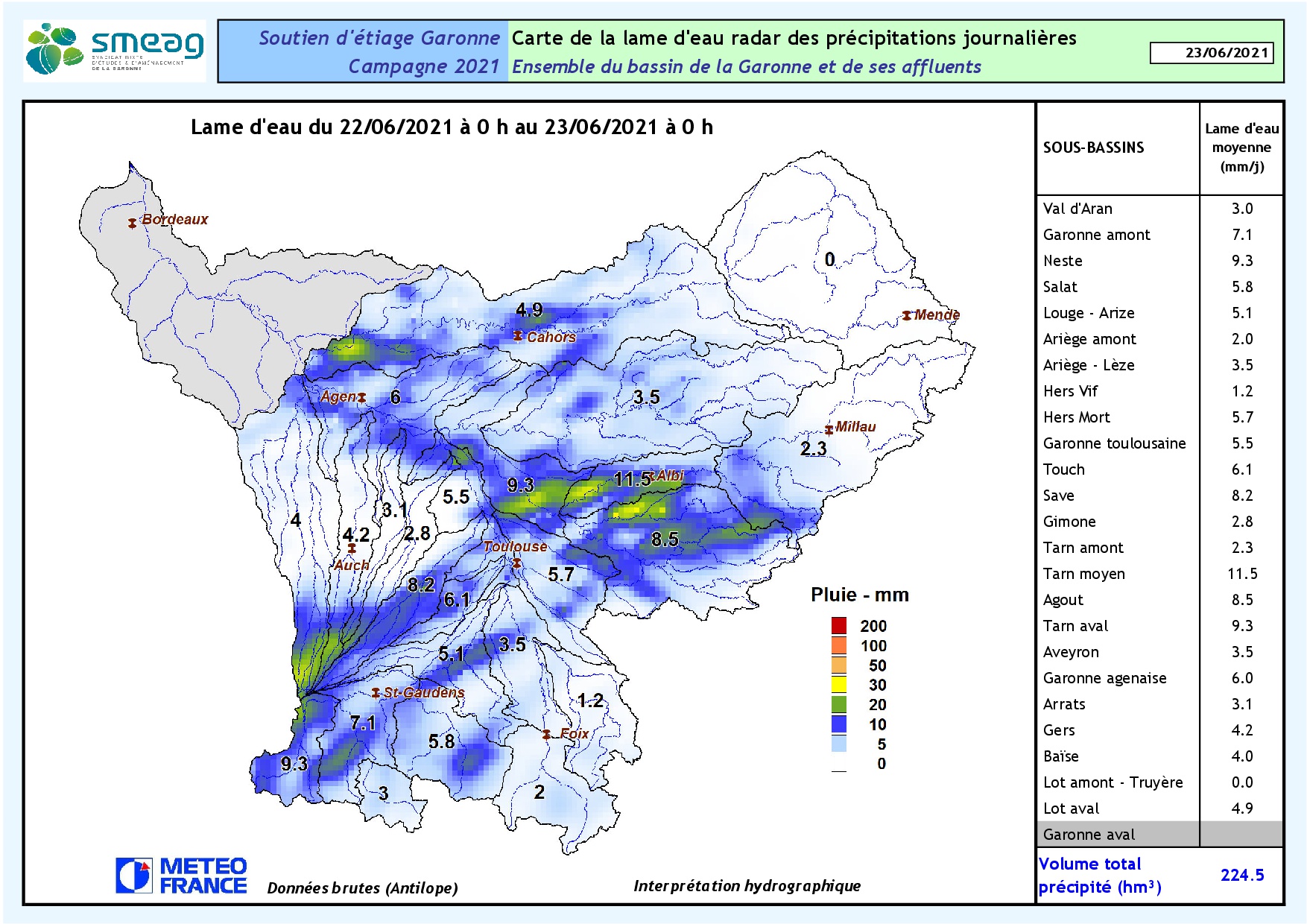 Cette carte illustre les quantités d'eau précipitées sur 24 heures par sous-bassins versants (source : images radar Météo France).