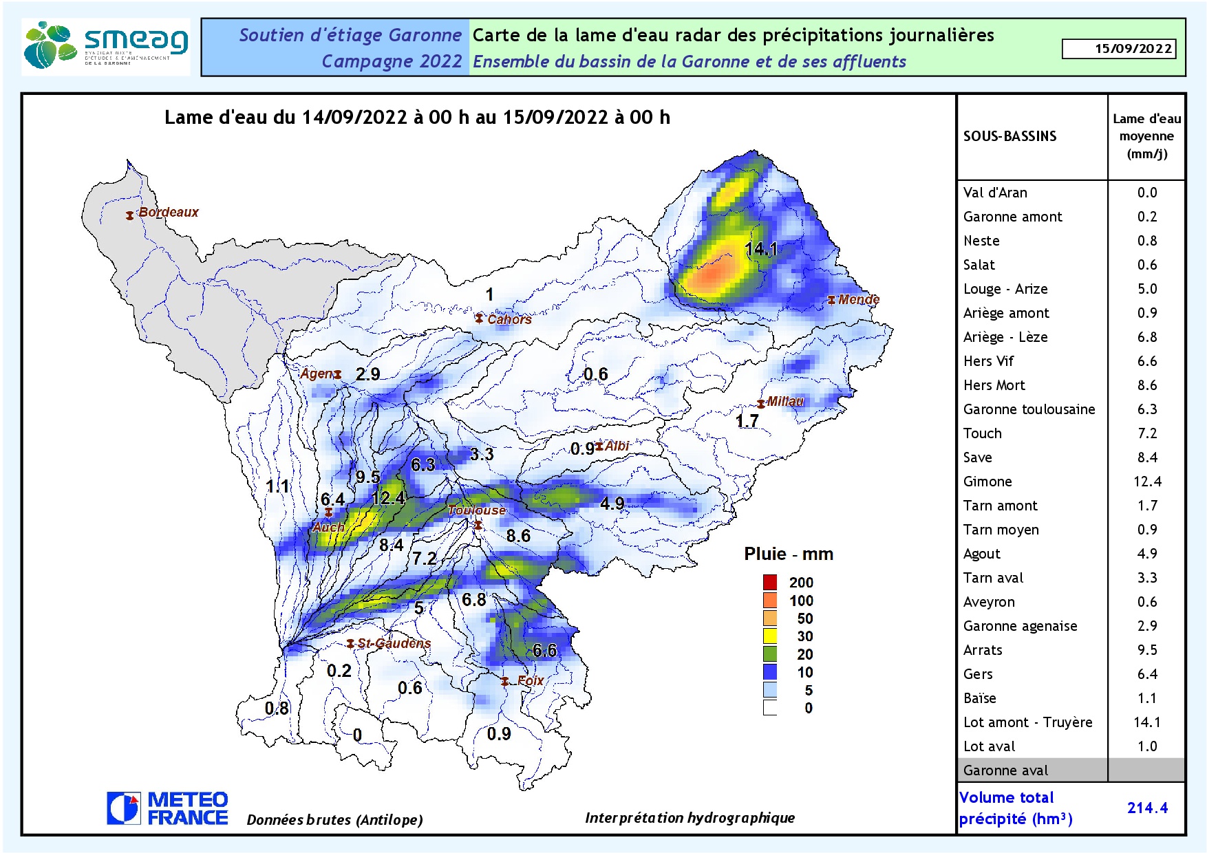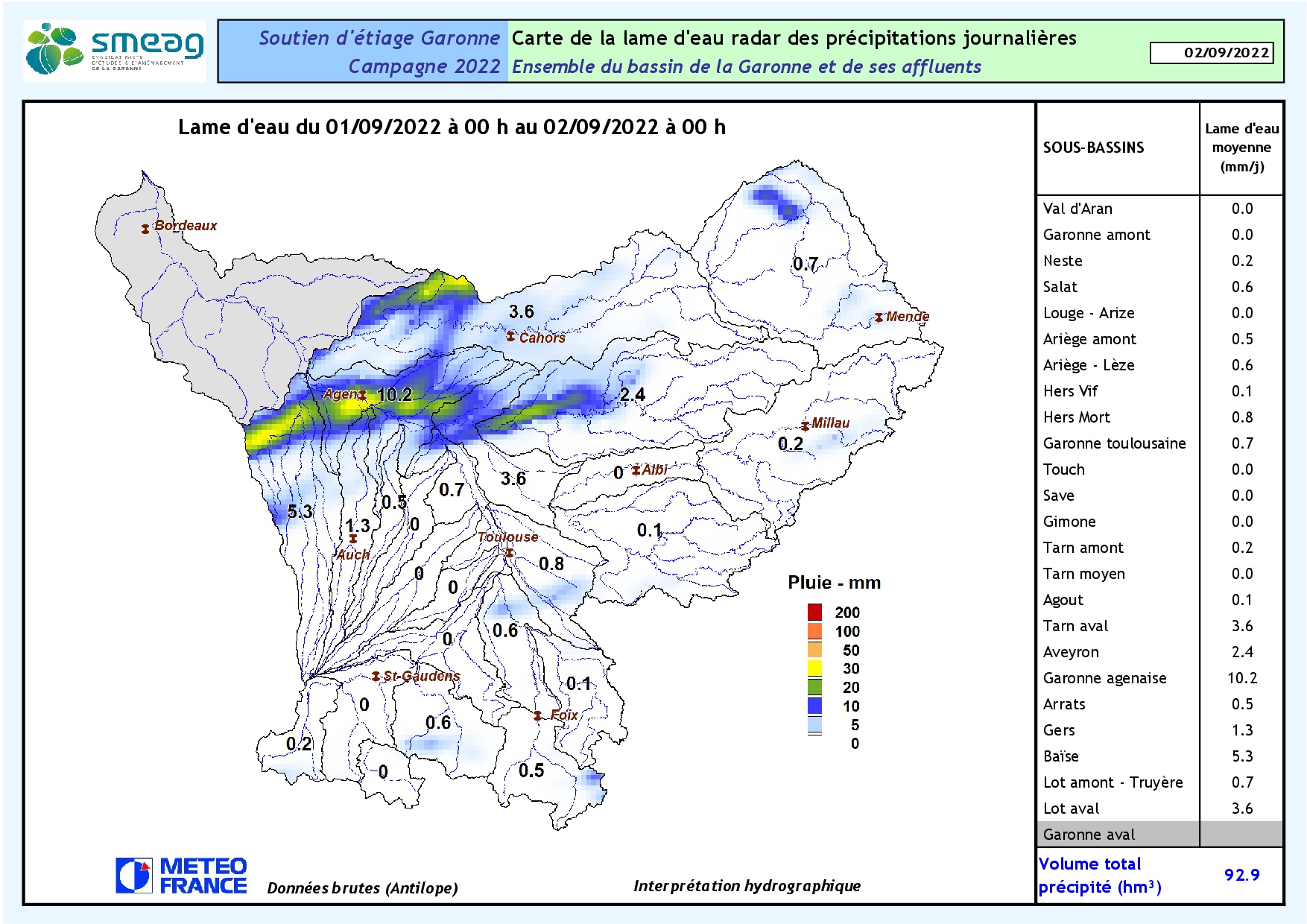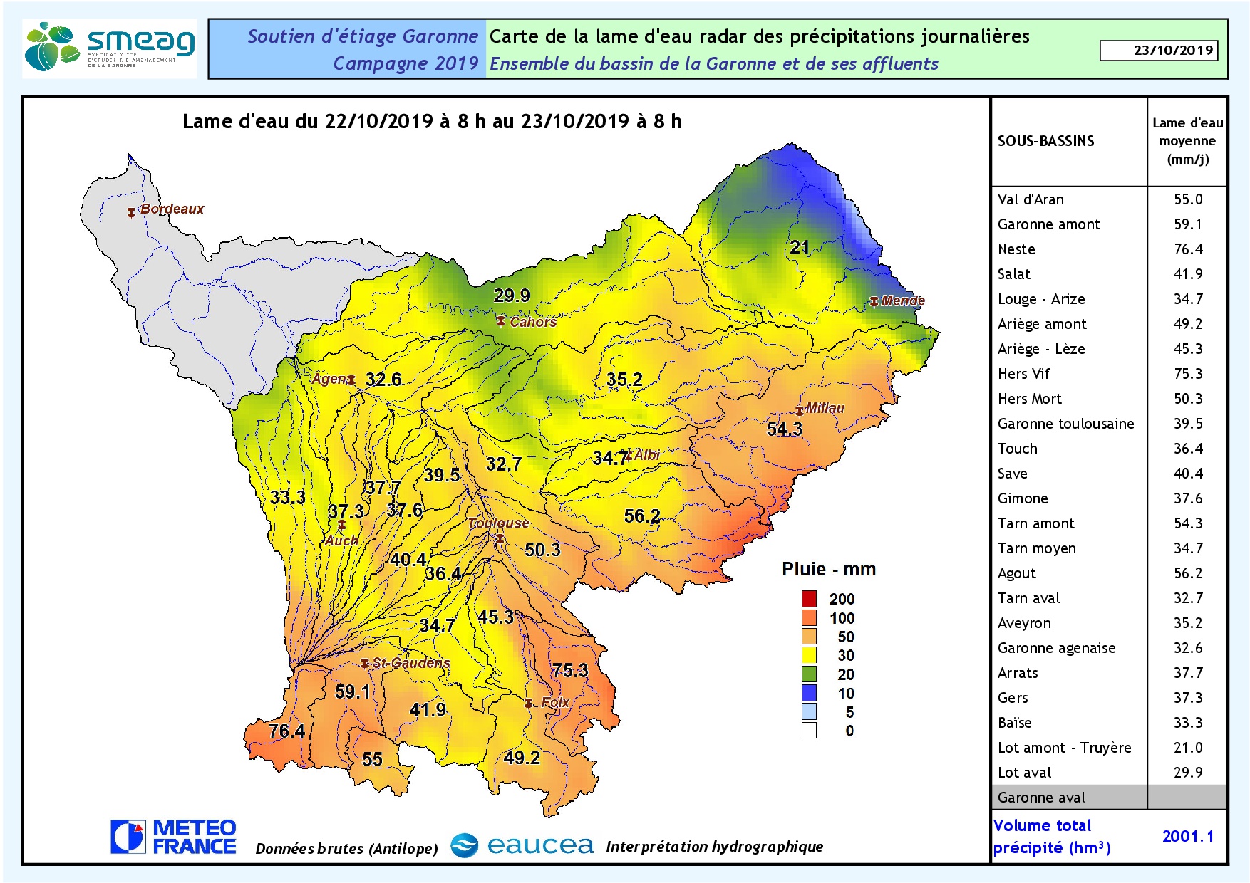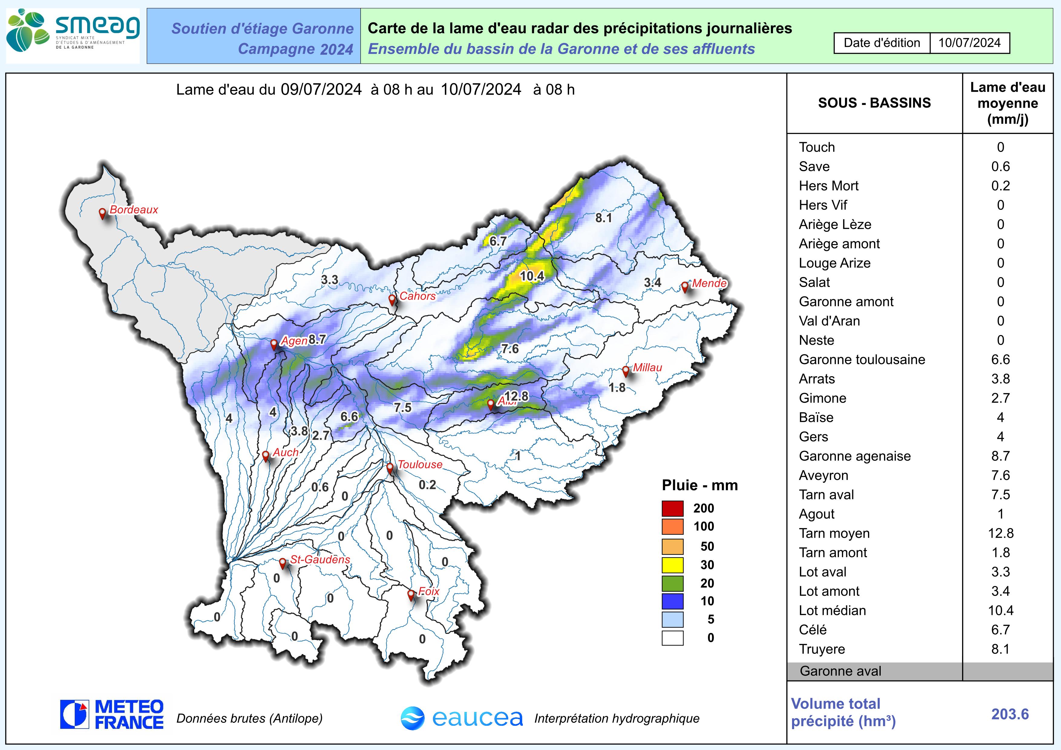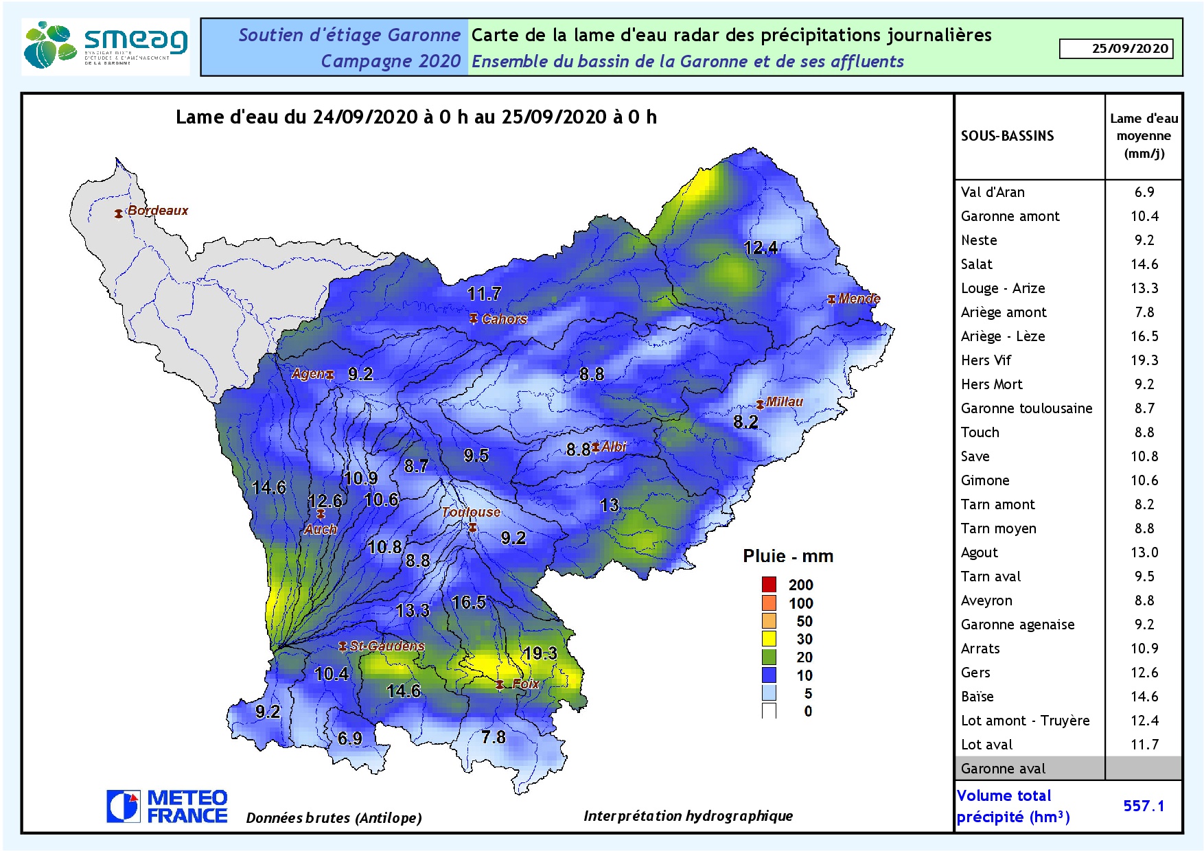 Cette carte illustre les quantités d'eau précipitées sur 24 heures par sous-bassins versants (source : images radar Météo France).