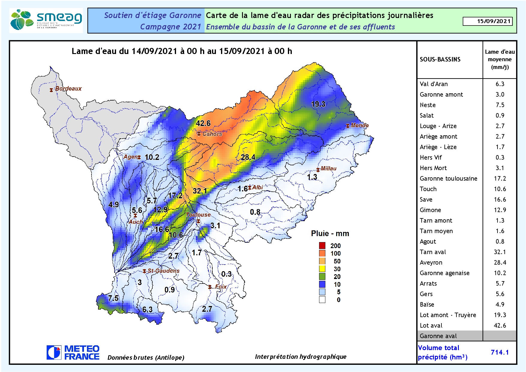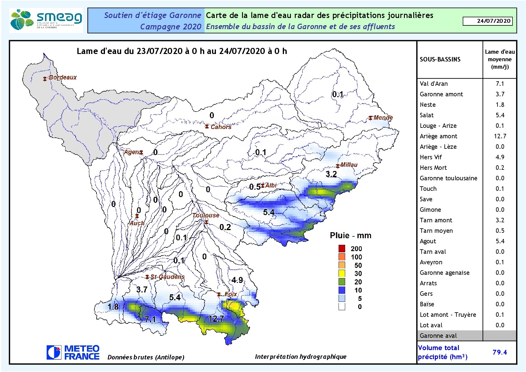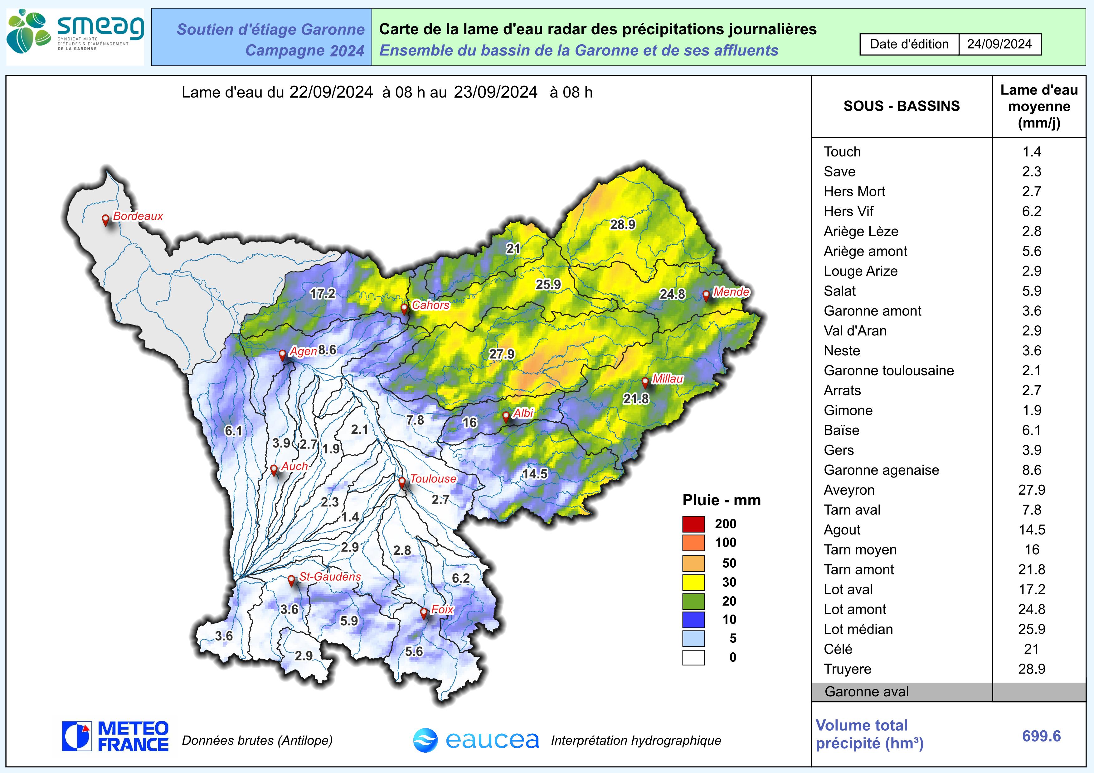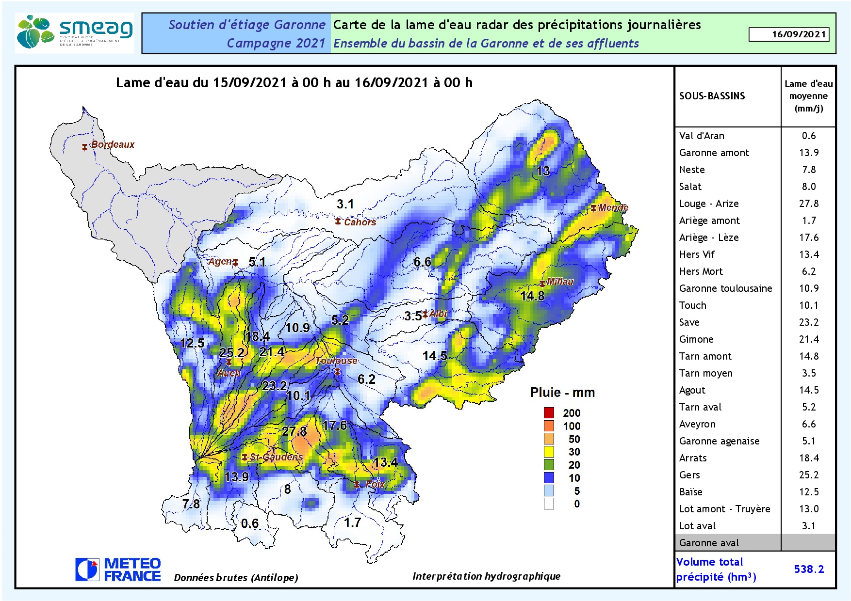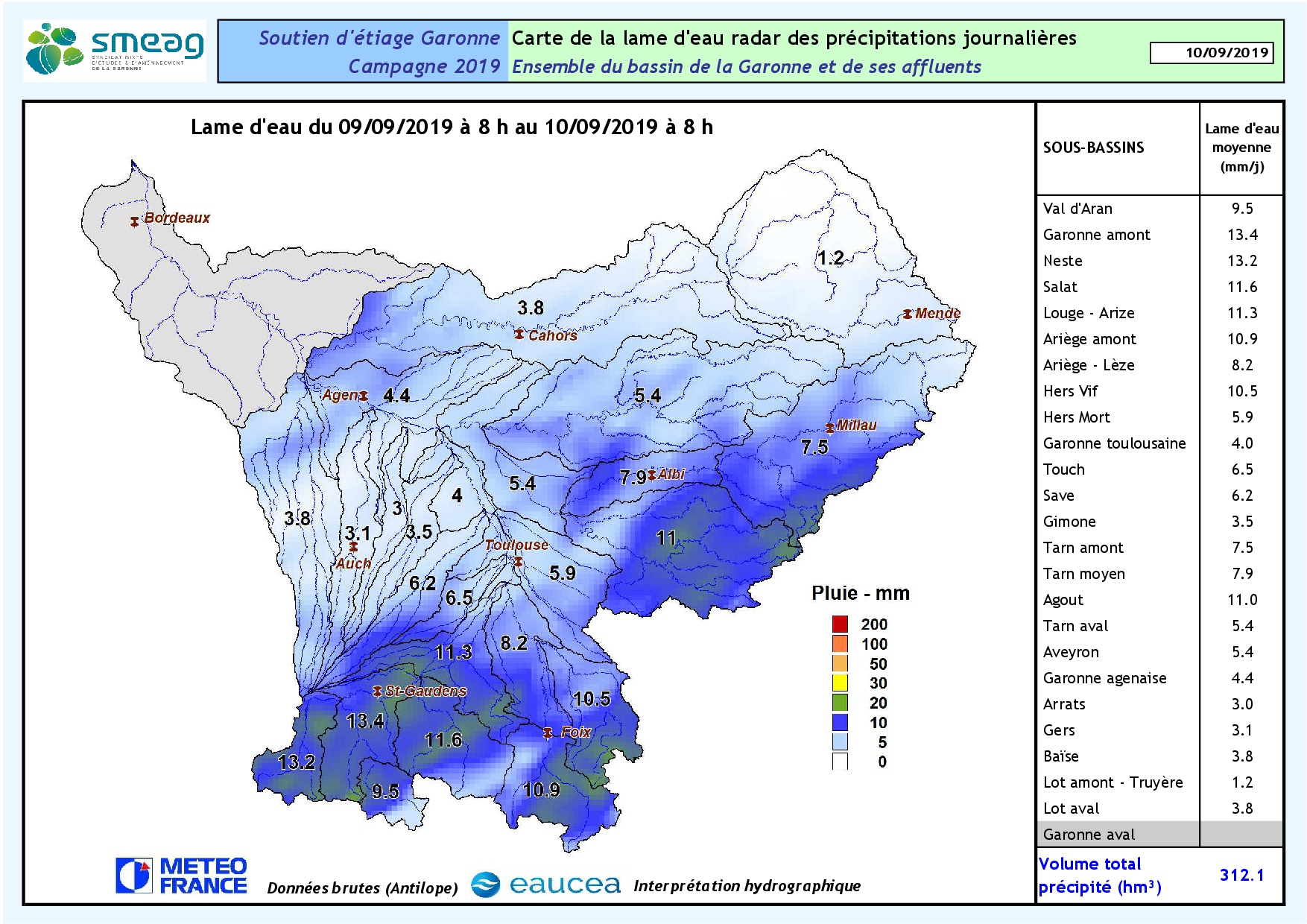 Cette carte illustre les quantités d'eau précipitées sur 24 heures par sous-bassins versants (source : images radar Météo France).