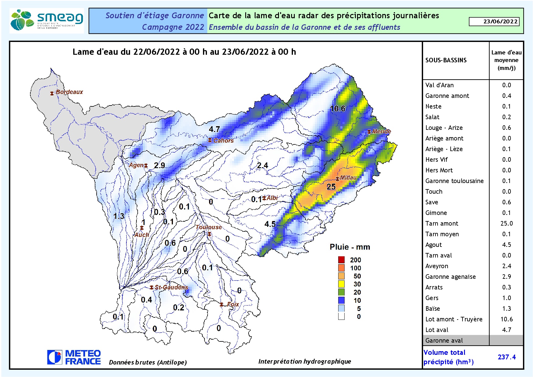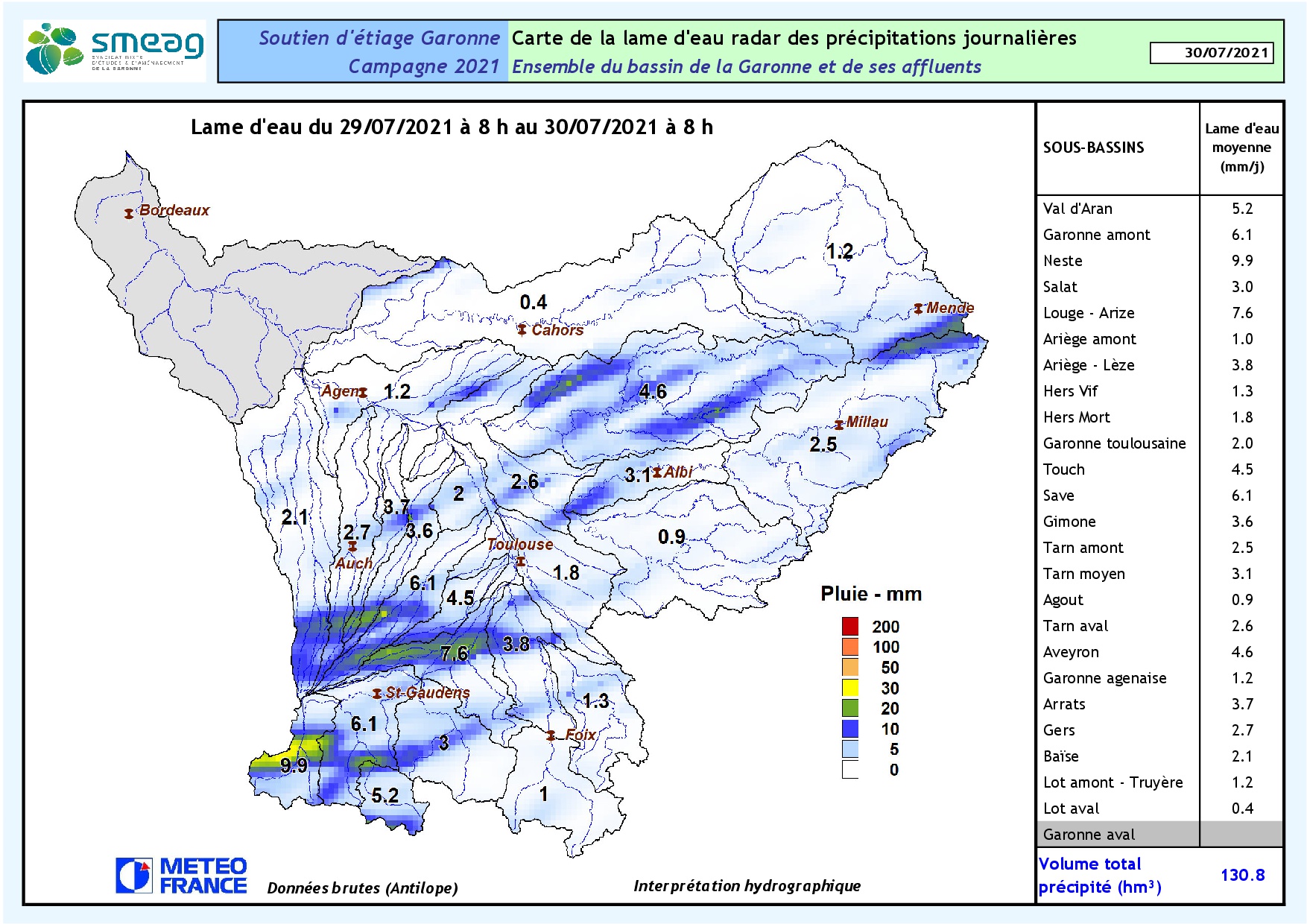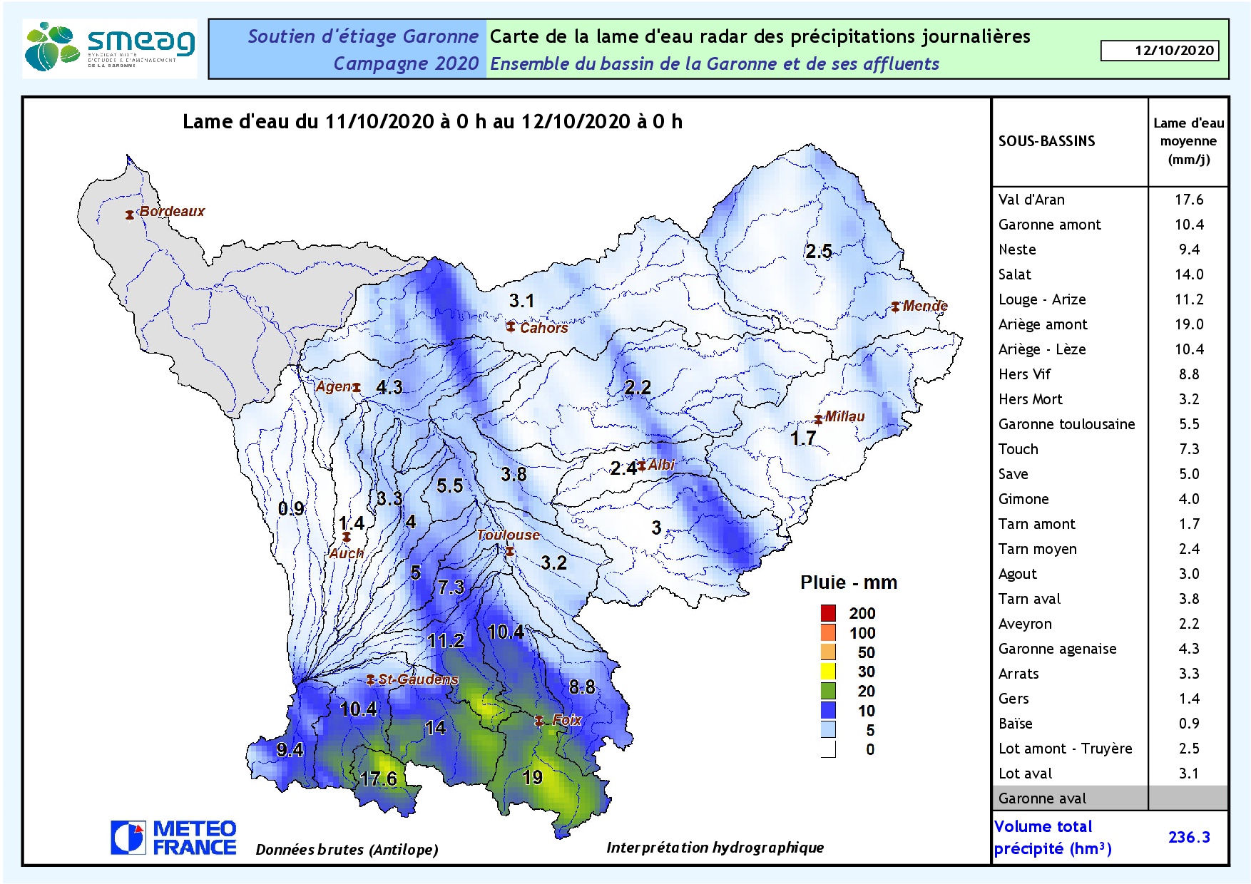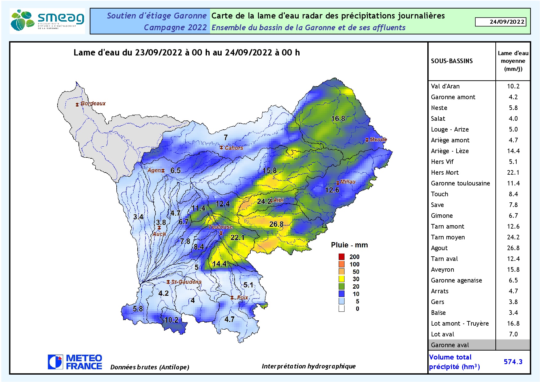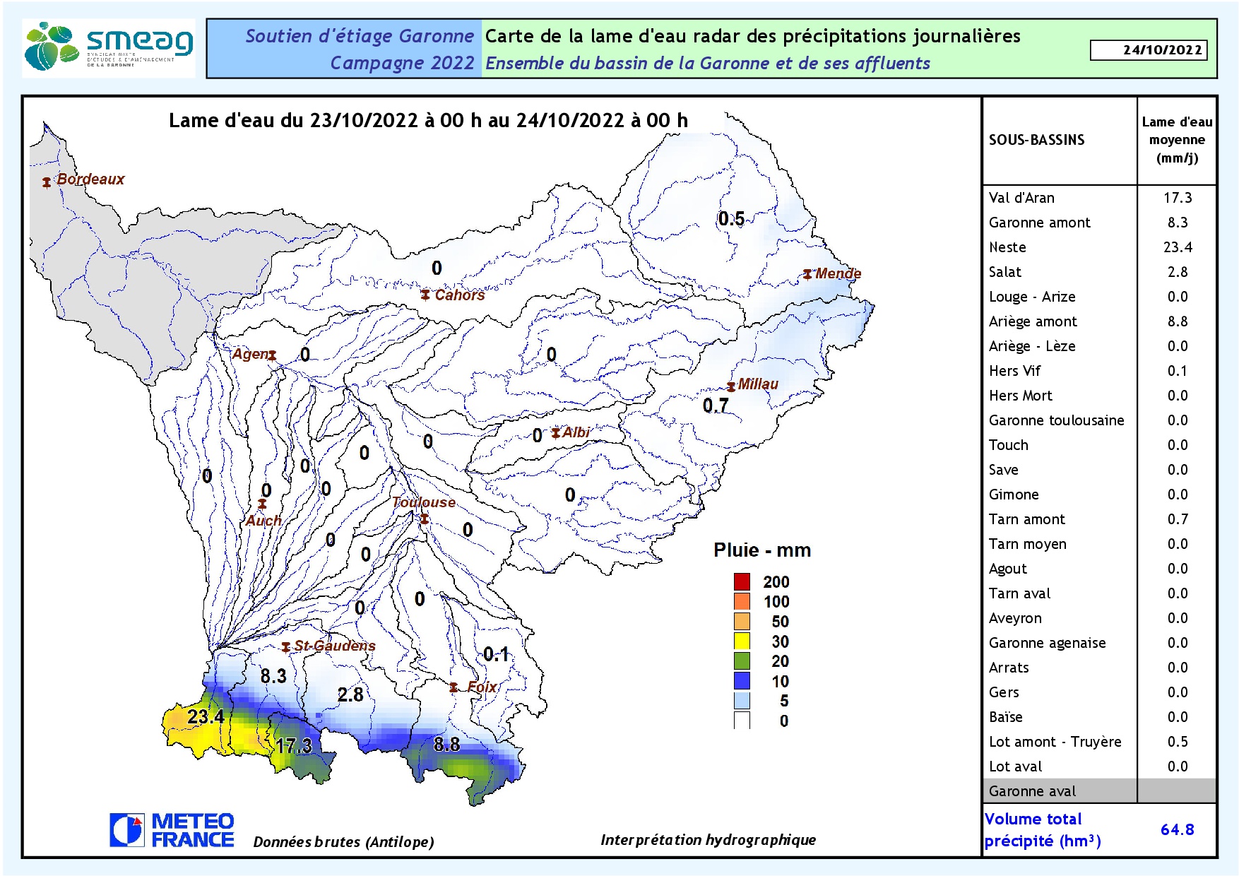 Cette carte illustre les quantités d'eau précipitées sur 24 heures par sous-bassins versants (source : images radar Météo France).