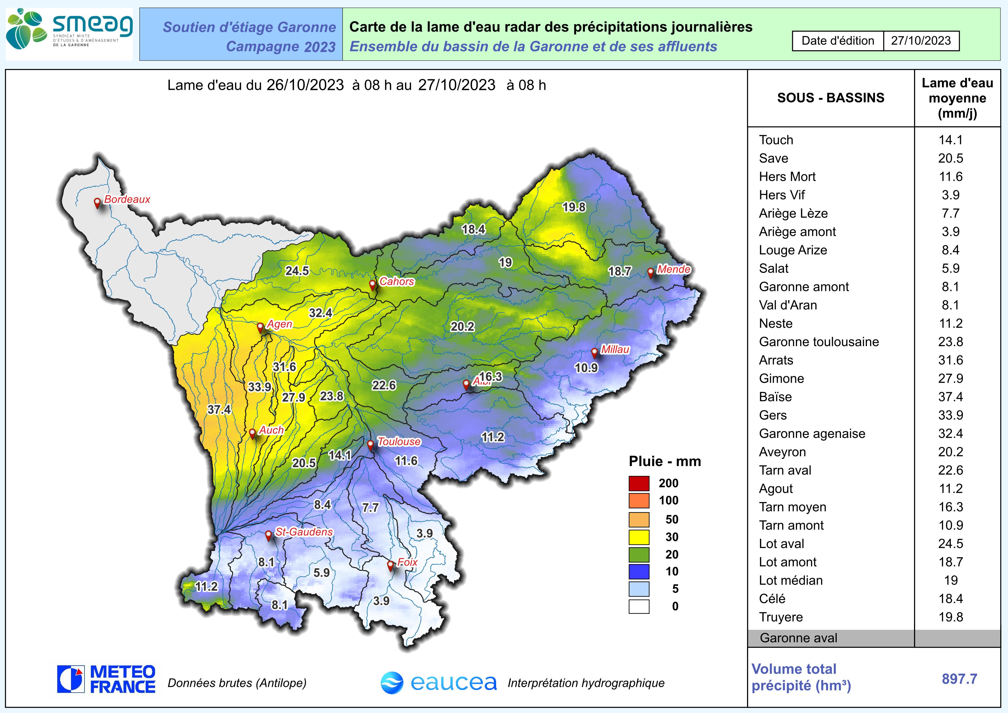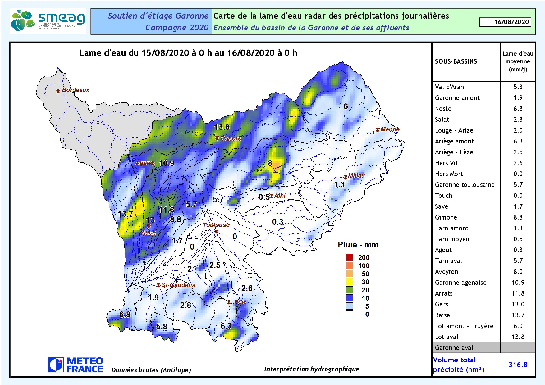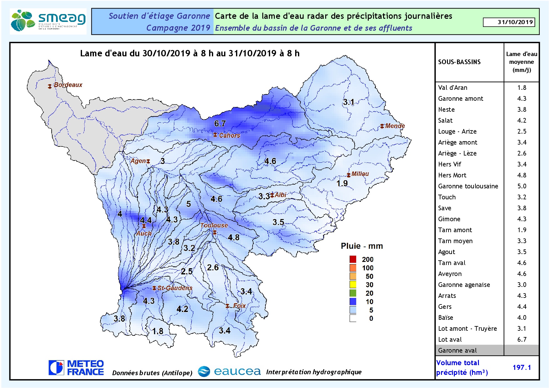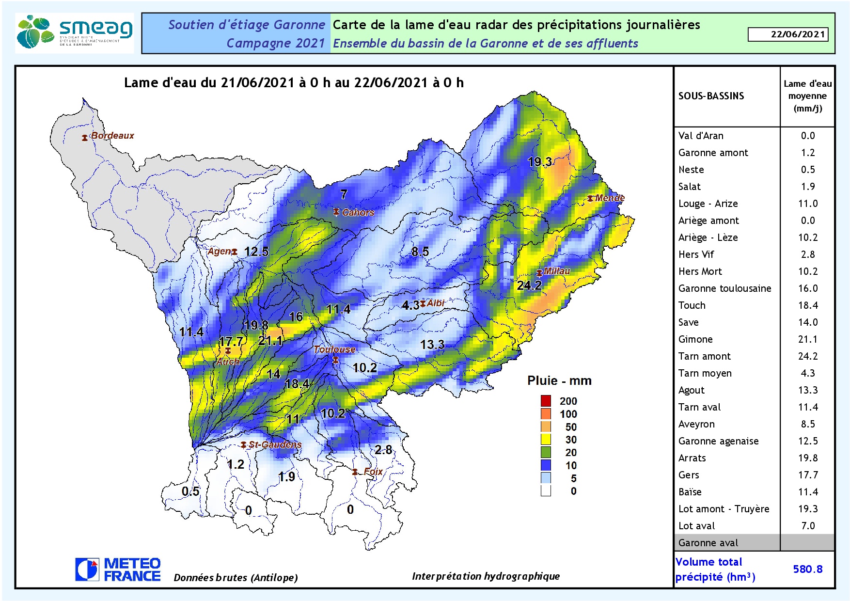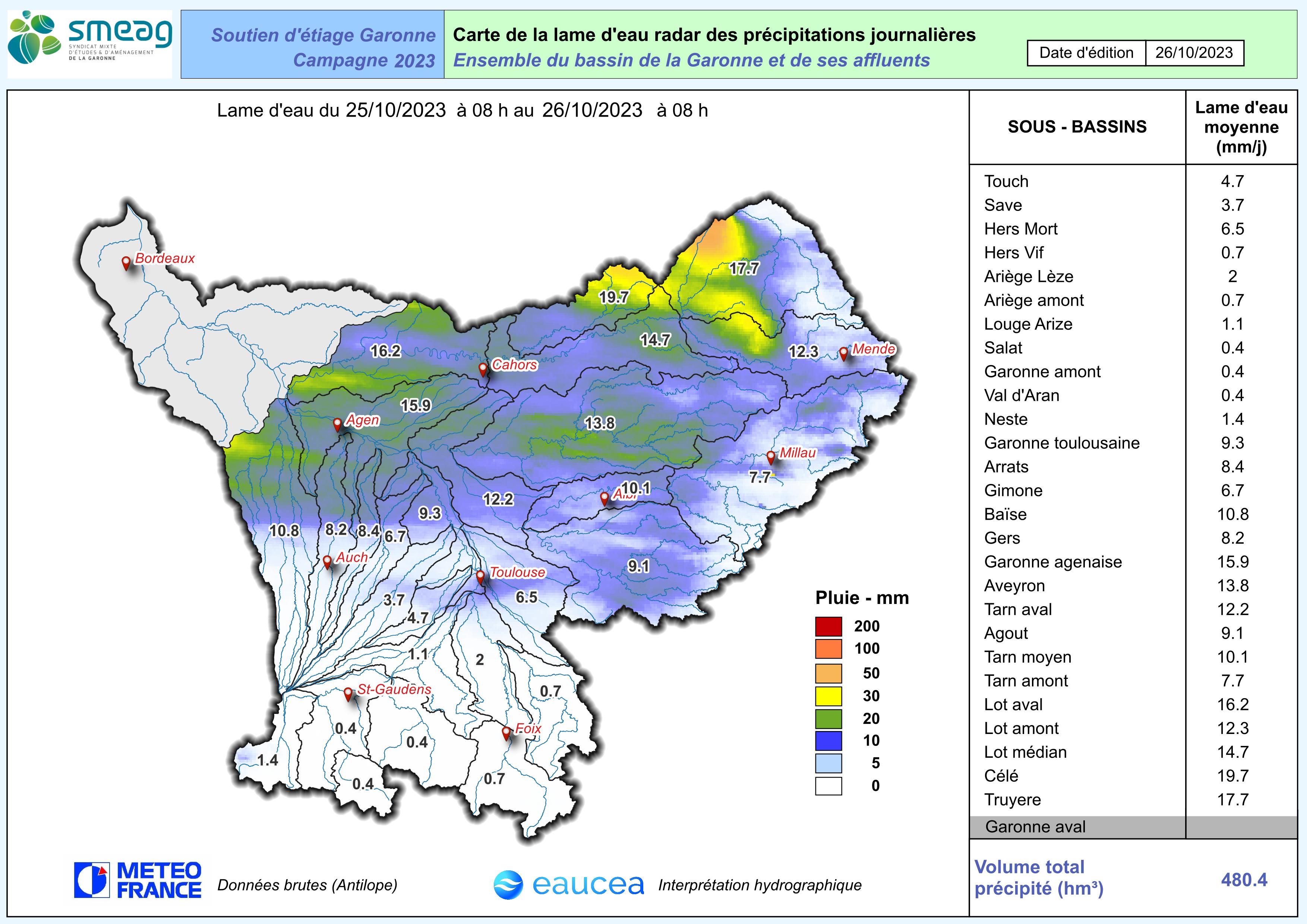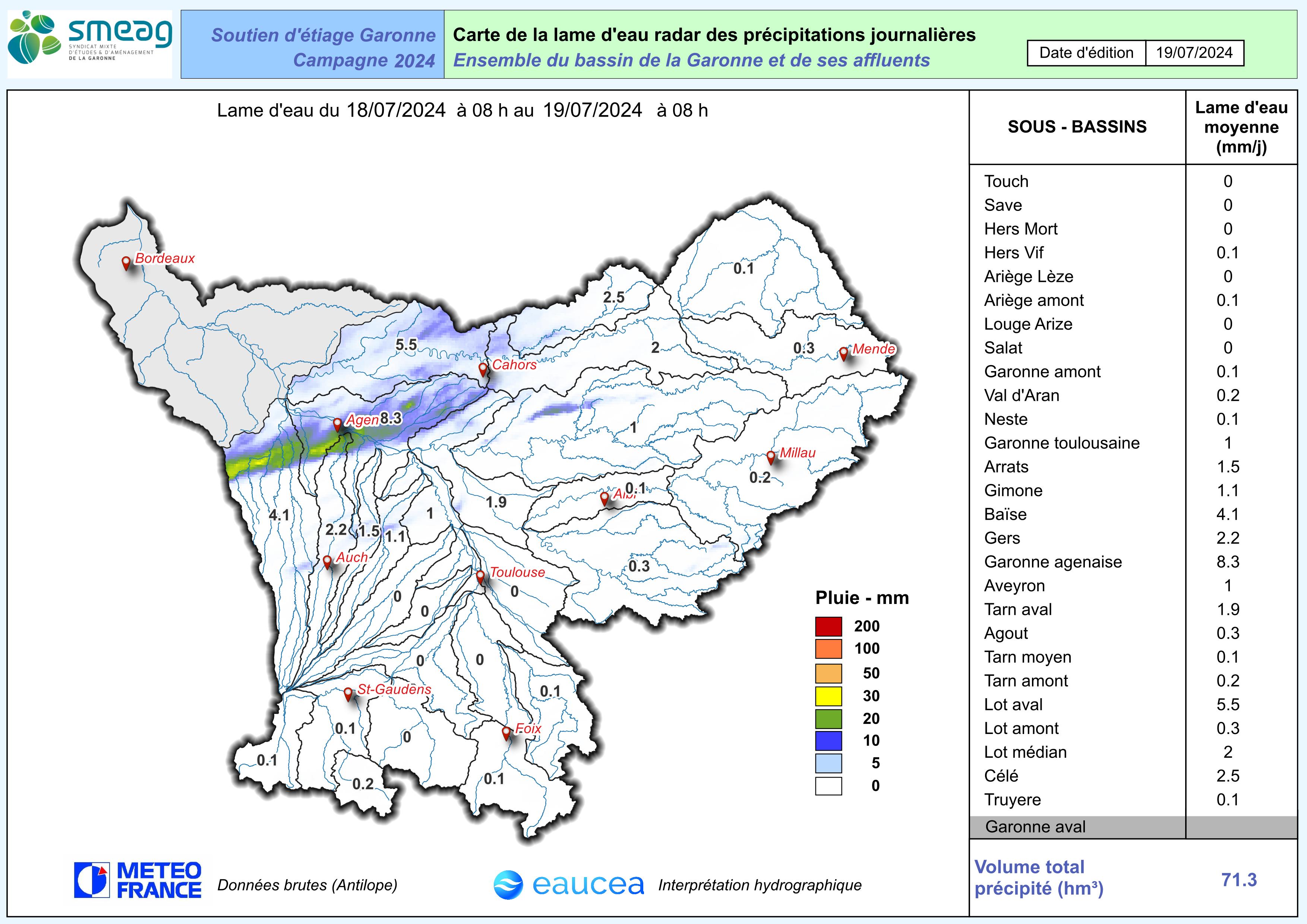 Cette carte illustre les quantités d'eau précipitées sur 24 heures par sous-bassins versants (source : images radar Météo France).