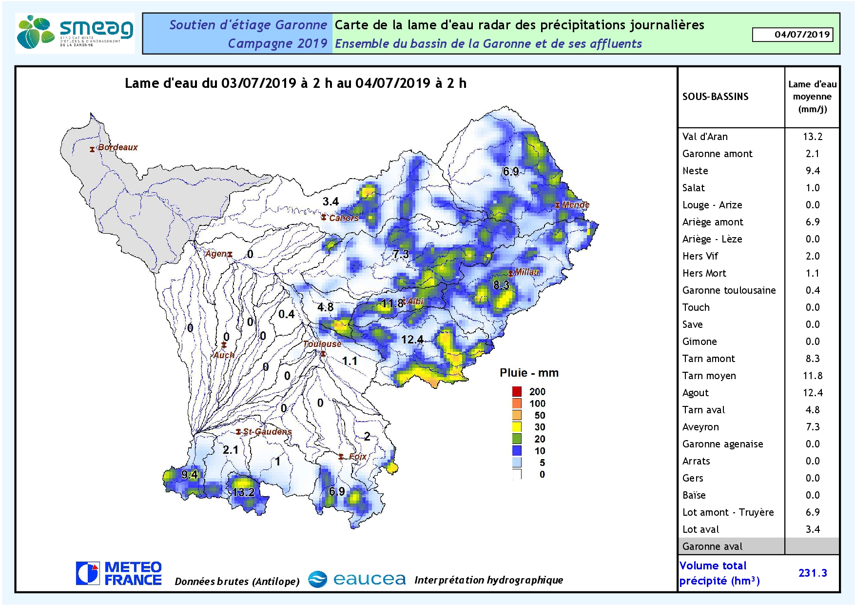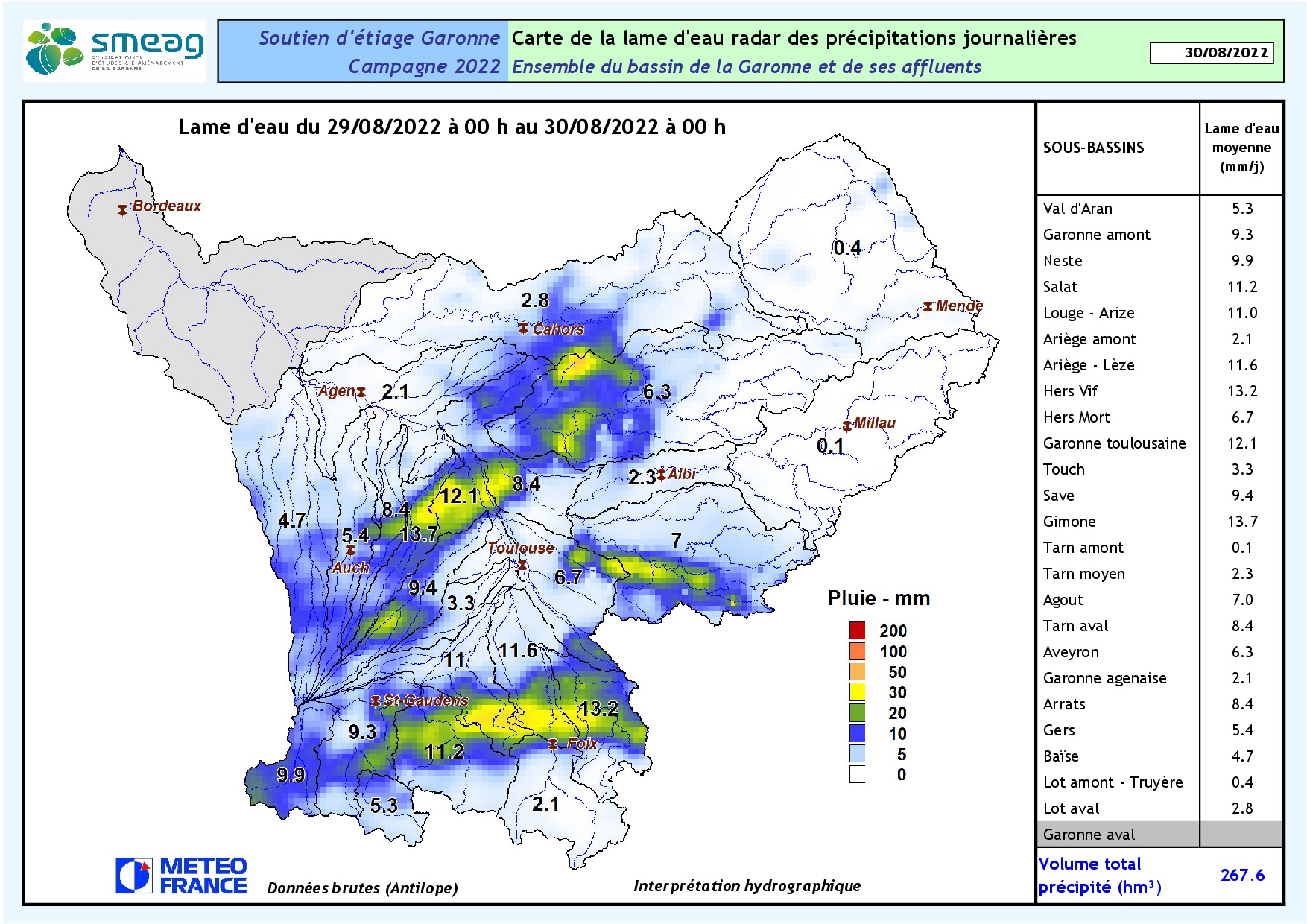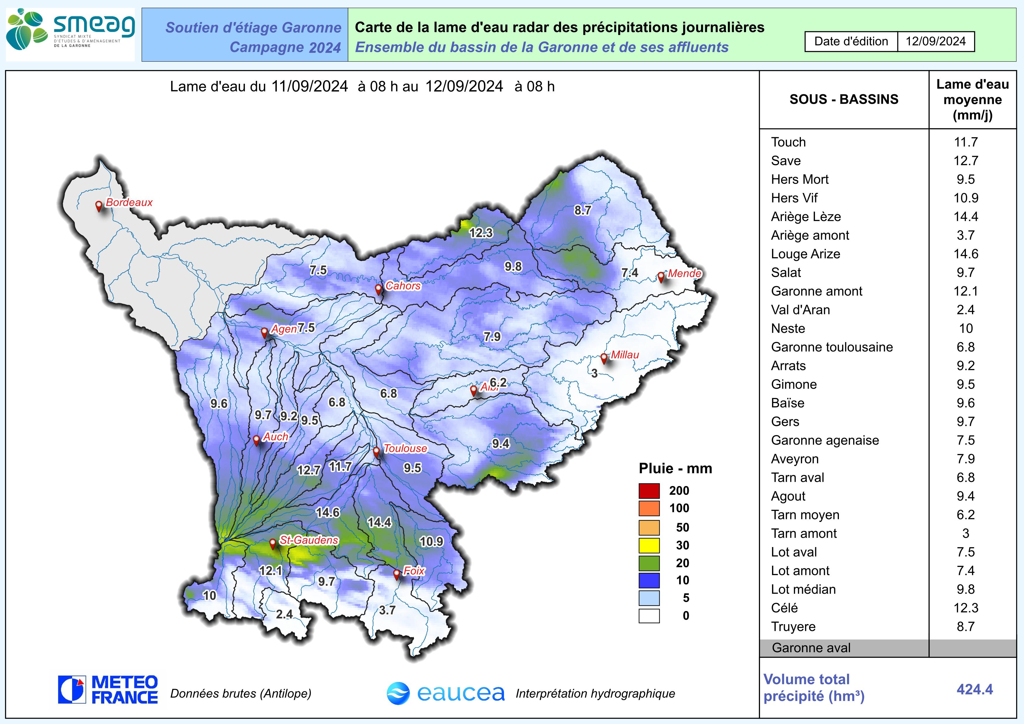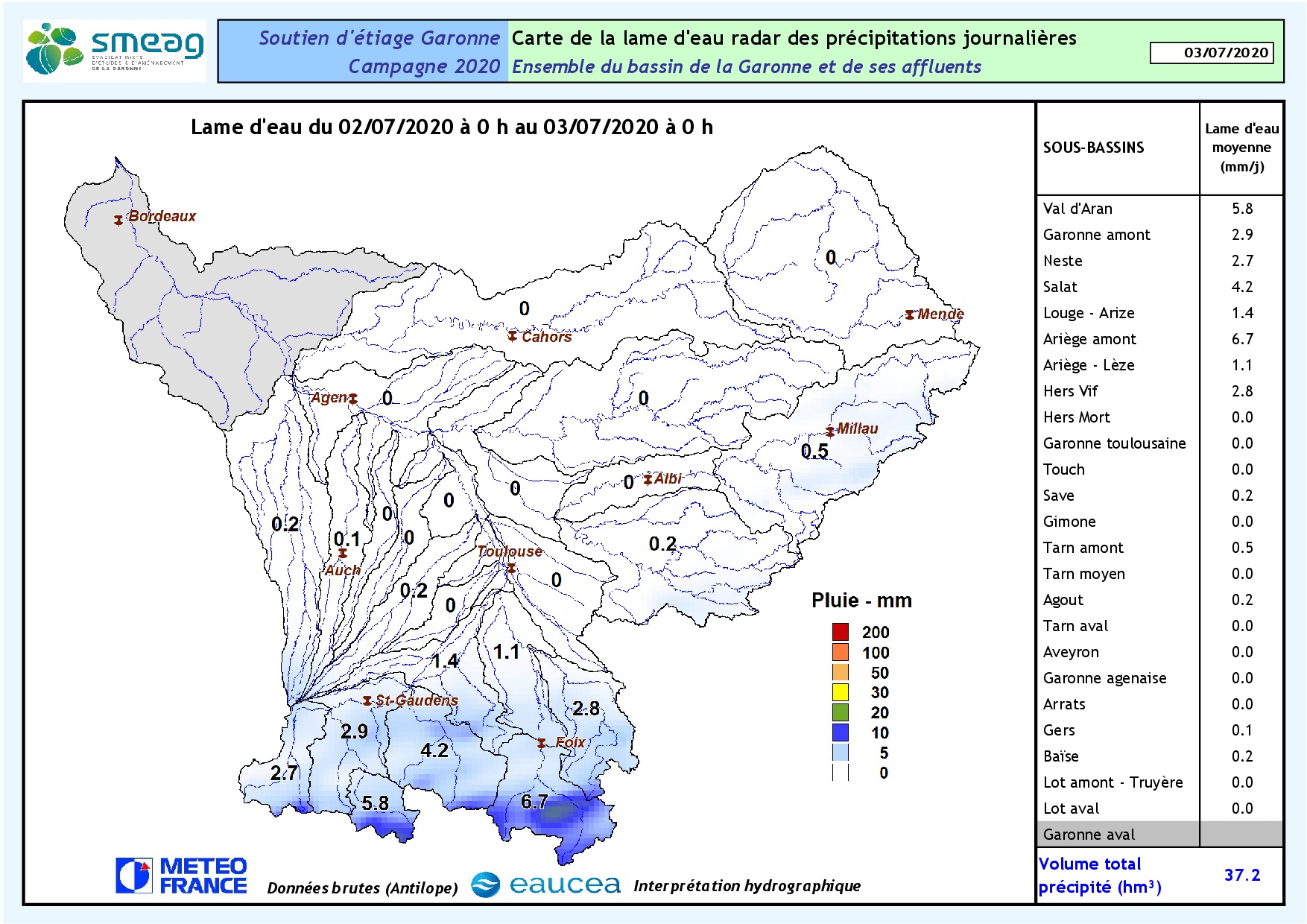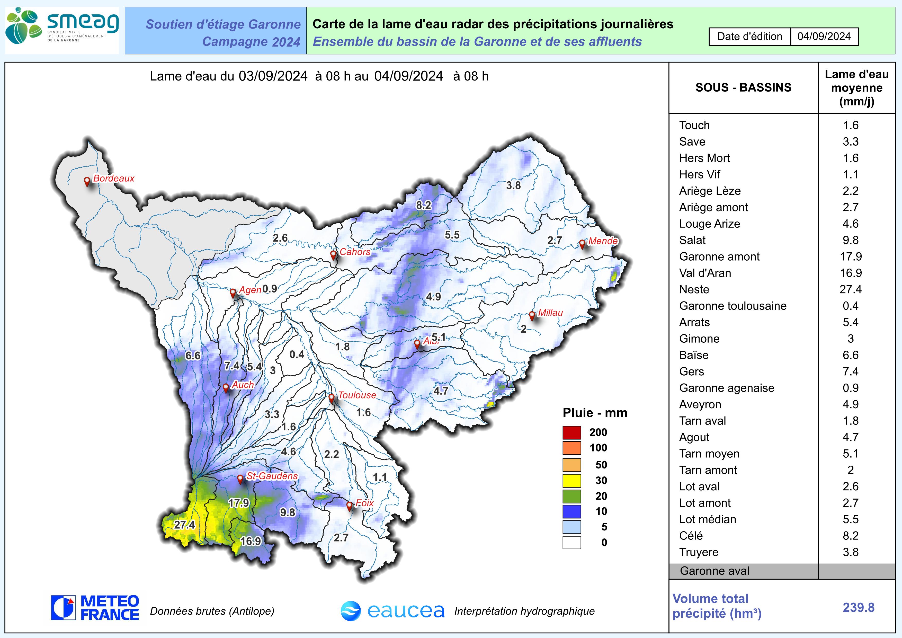 Cette carte illustre les quantités d'eau précipitées sur 24 heures par sous-bassins versants (source : images radar Météo France).