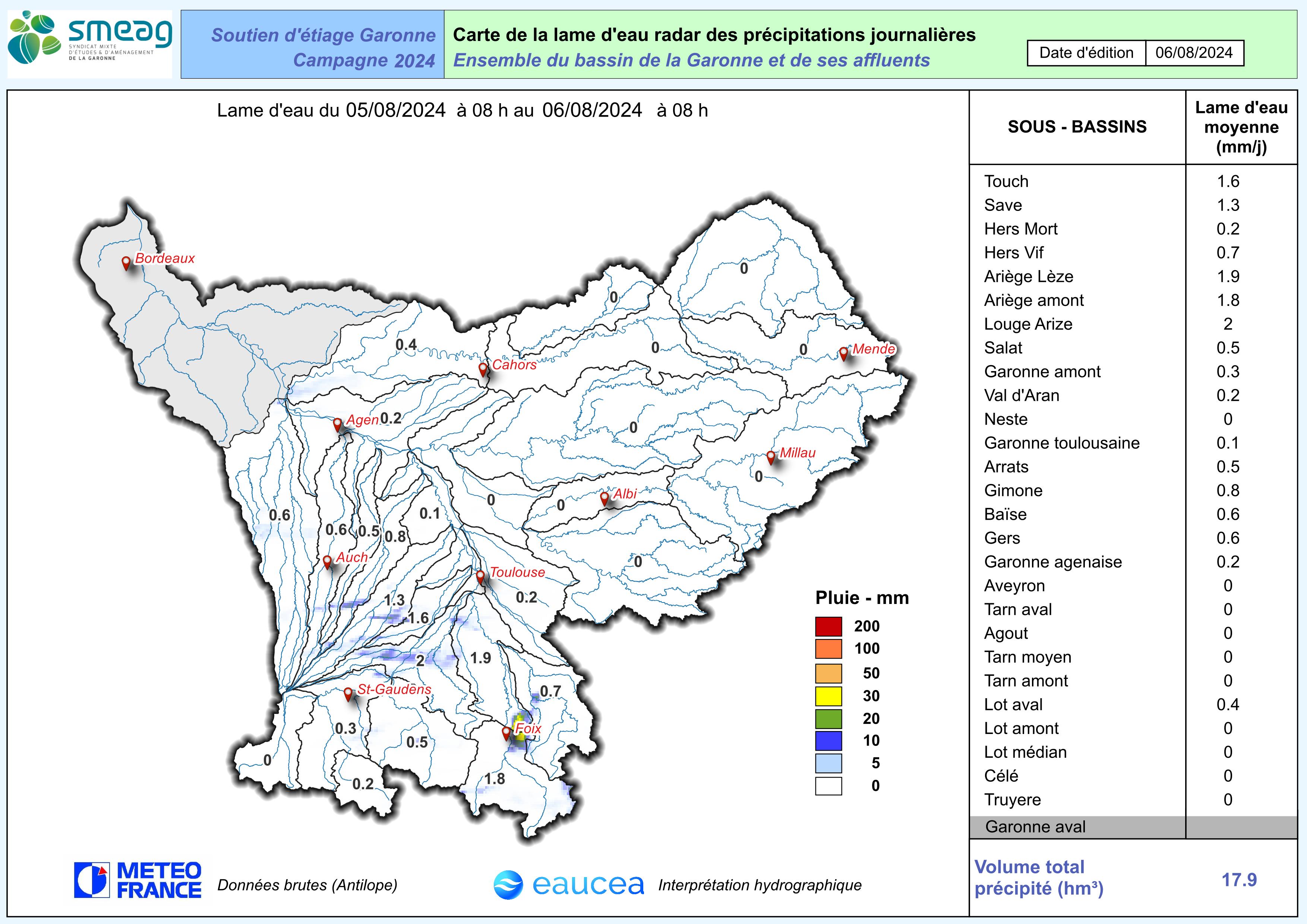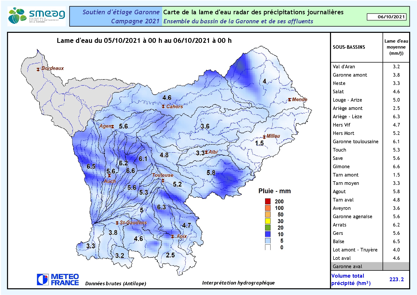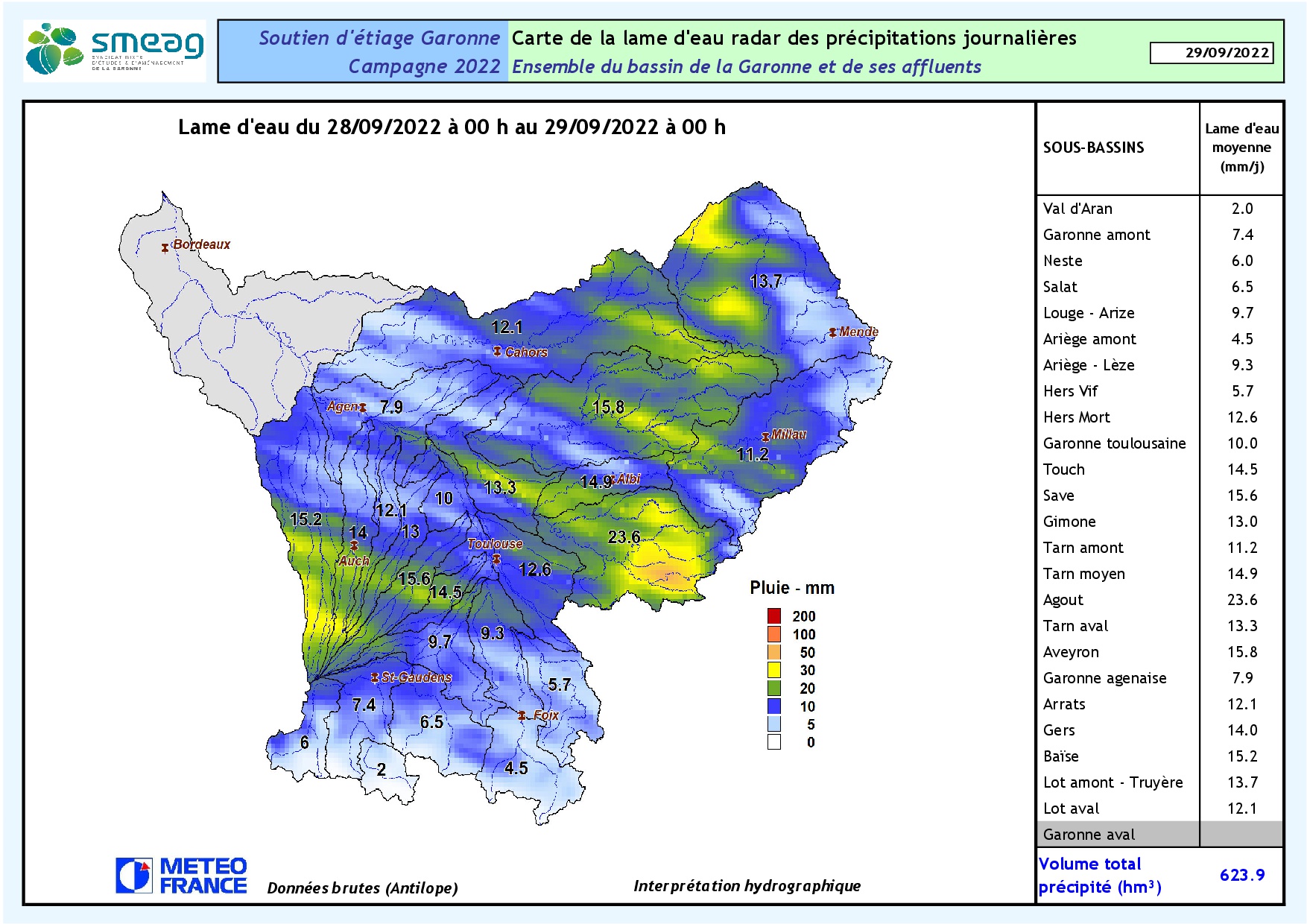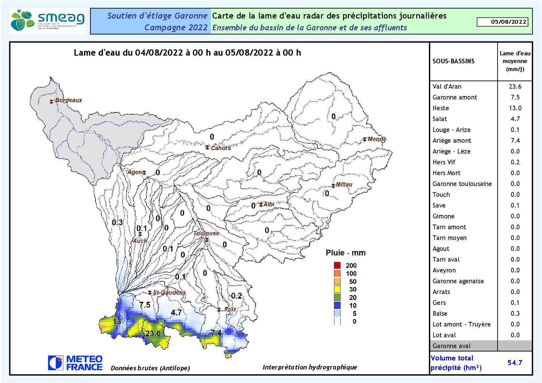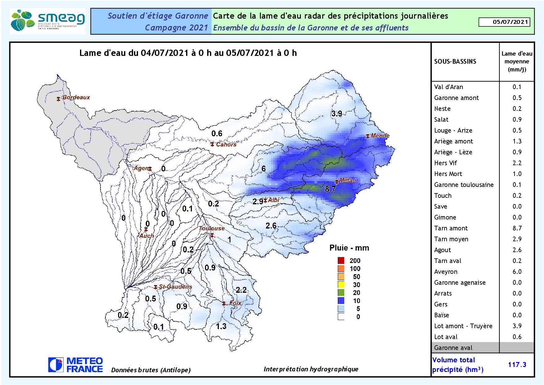 Cette carte illustre les quantités d'eau précipitées sur 24 heures par sous-bassins versants (source : images radar Météo France).