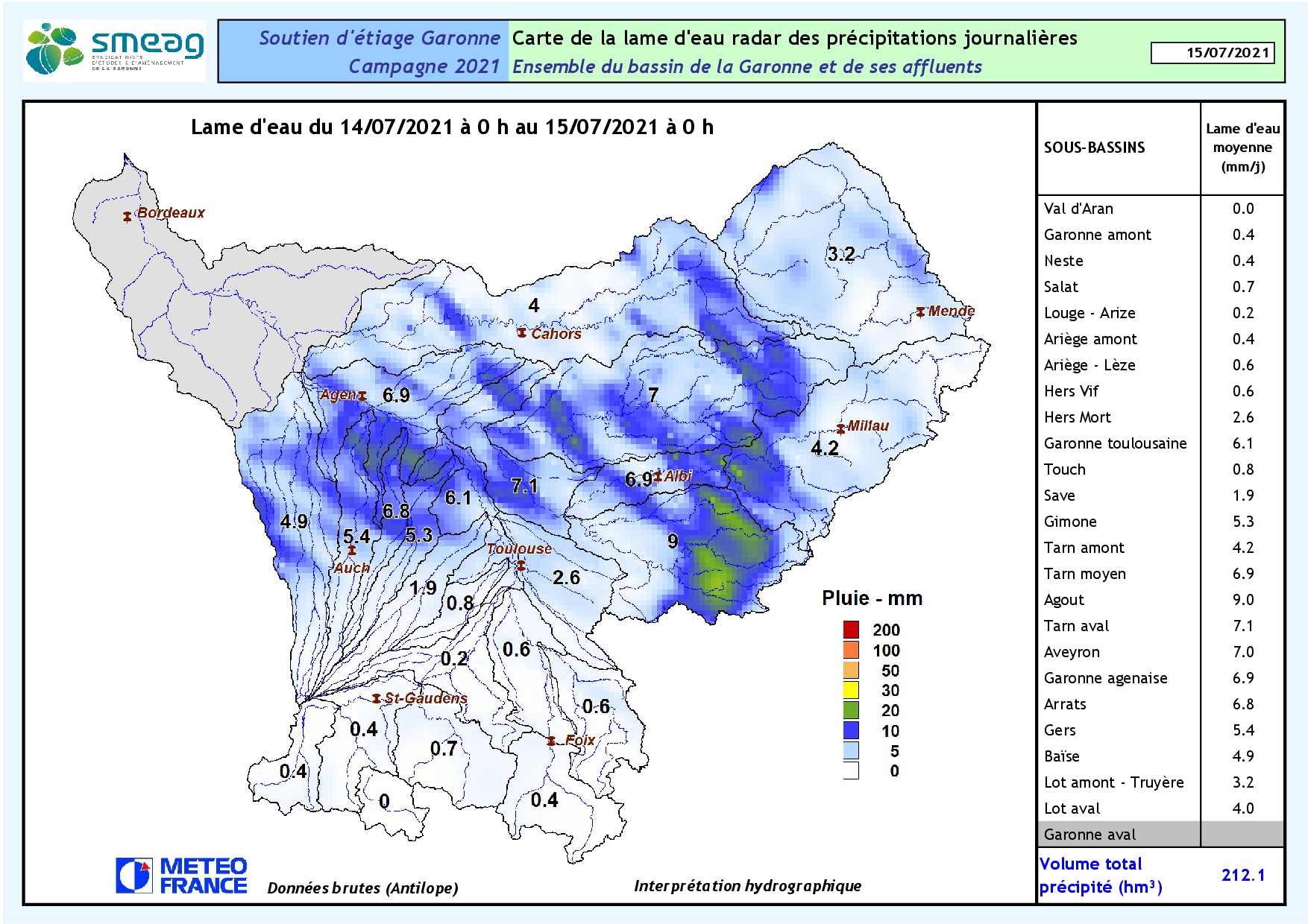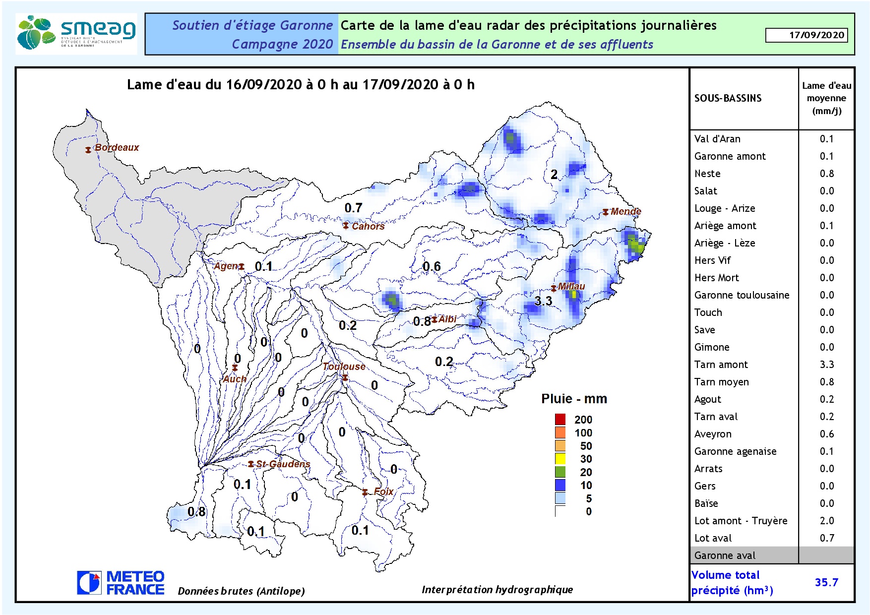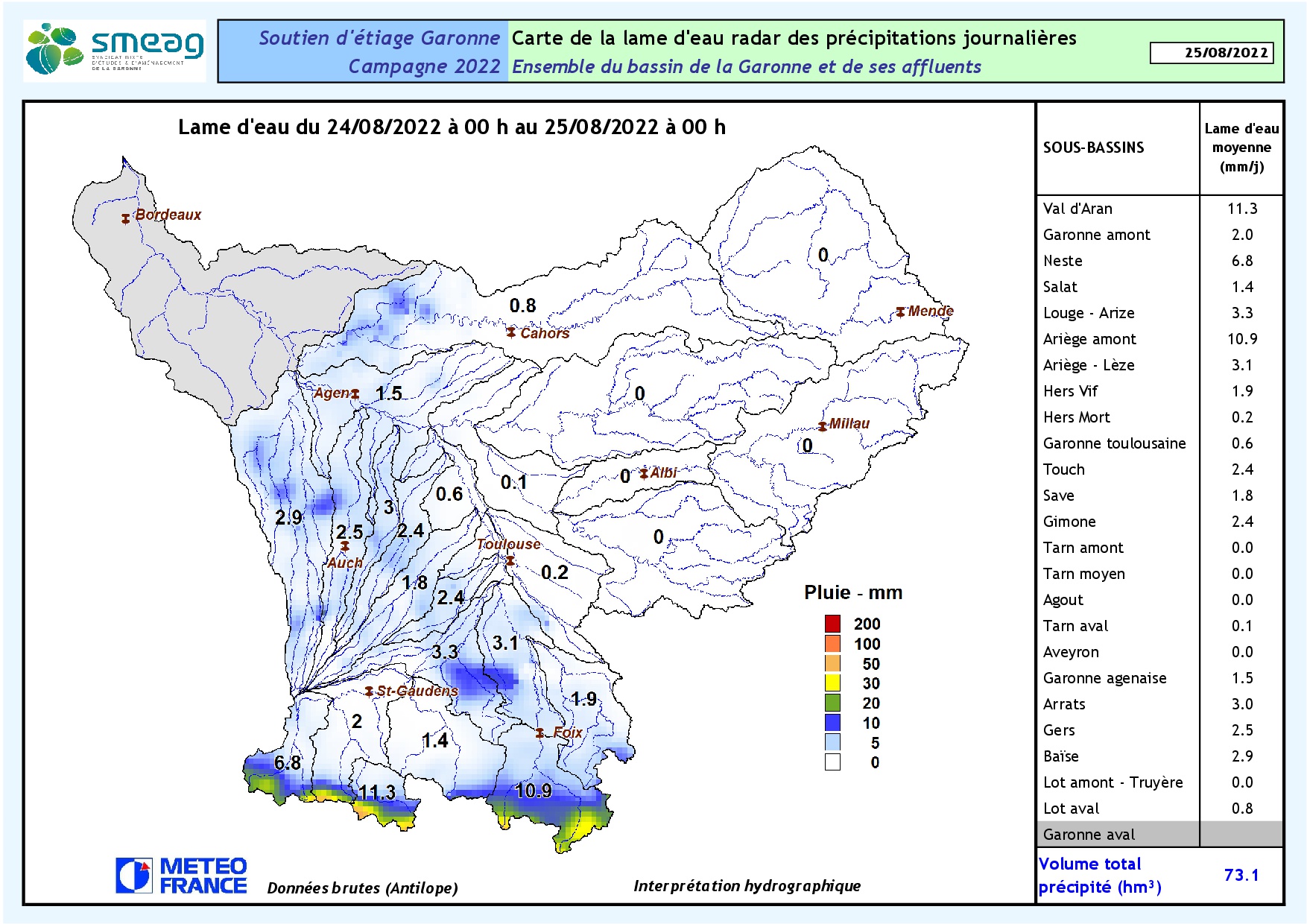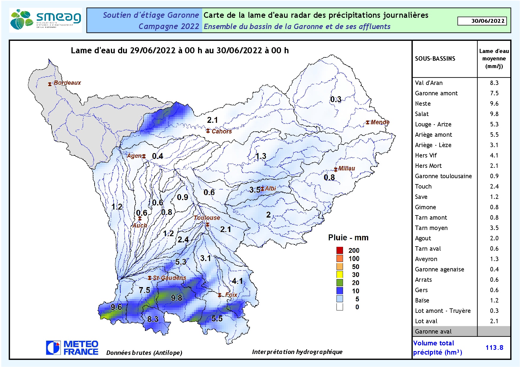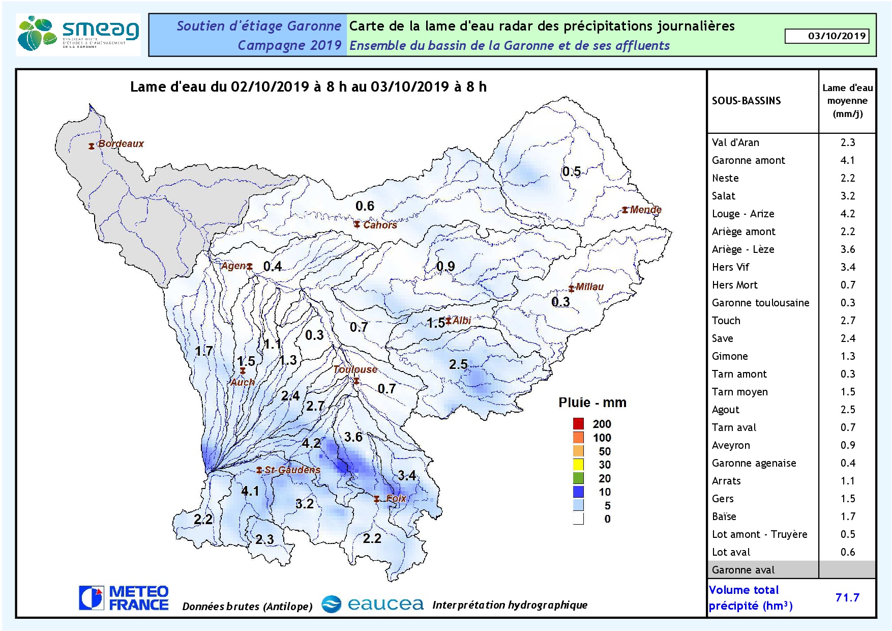 Cette carte illustre les quantités d'eau précipitées sur 24 heures par sous-bassins versants (source : images radar Météo France).