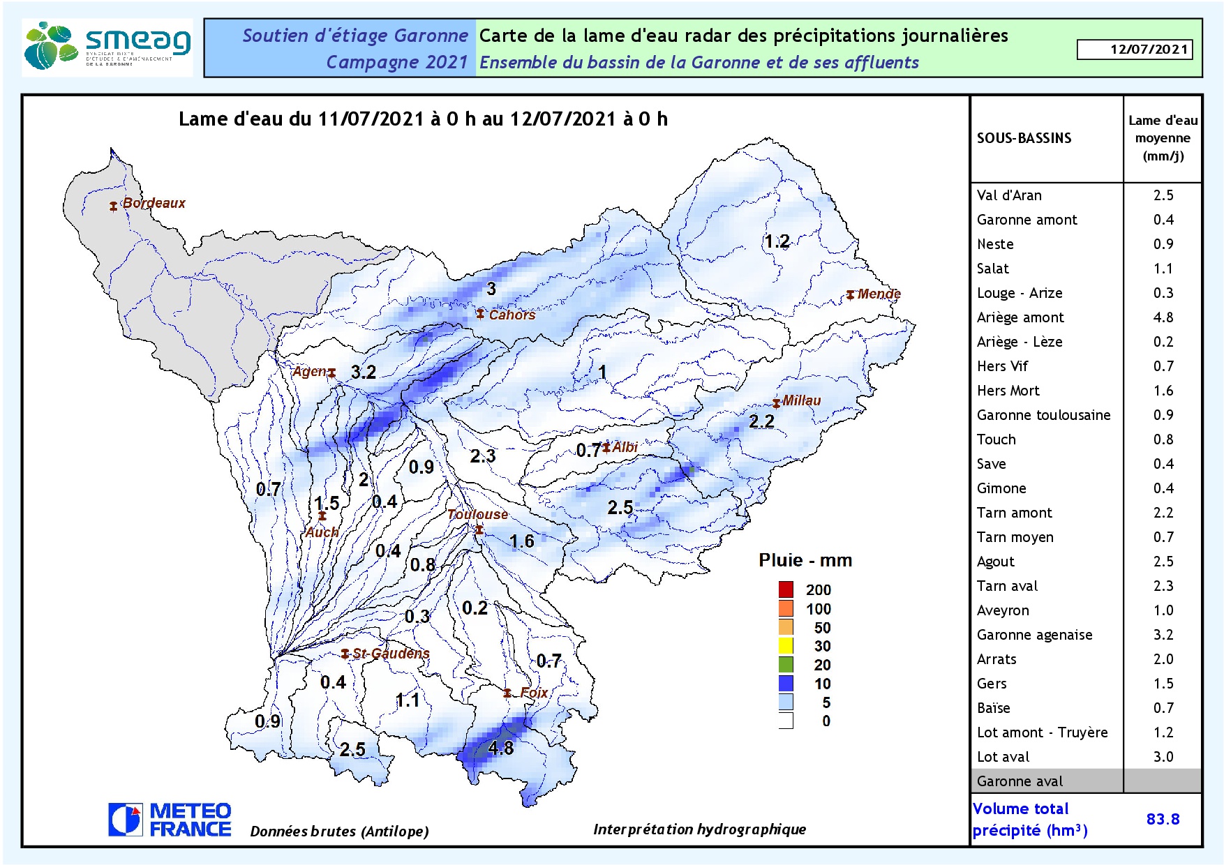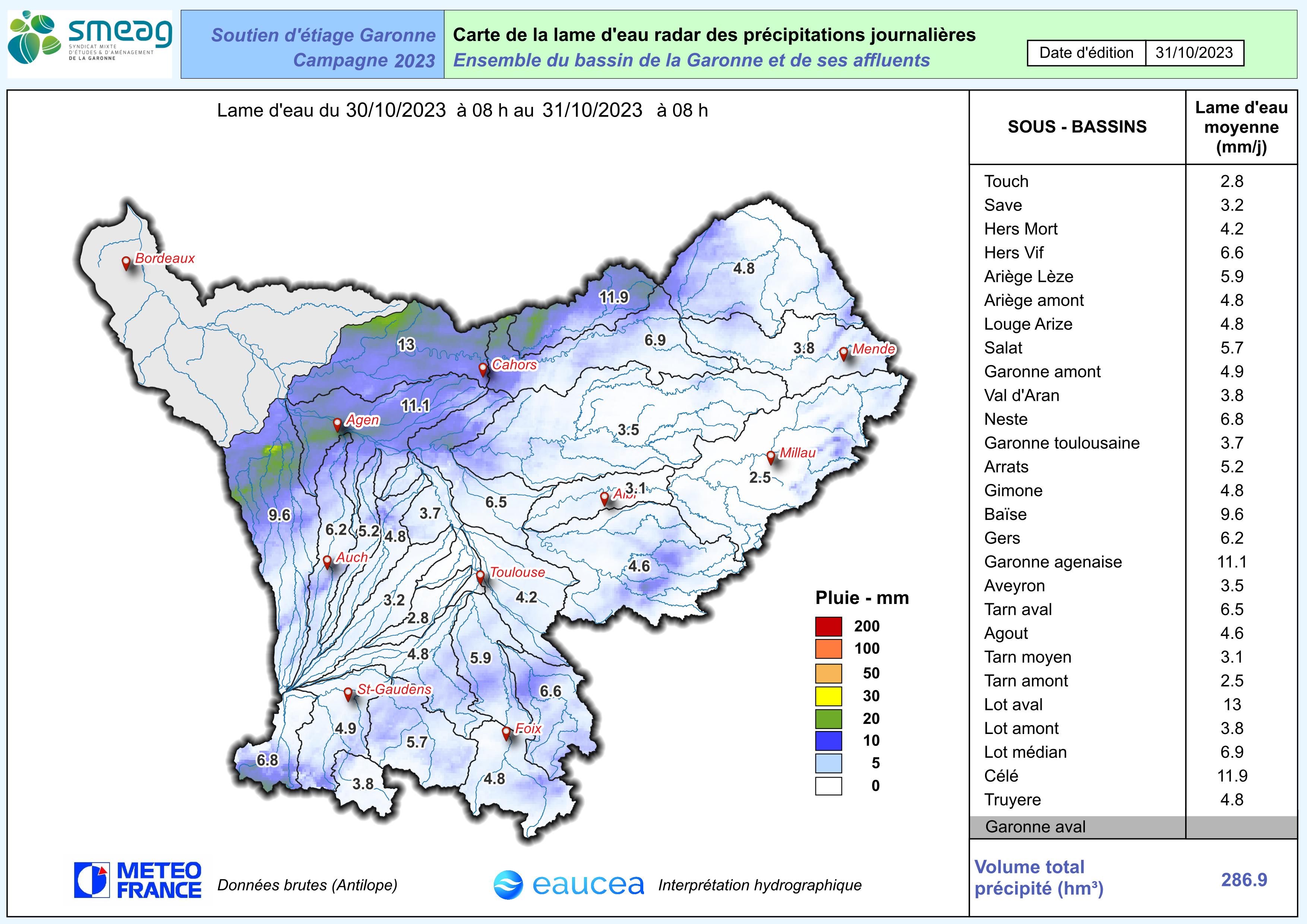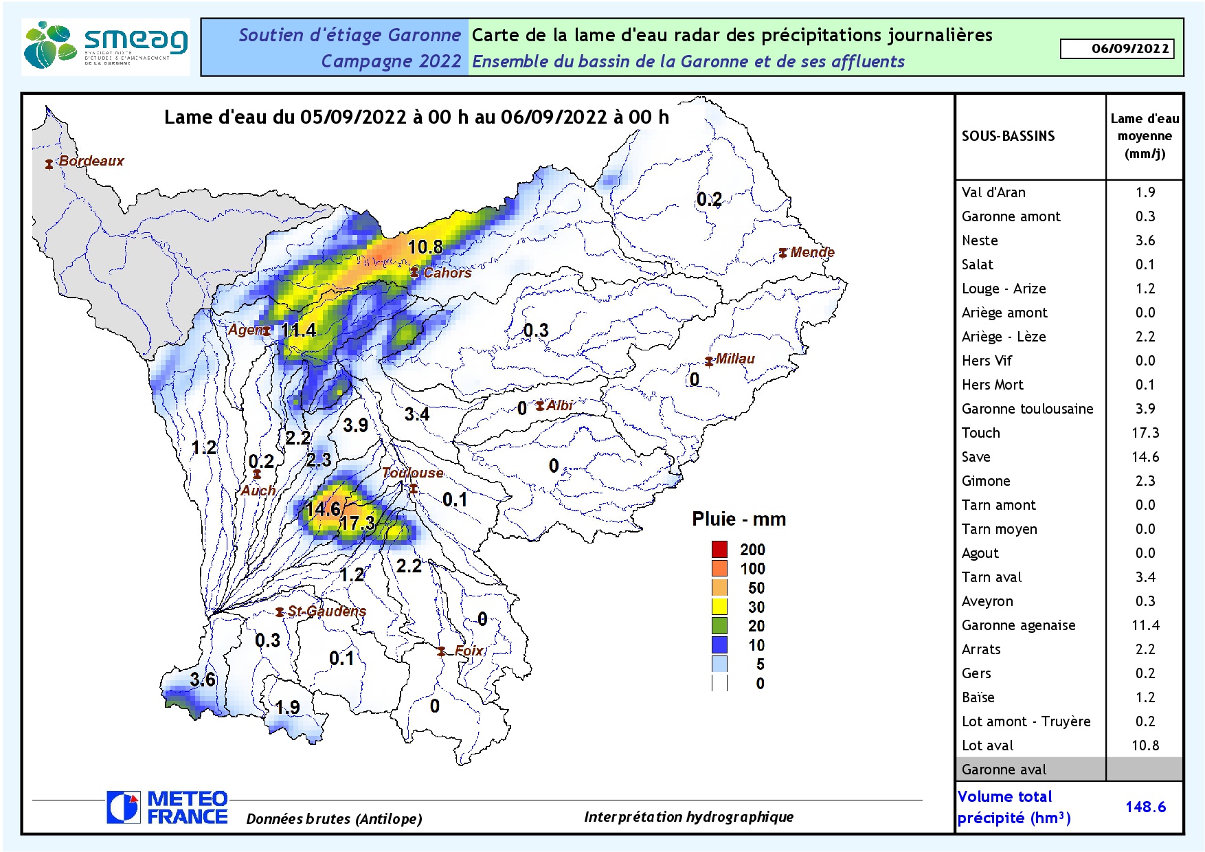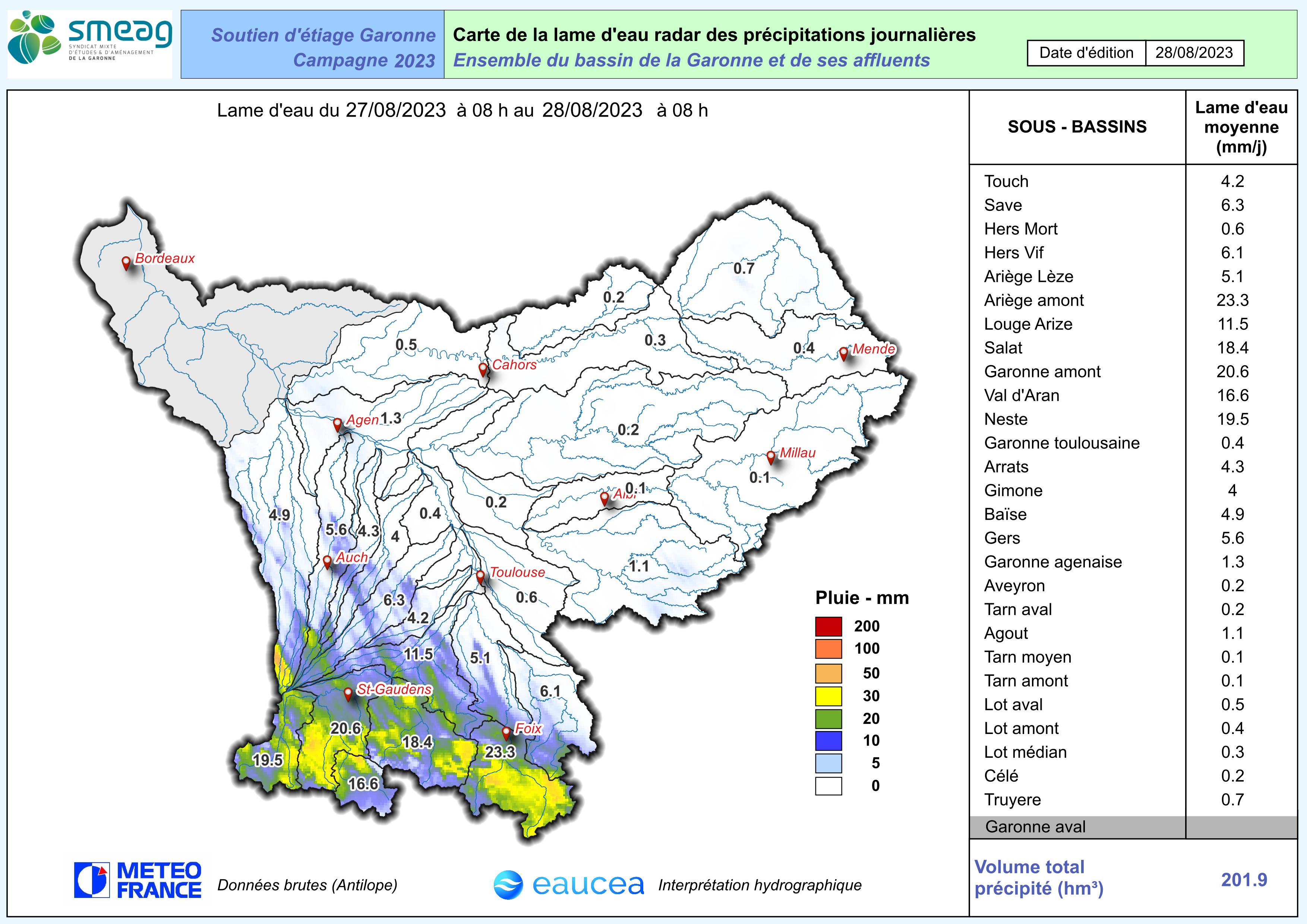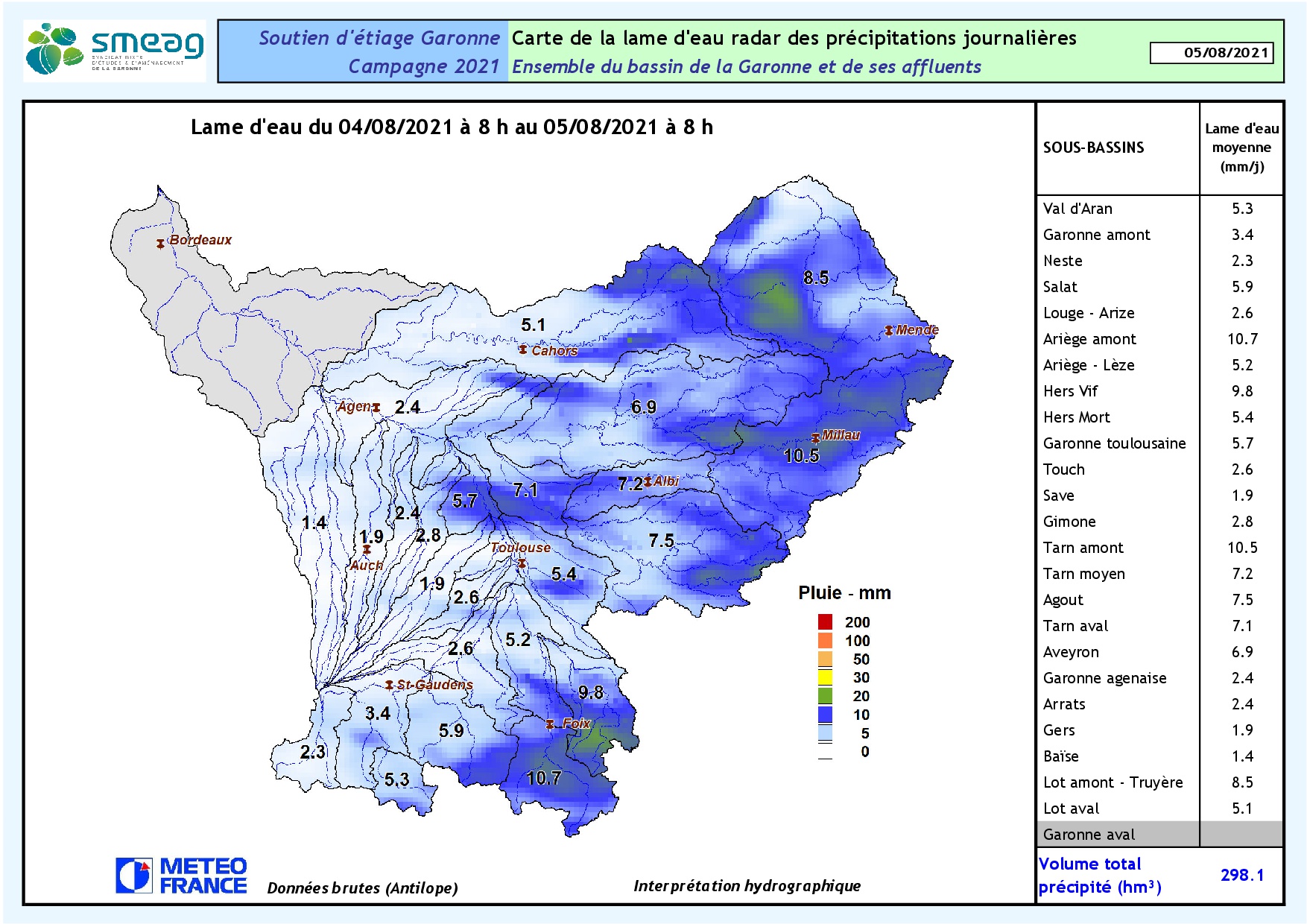 Cette carte illustre les quantités d'eau précipitées sur 24 heures par sous-bassins versants (source : images radar Météo France).