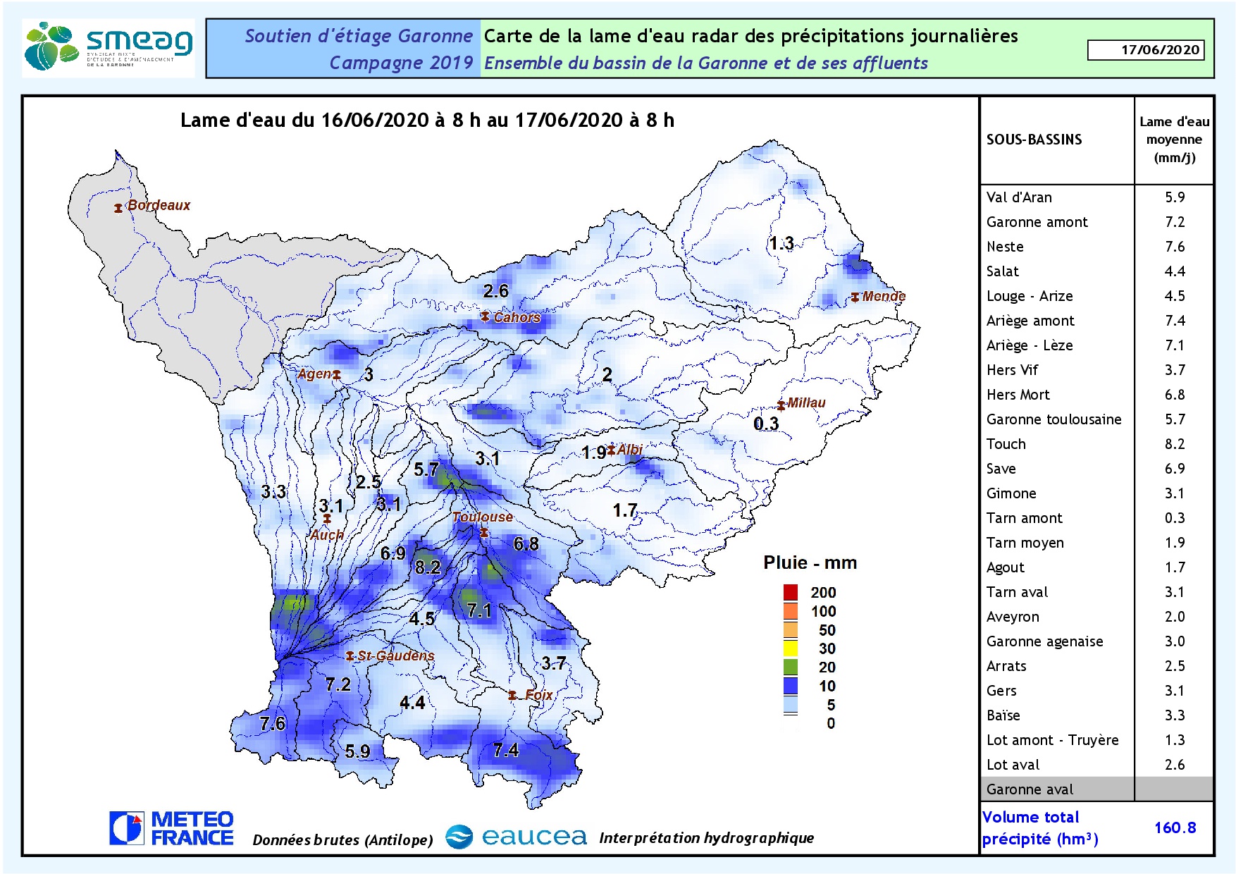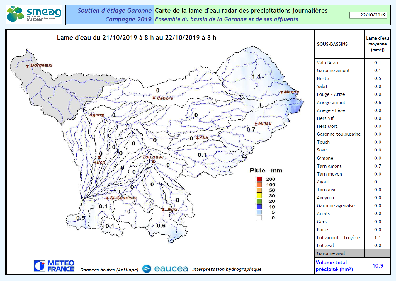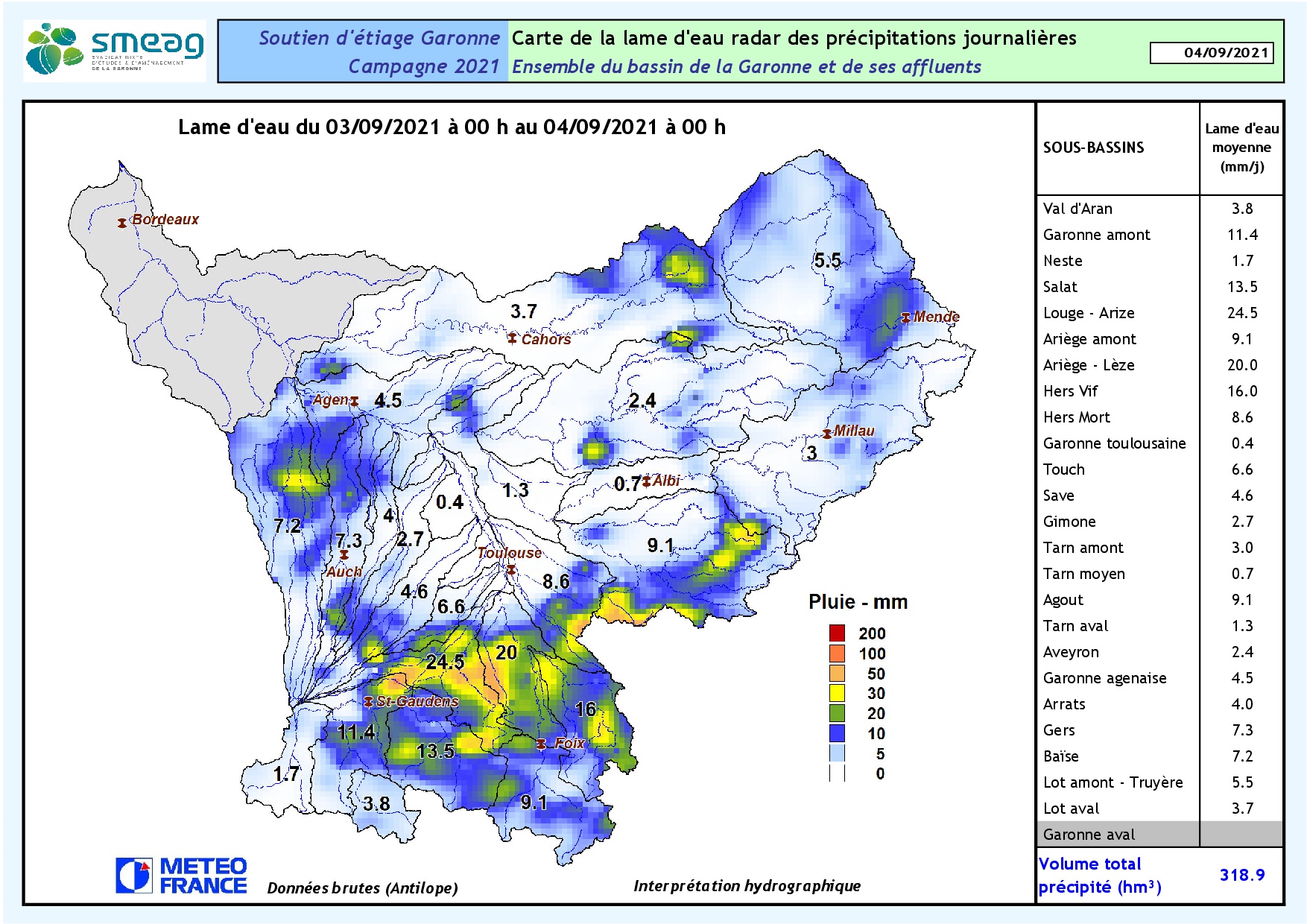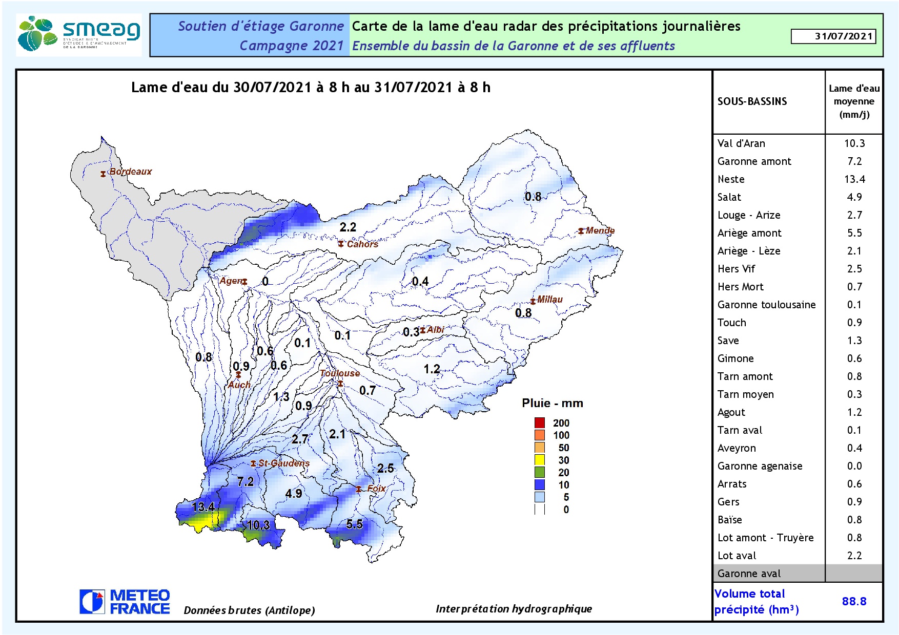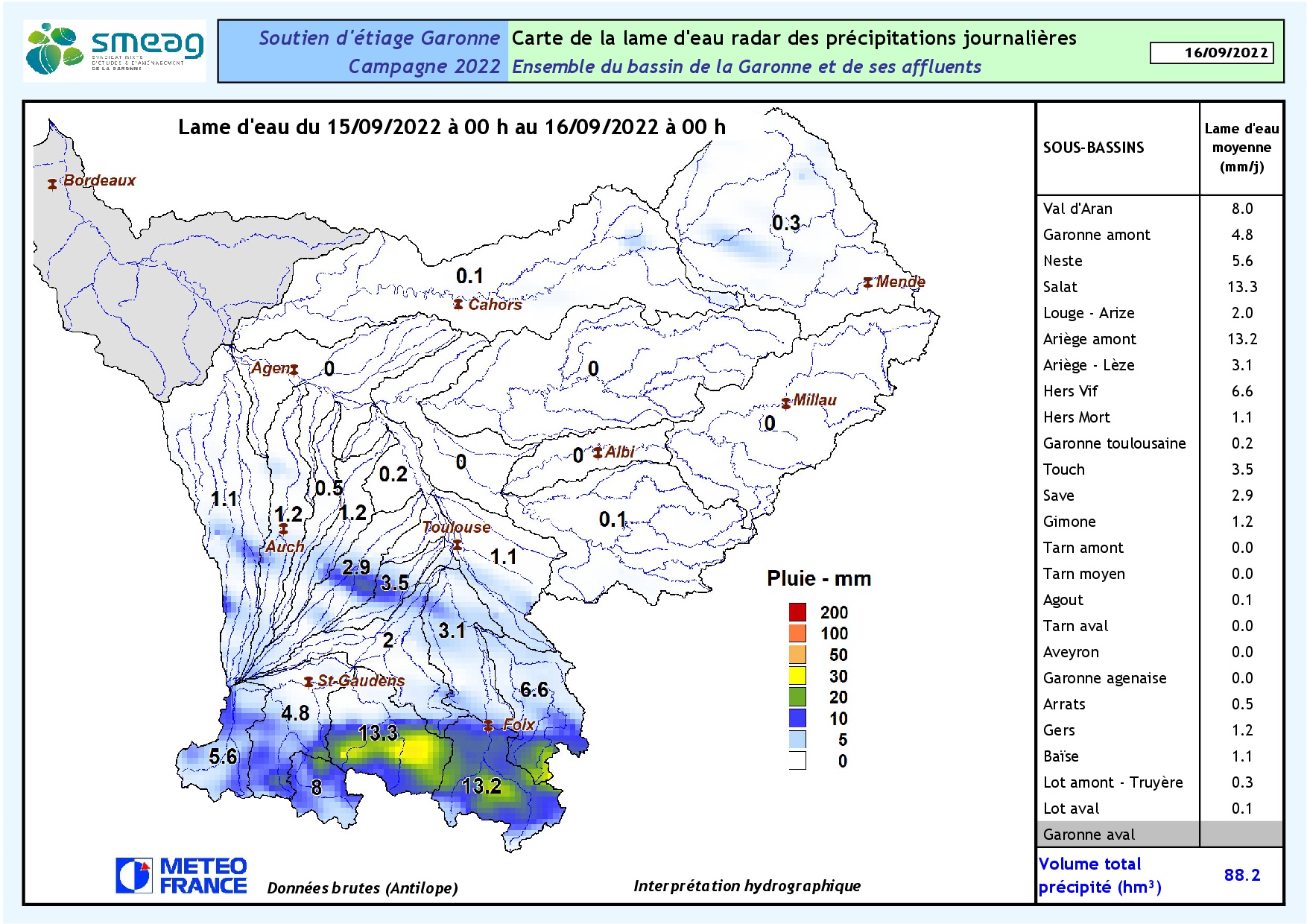 Cette carte illustre les quantités d'eau précipitées sur 24 heures par sous-bassins versants (source : images radar Météo France).