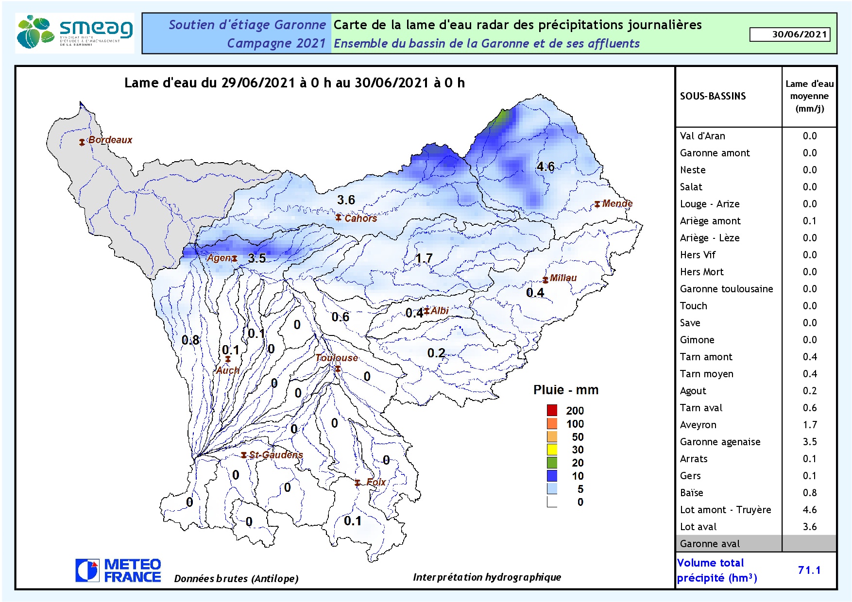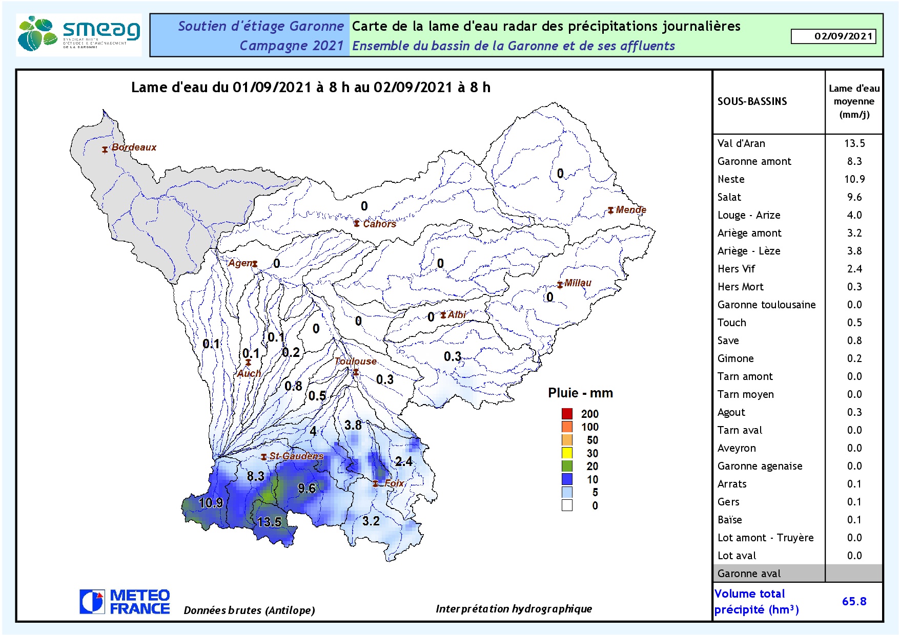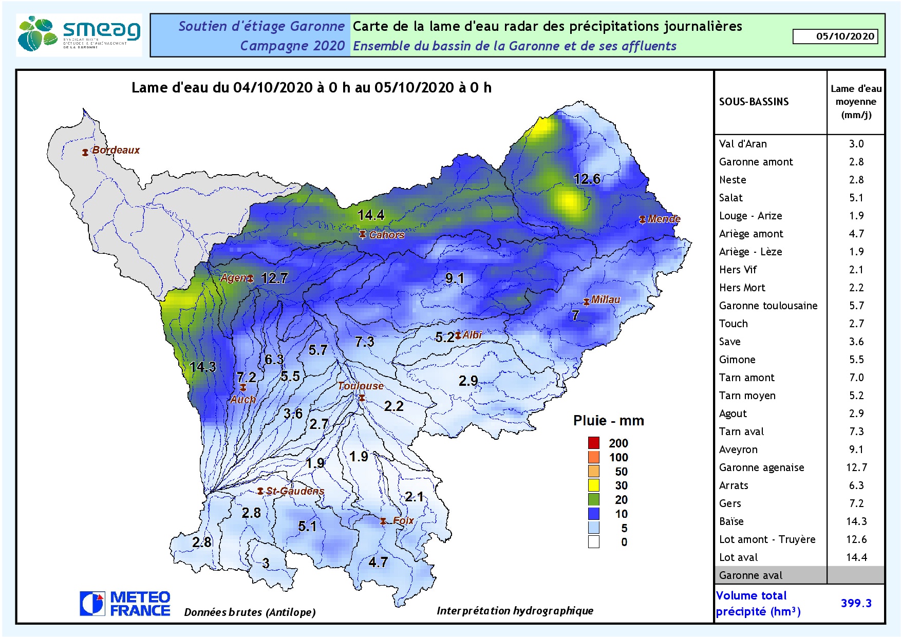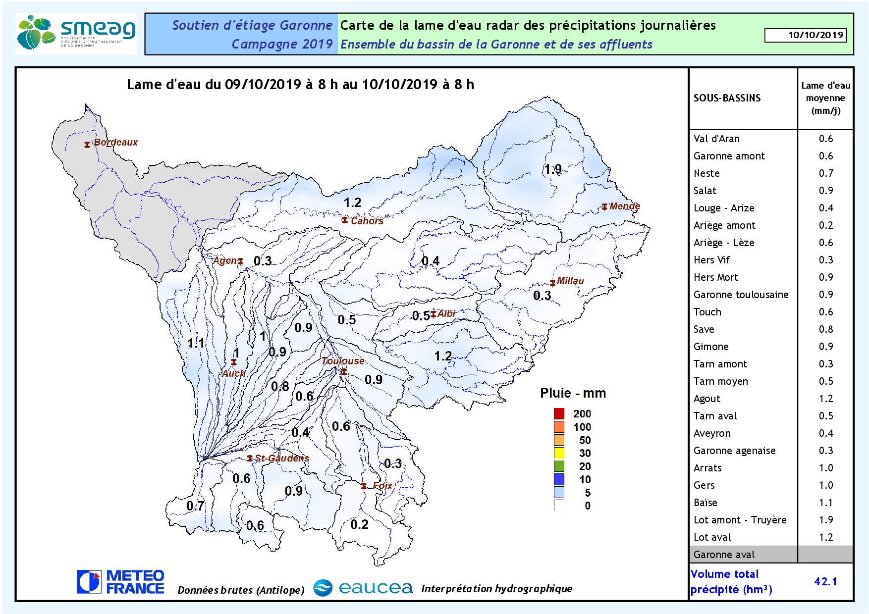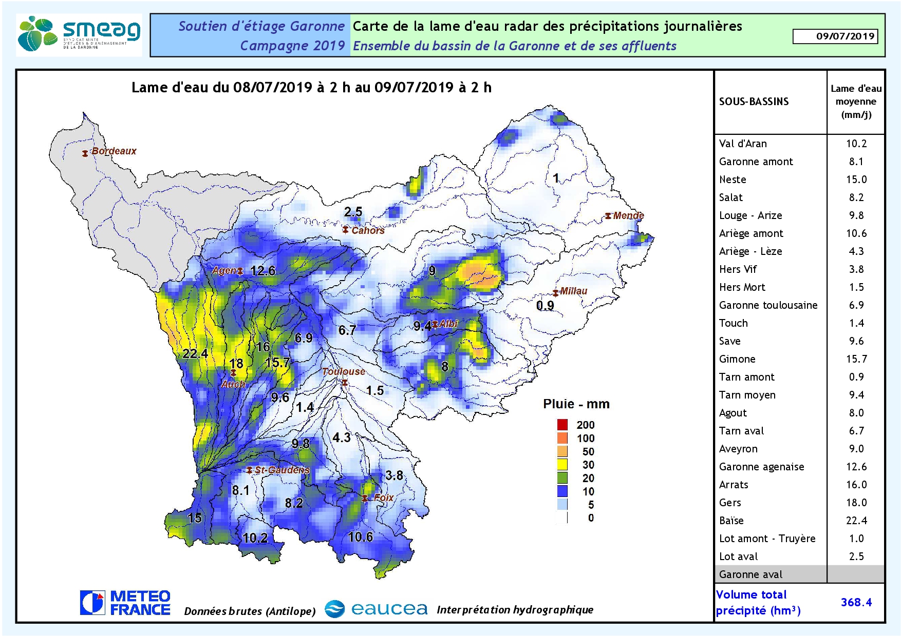 Cette carte illustre les quantités d'eau précipitées sur 24 heures par sous-bassins versants (source : images radar Météo France).