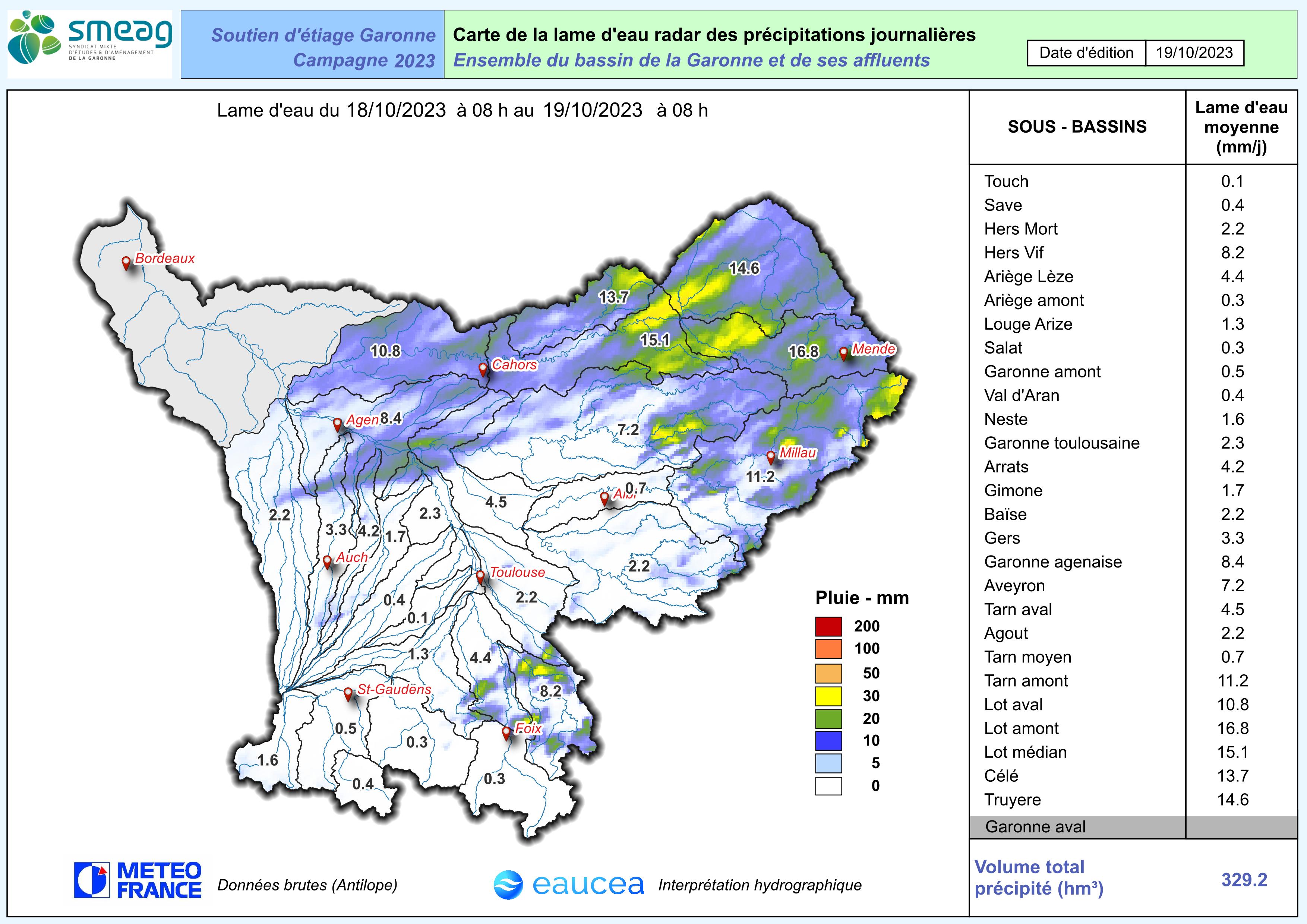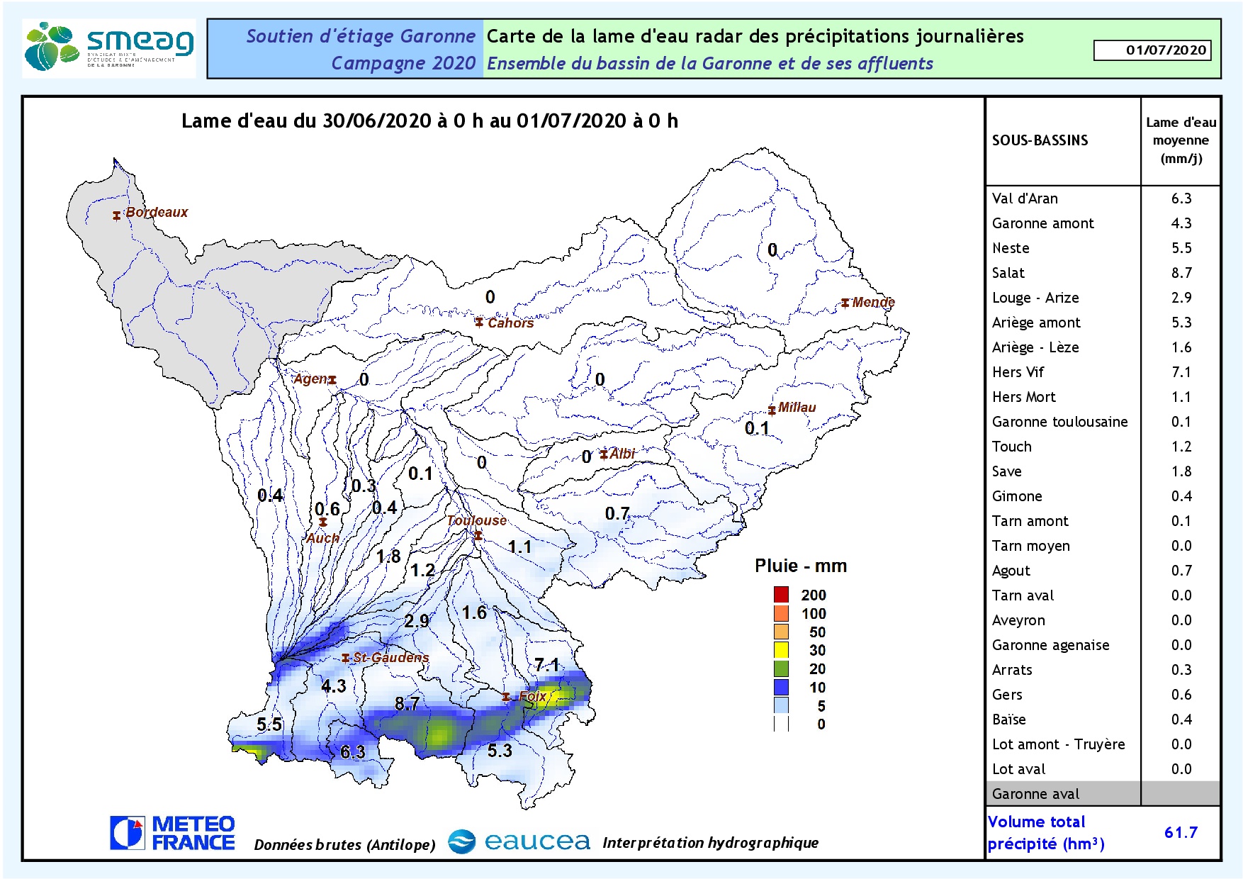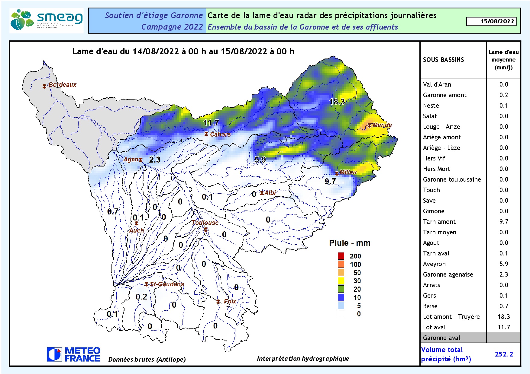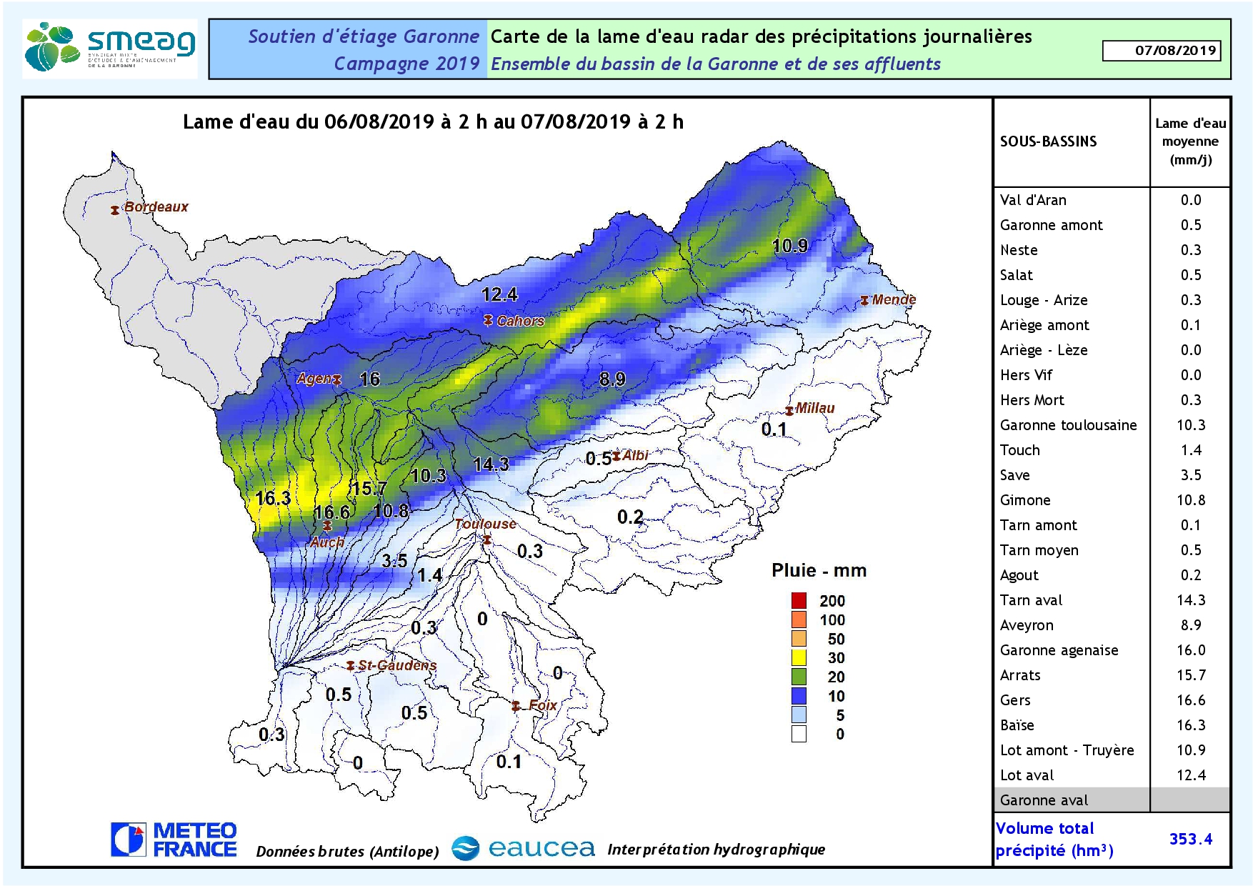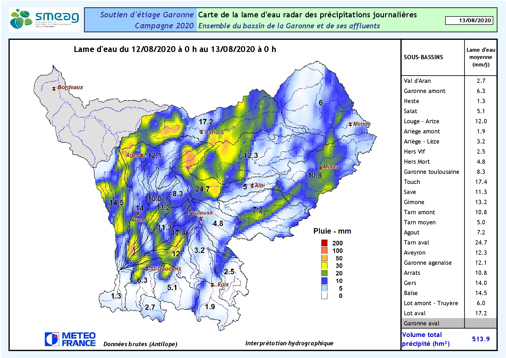 Cette carte illustre les quantités d'eau précipitées sur 24 heures par sous-bassins versants (source : images radar Météo France).