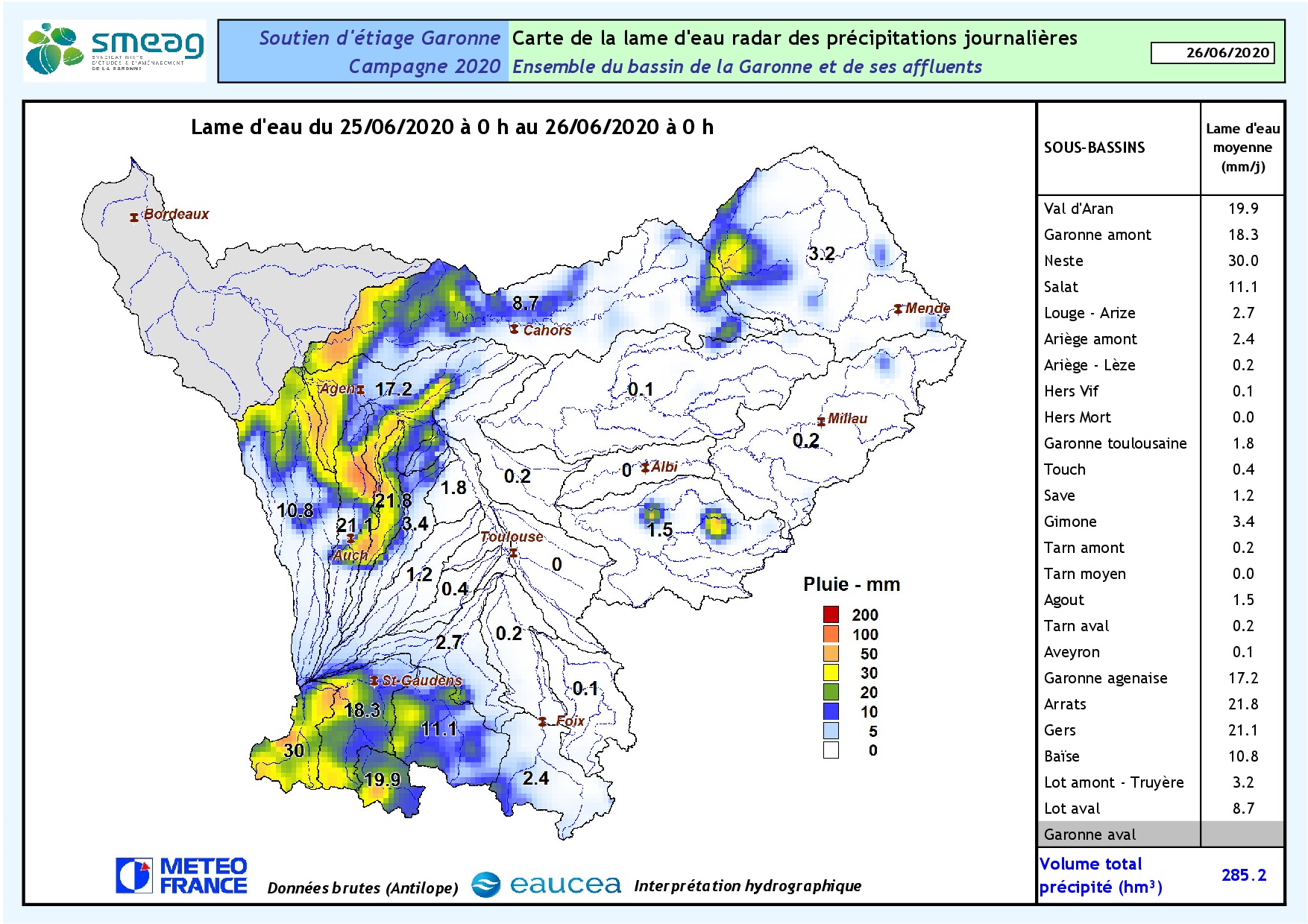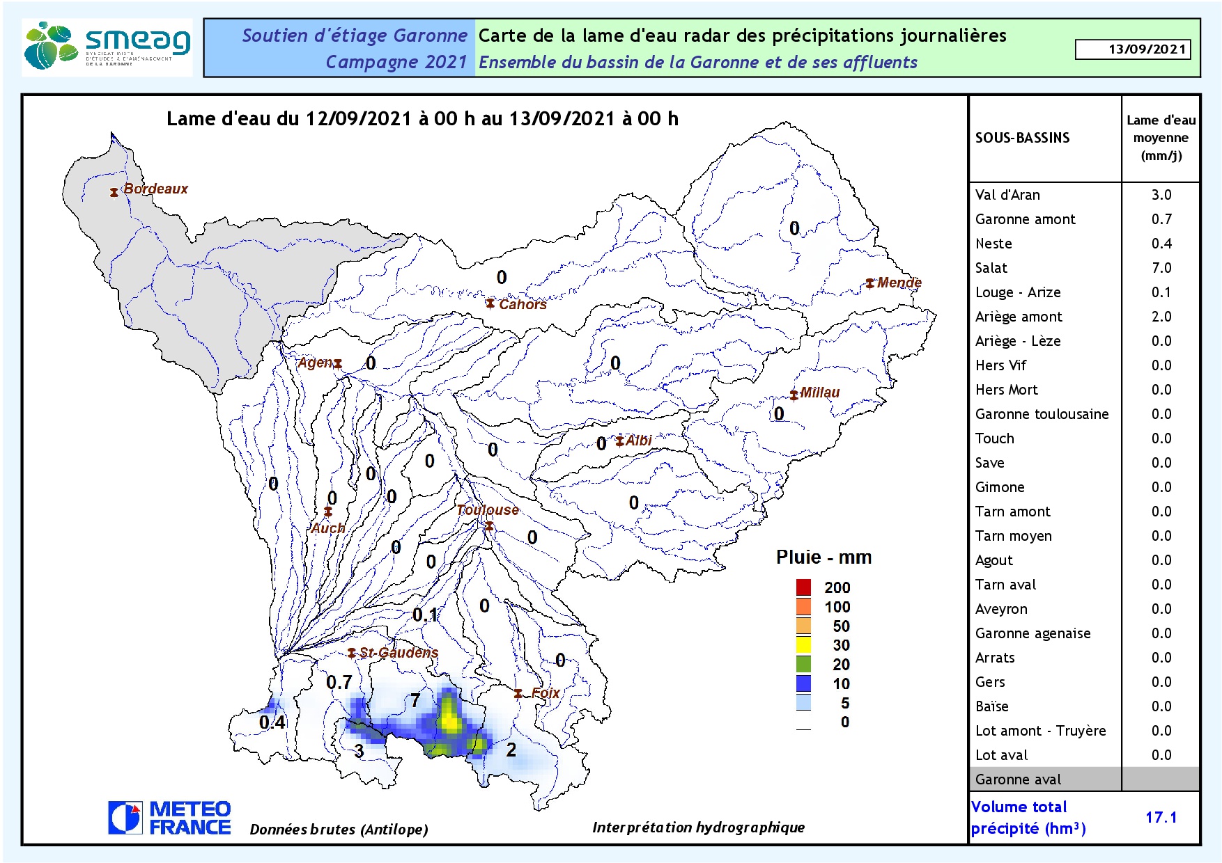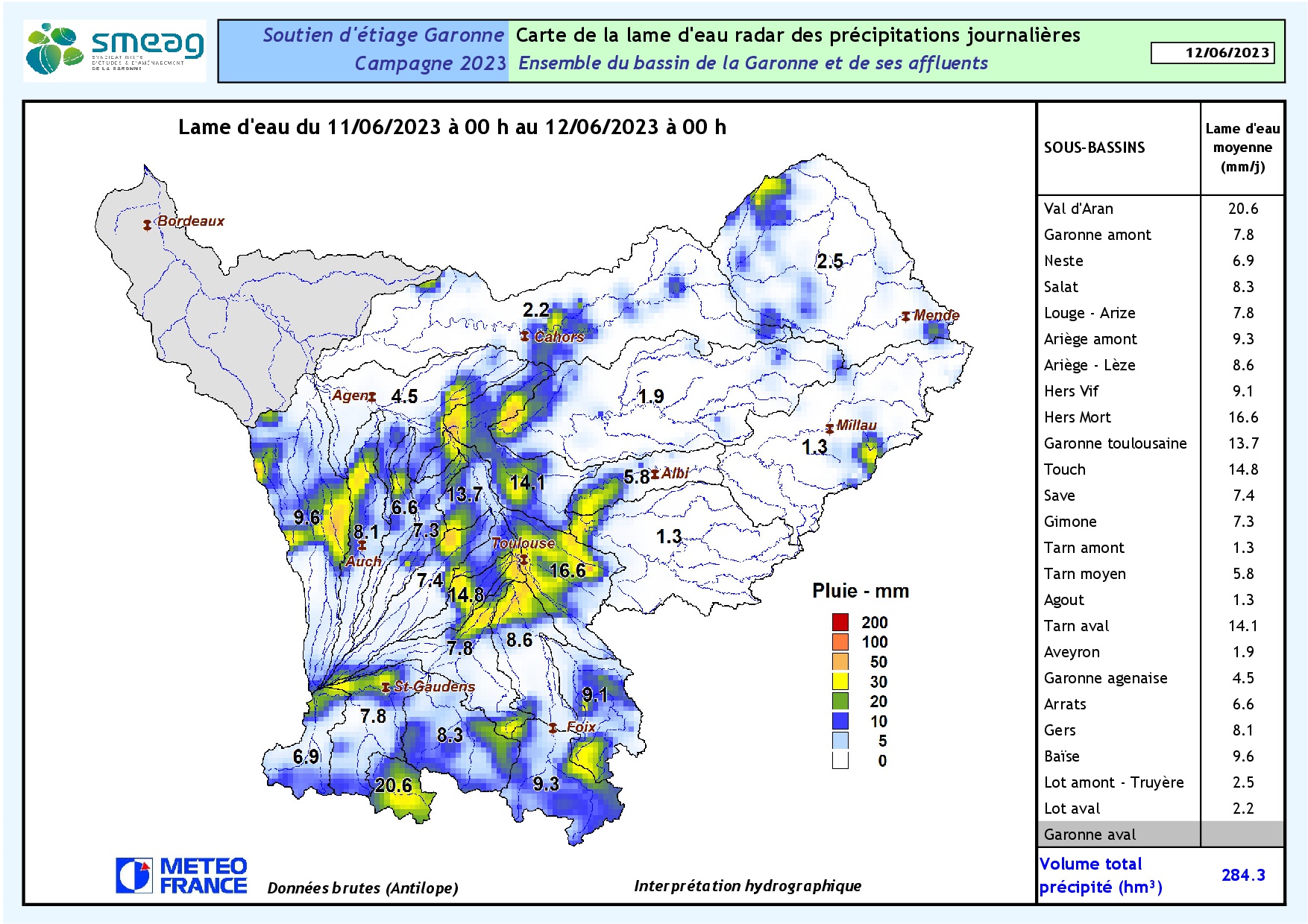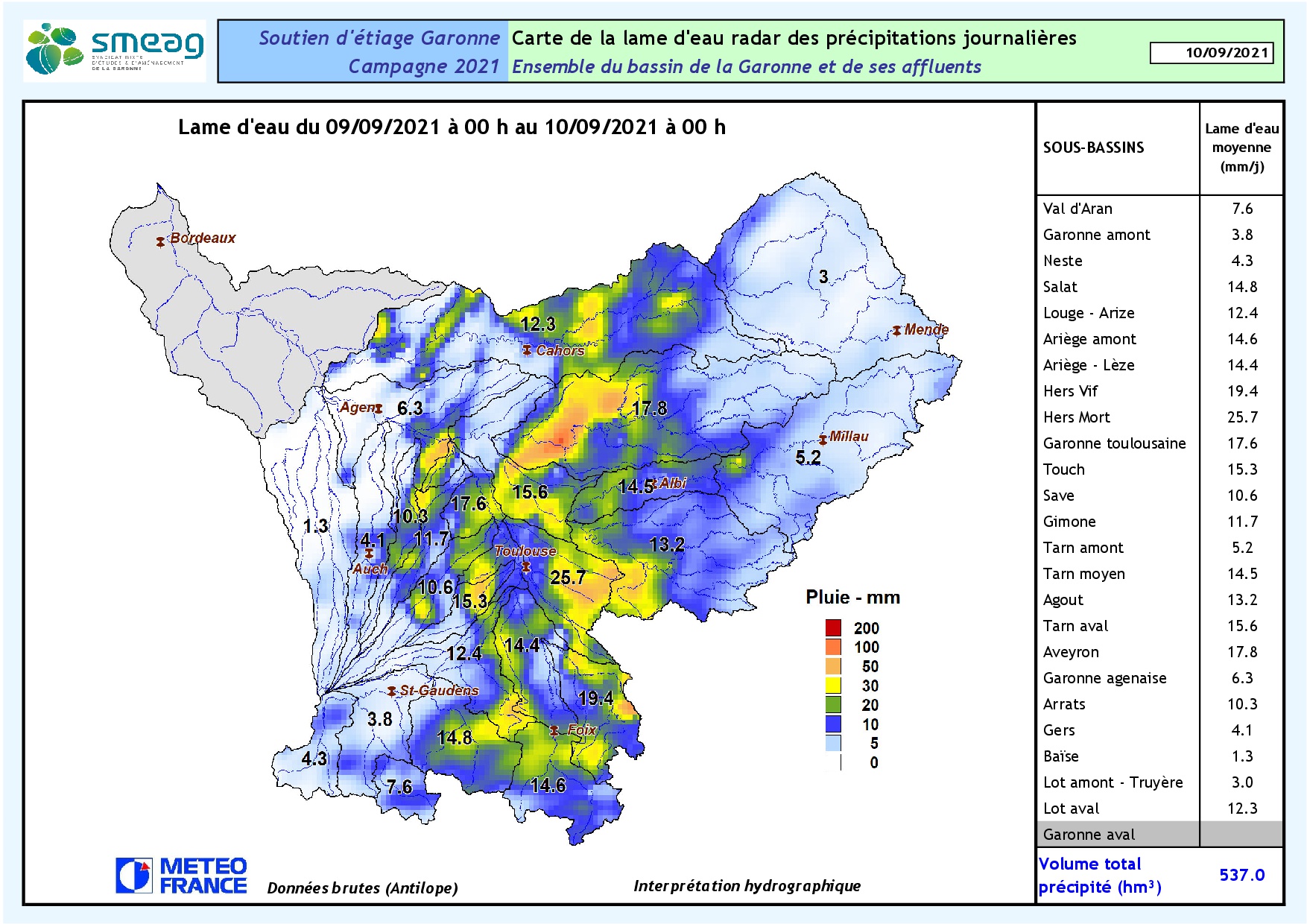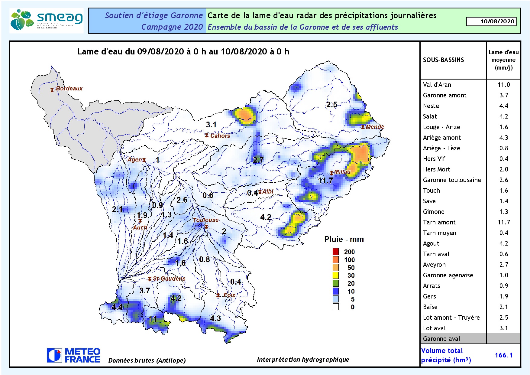 Cette carte illustre les quantités d'eau précipitées sur 24 heures par sous-bassins versants (source : images radar Météo France).