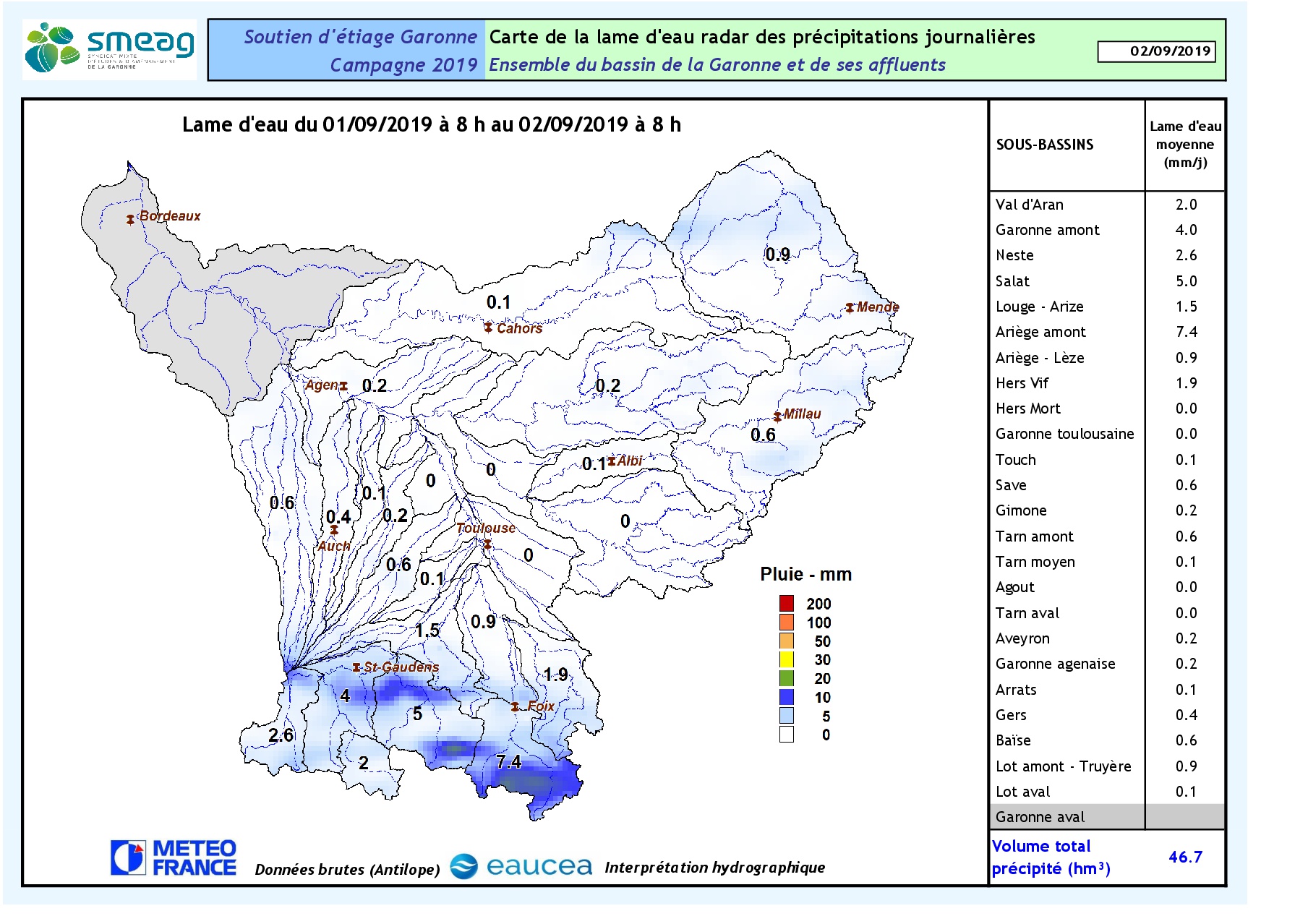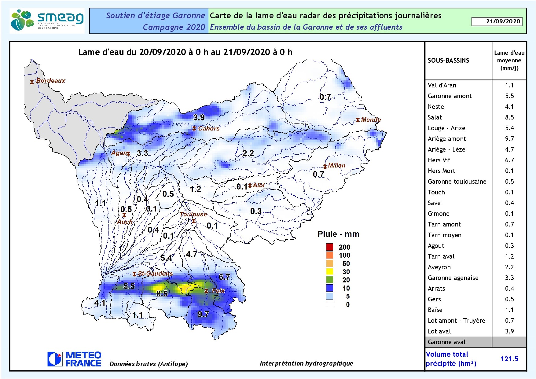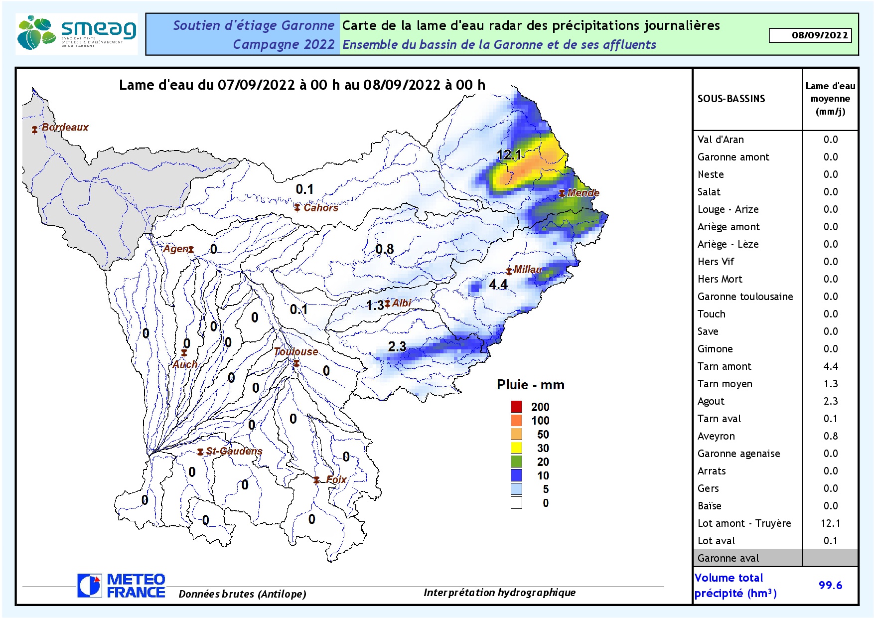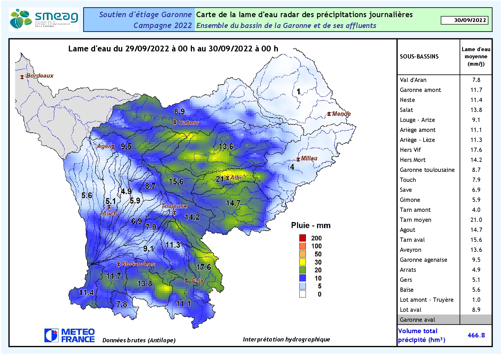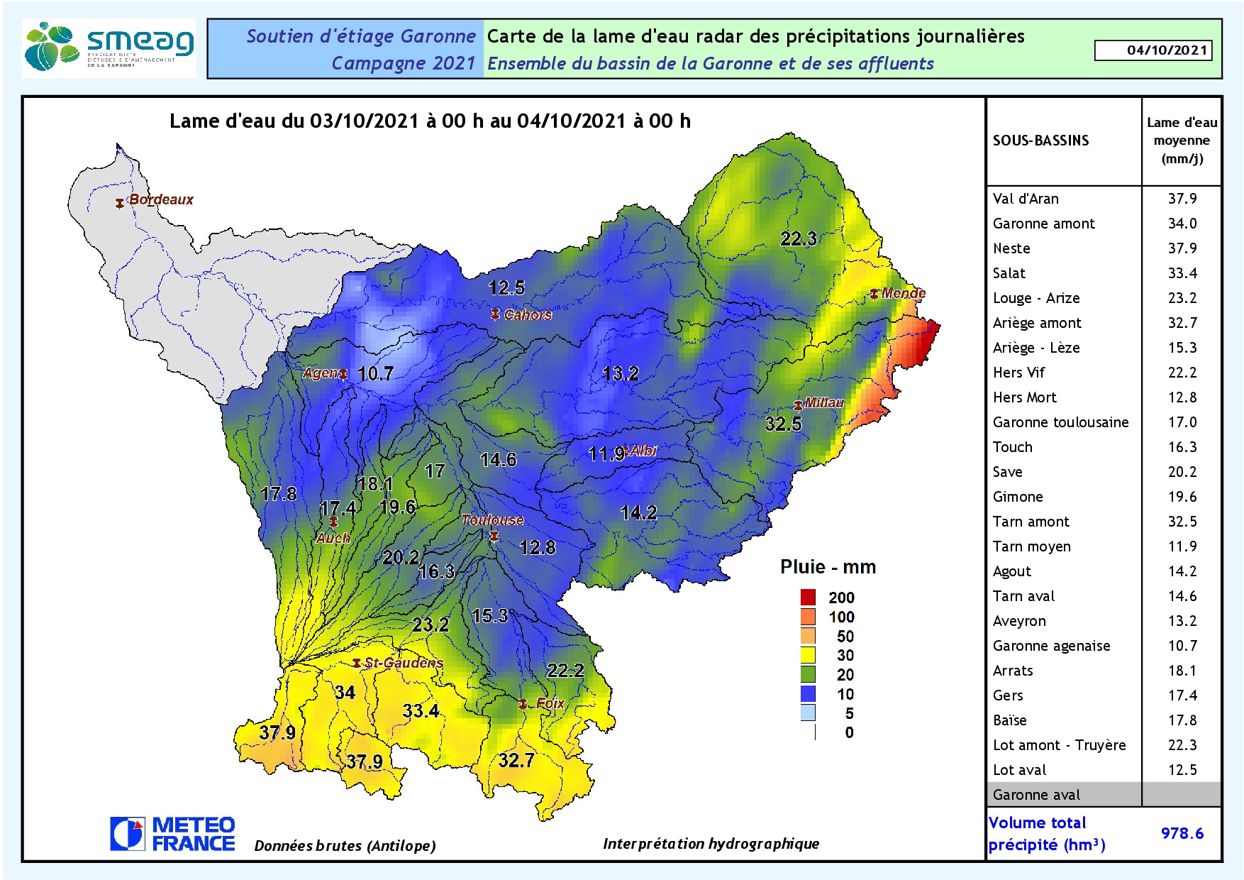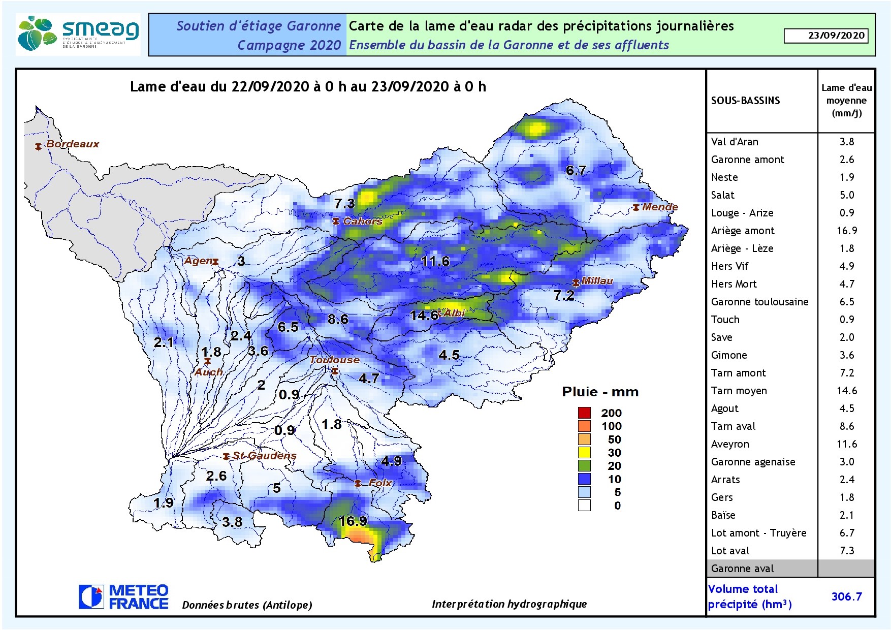 Cette carte illustre les quantités d'eau précipitées sur 24 heures par sous-bassins versants (source : images radar Météo France).