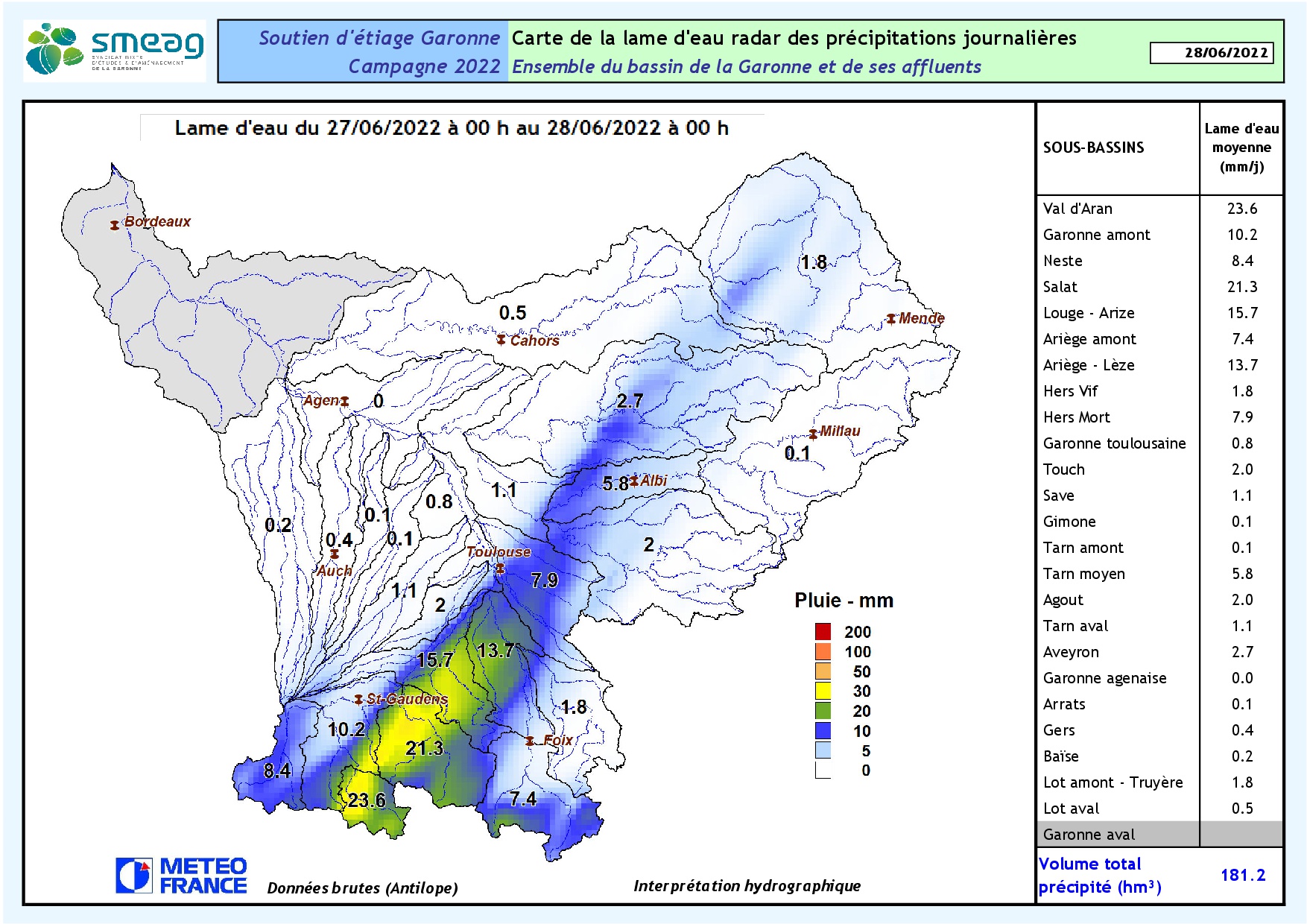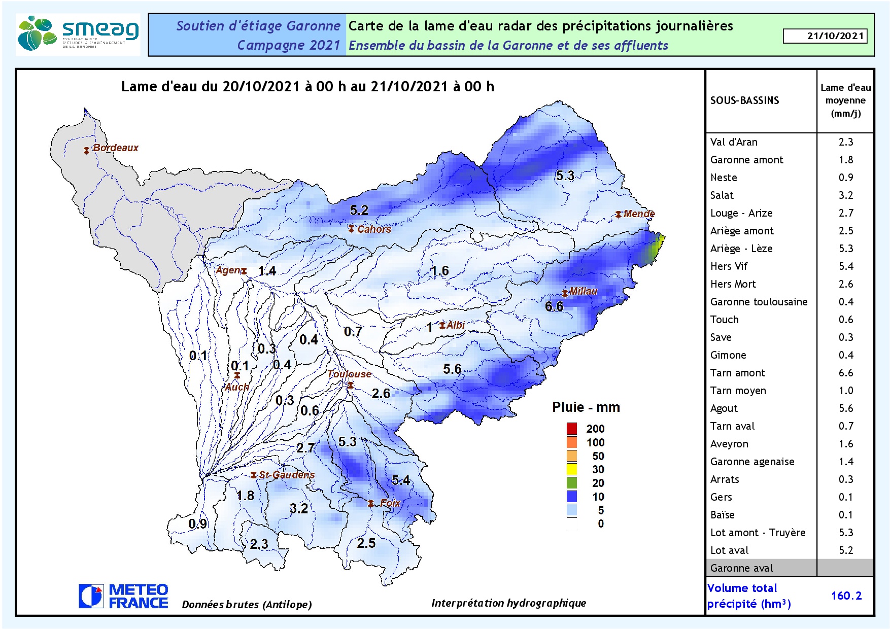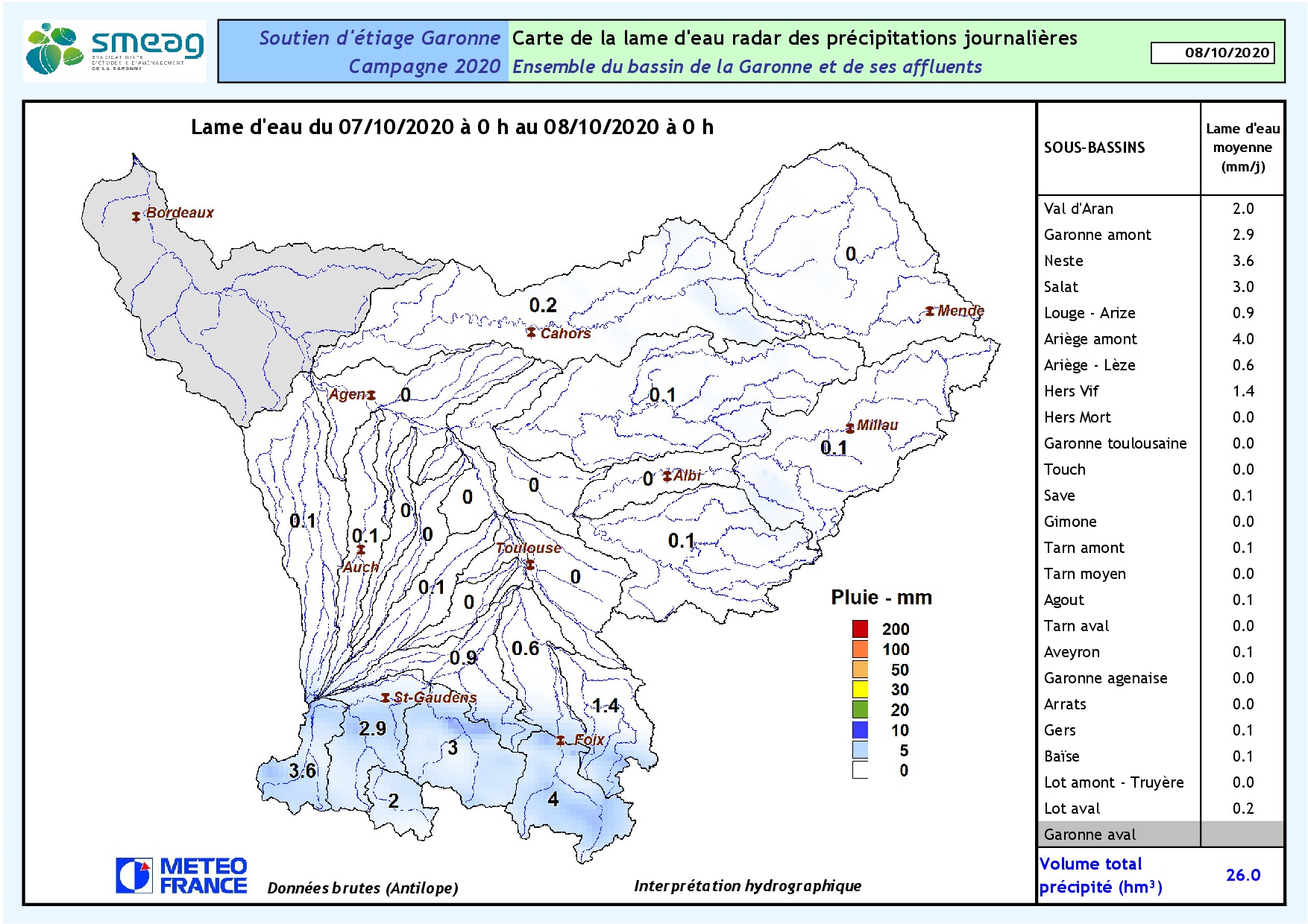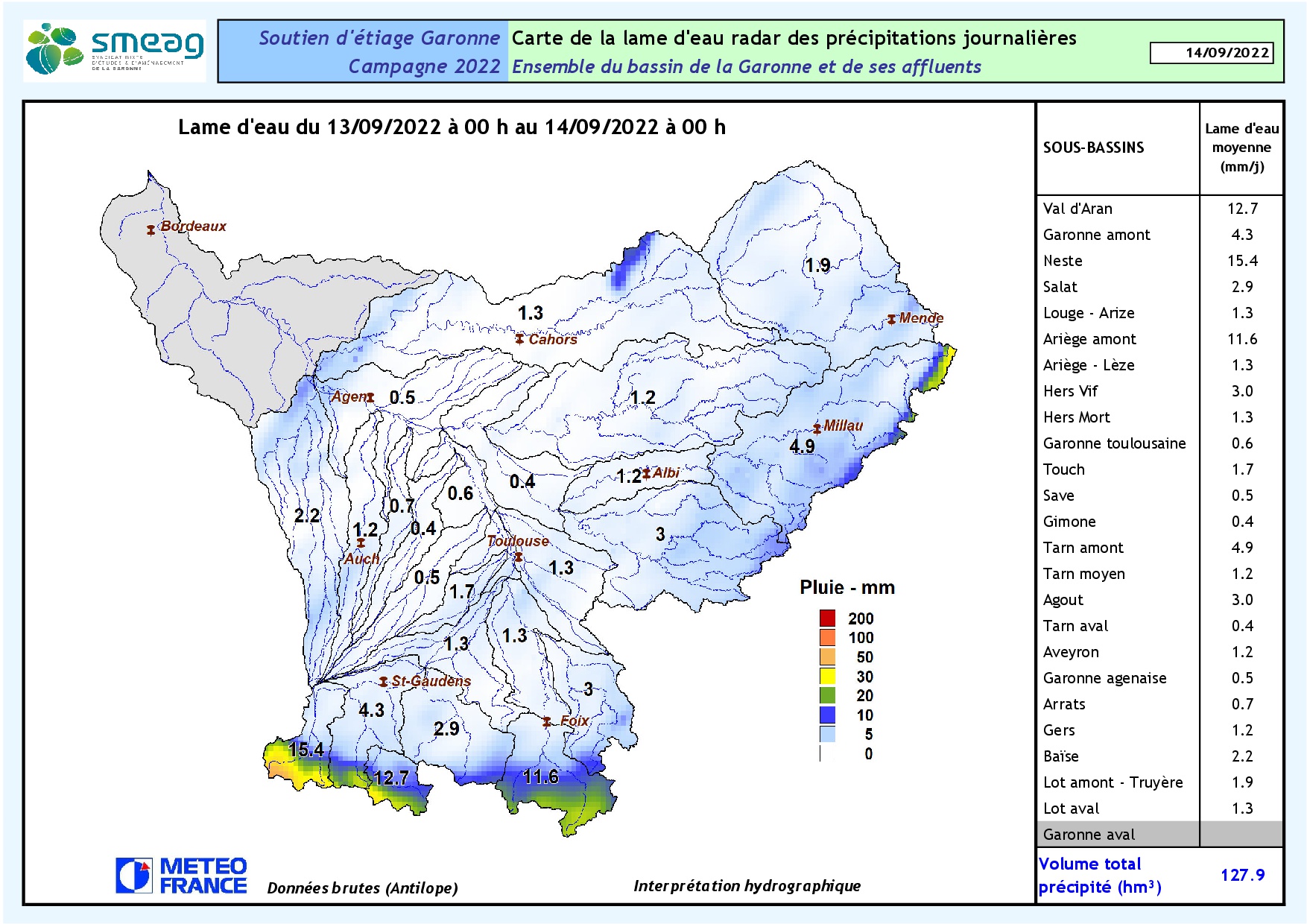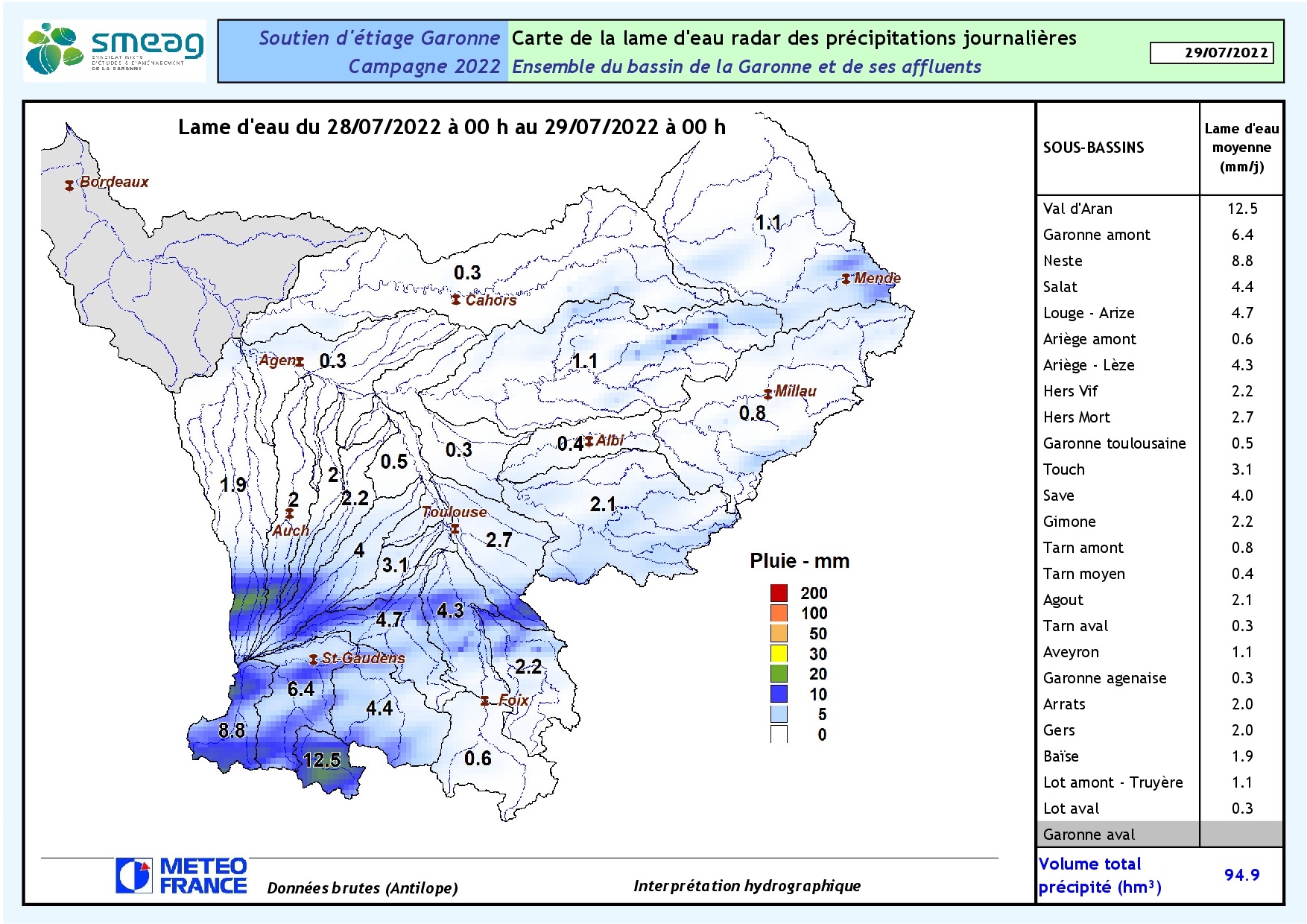 Cette carte illustre les quantités d'eau précipitées sur 24 heures par sous-bassins versants (source : images radar Météo France).