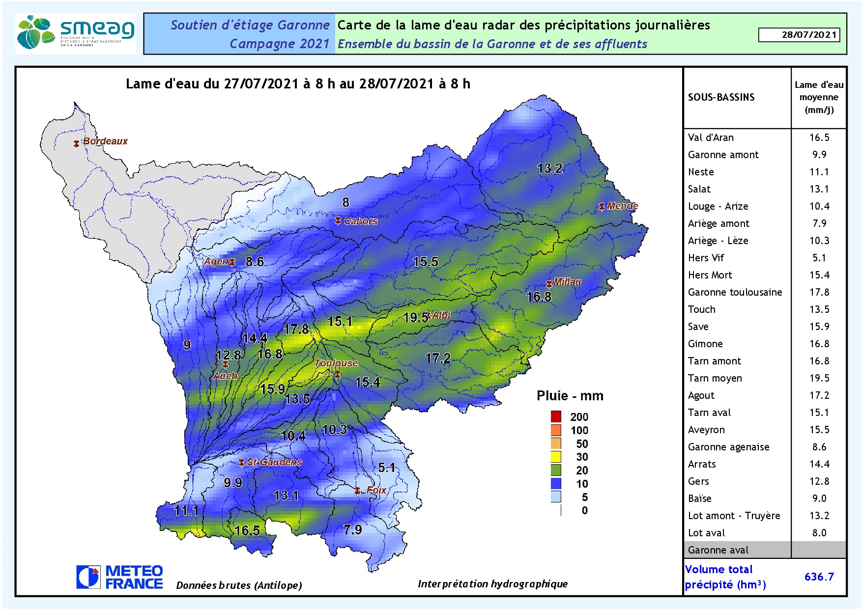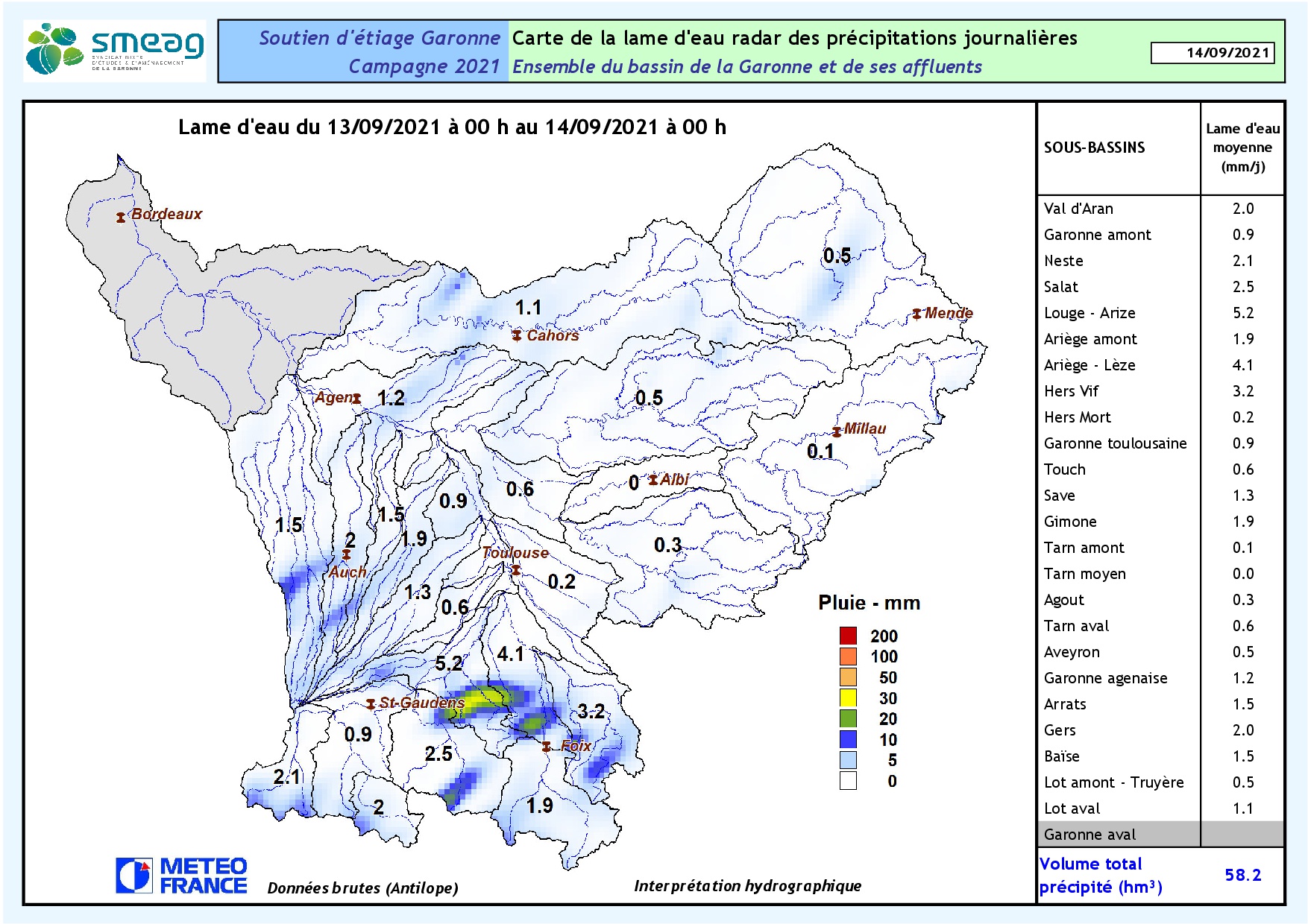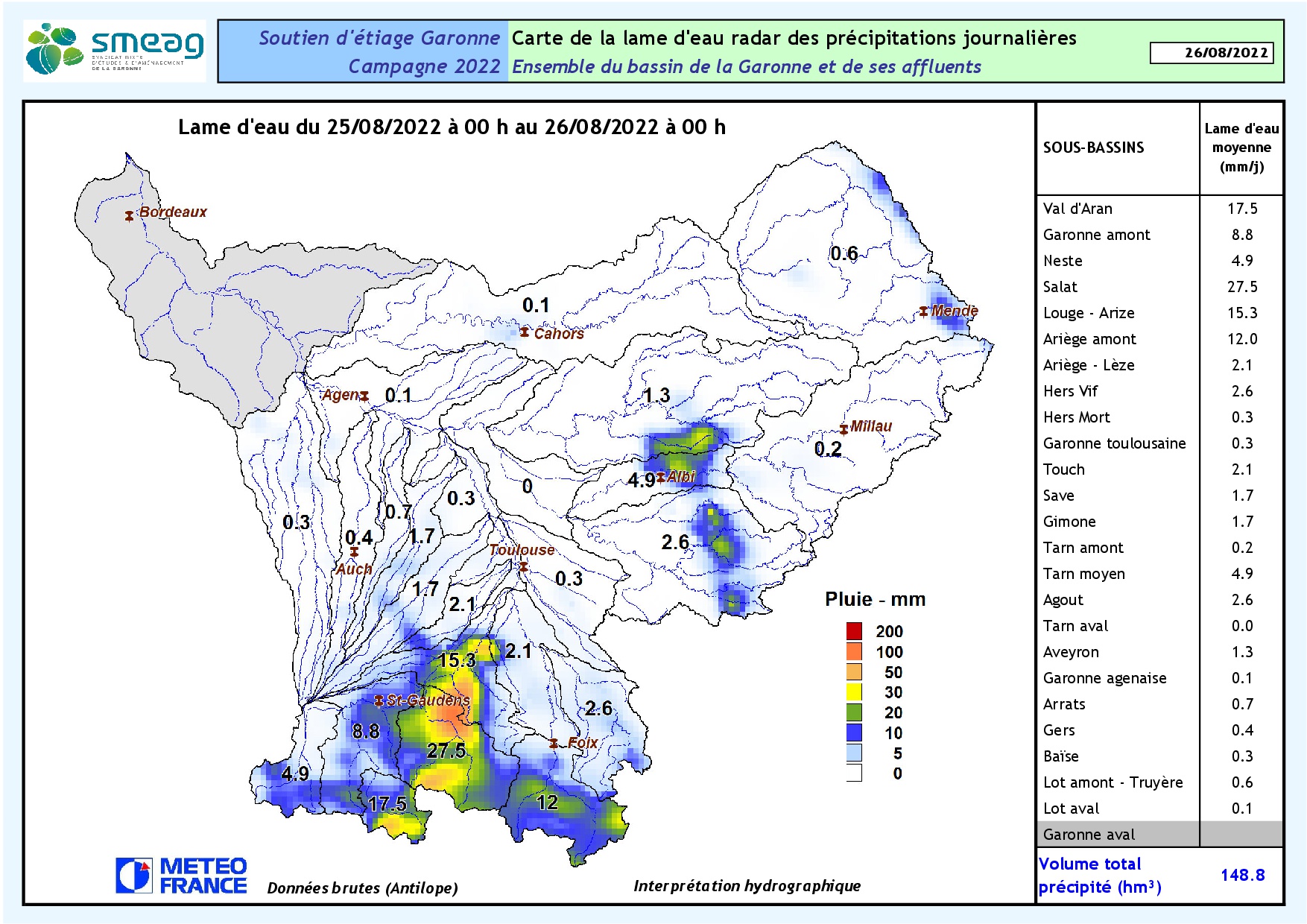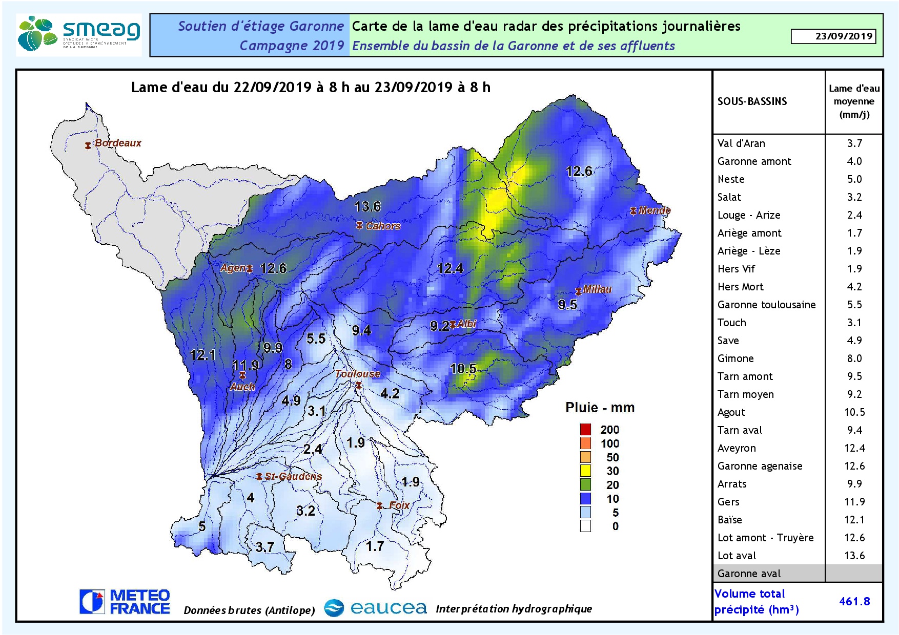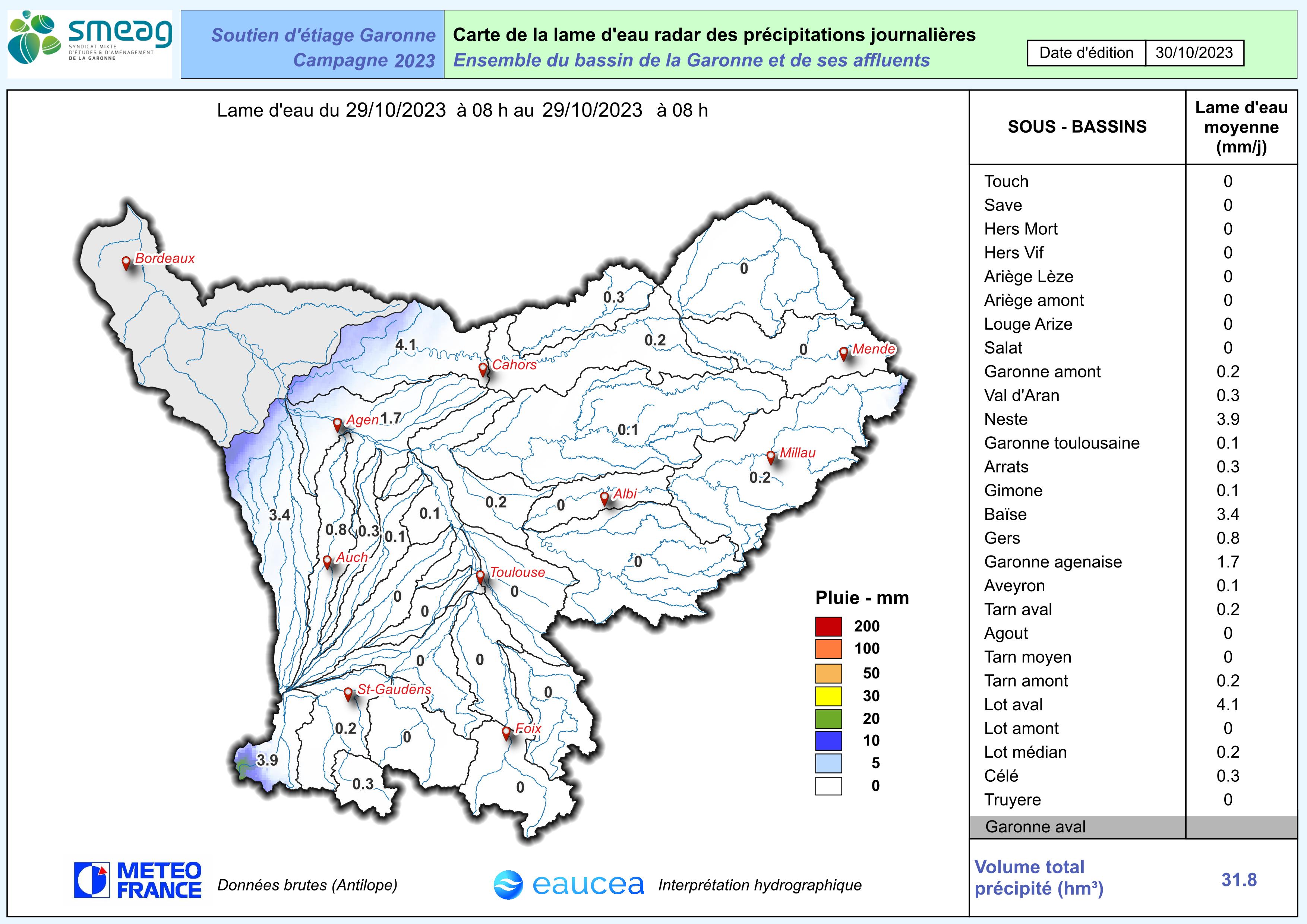 Cette carte illustre les quantités d'eau précipitées sur 24 heures par sous-bassins versants (source : images radar Météo France).