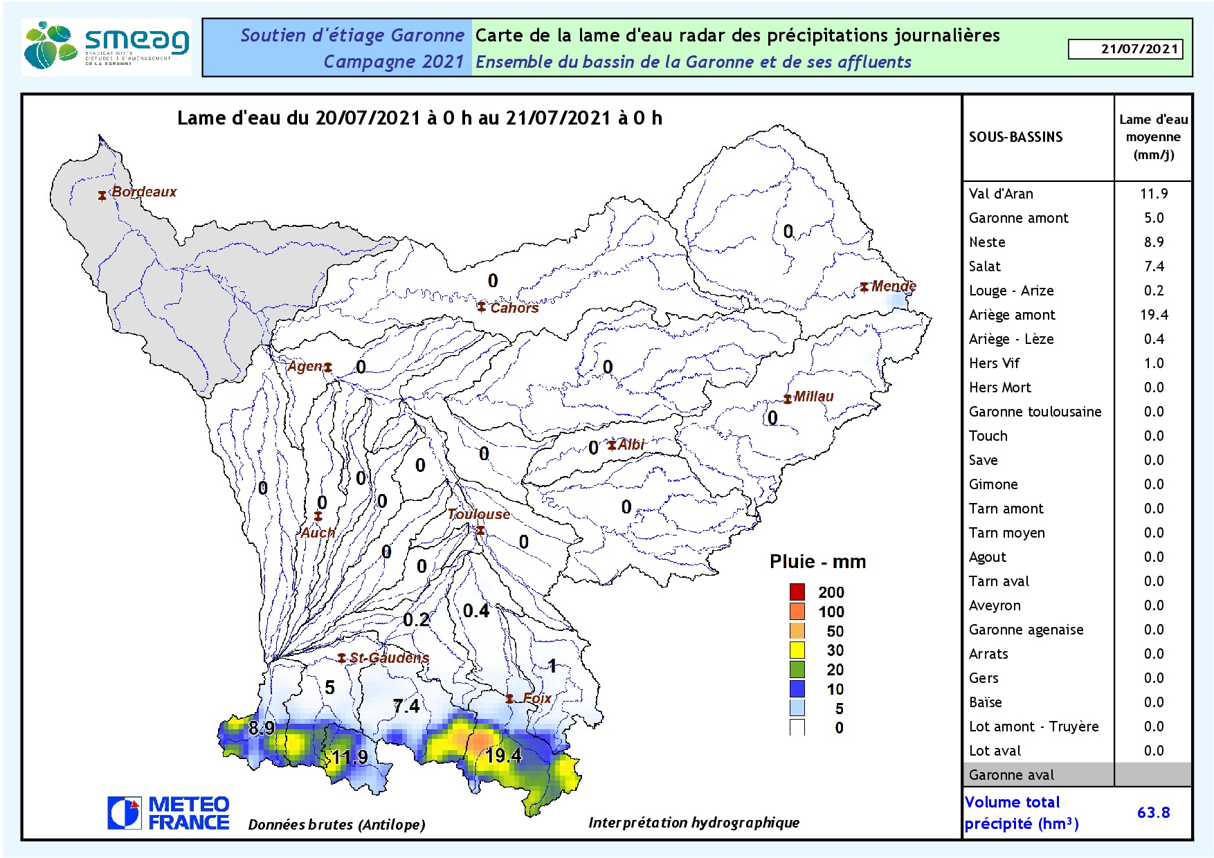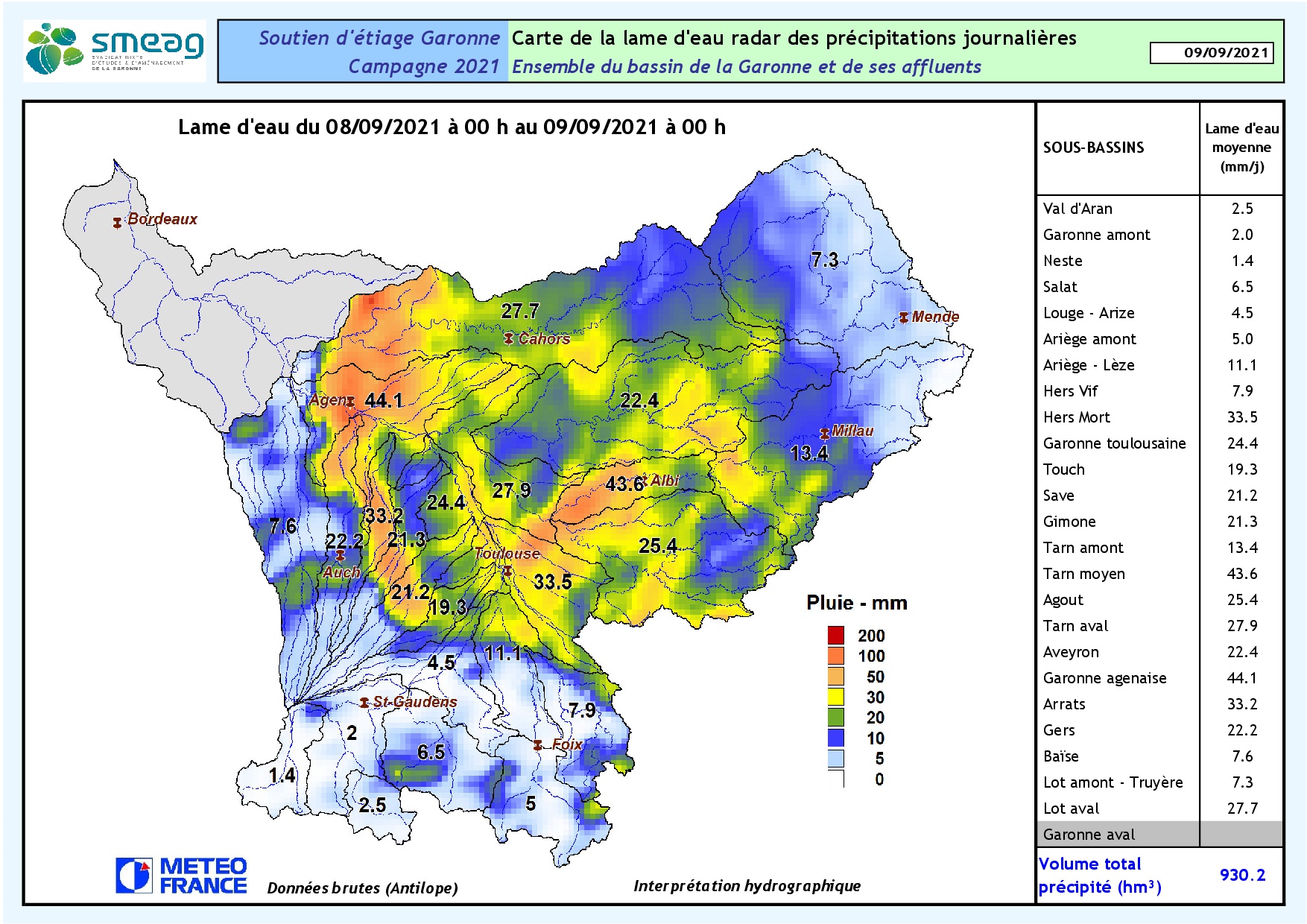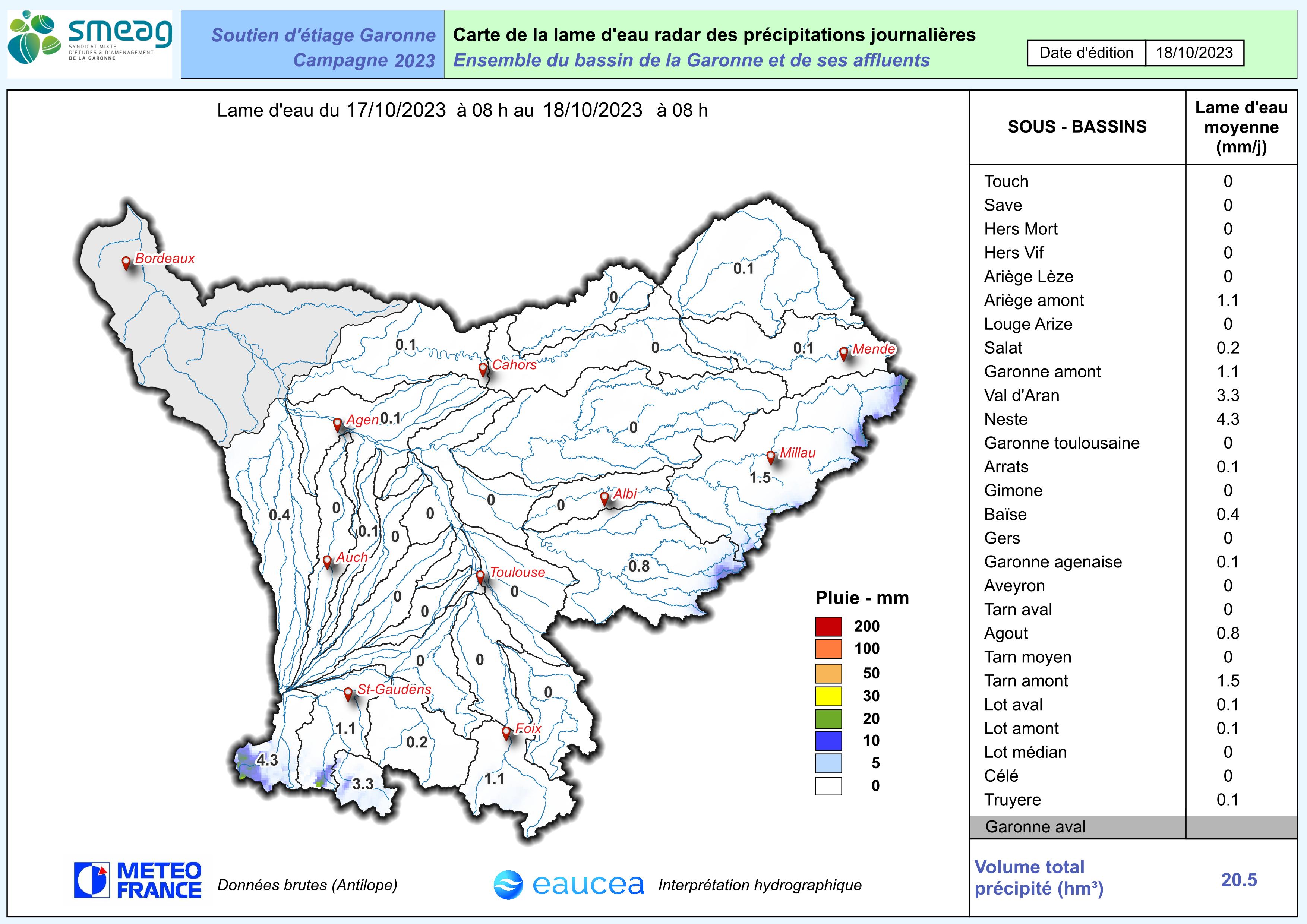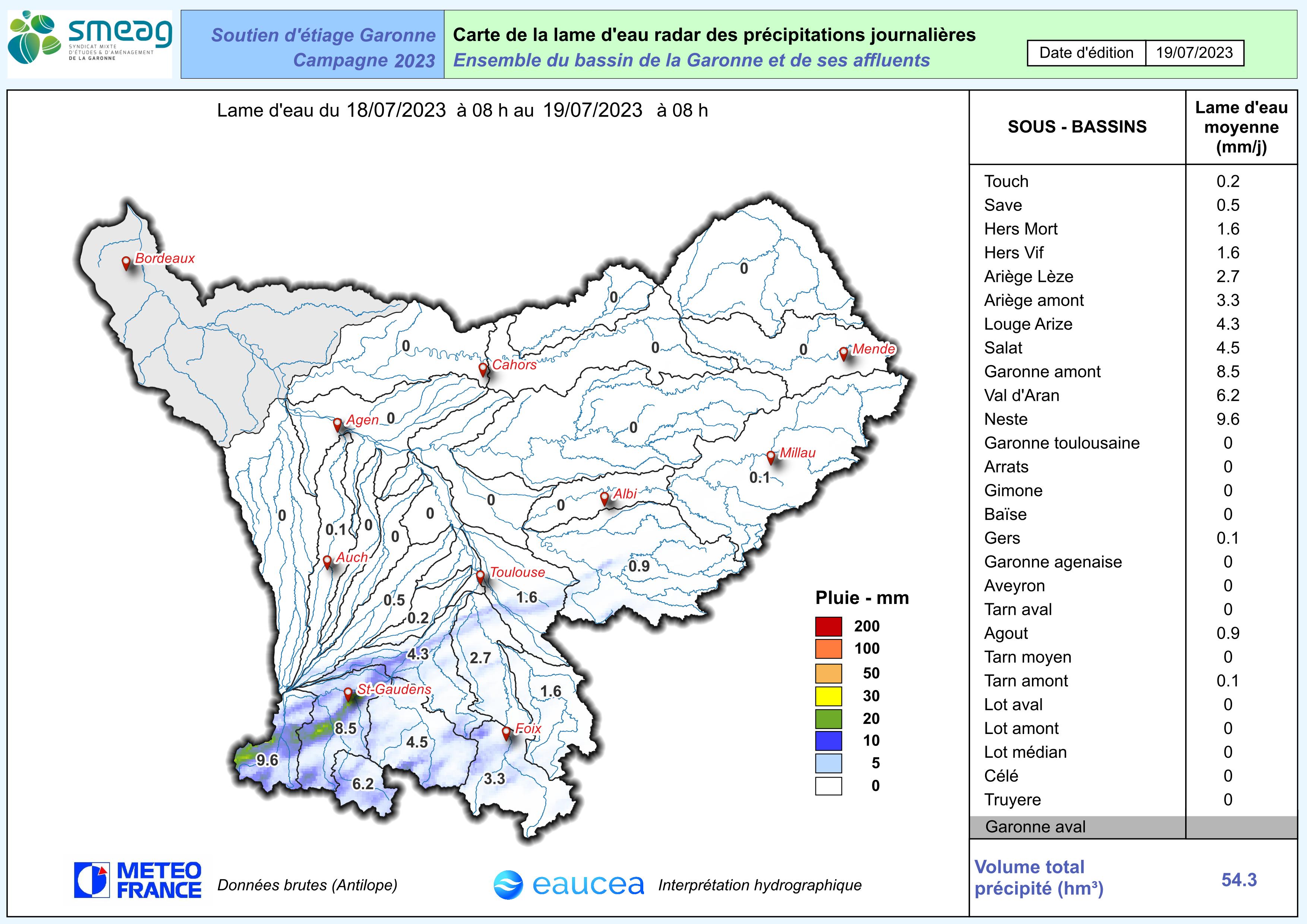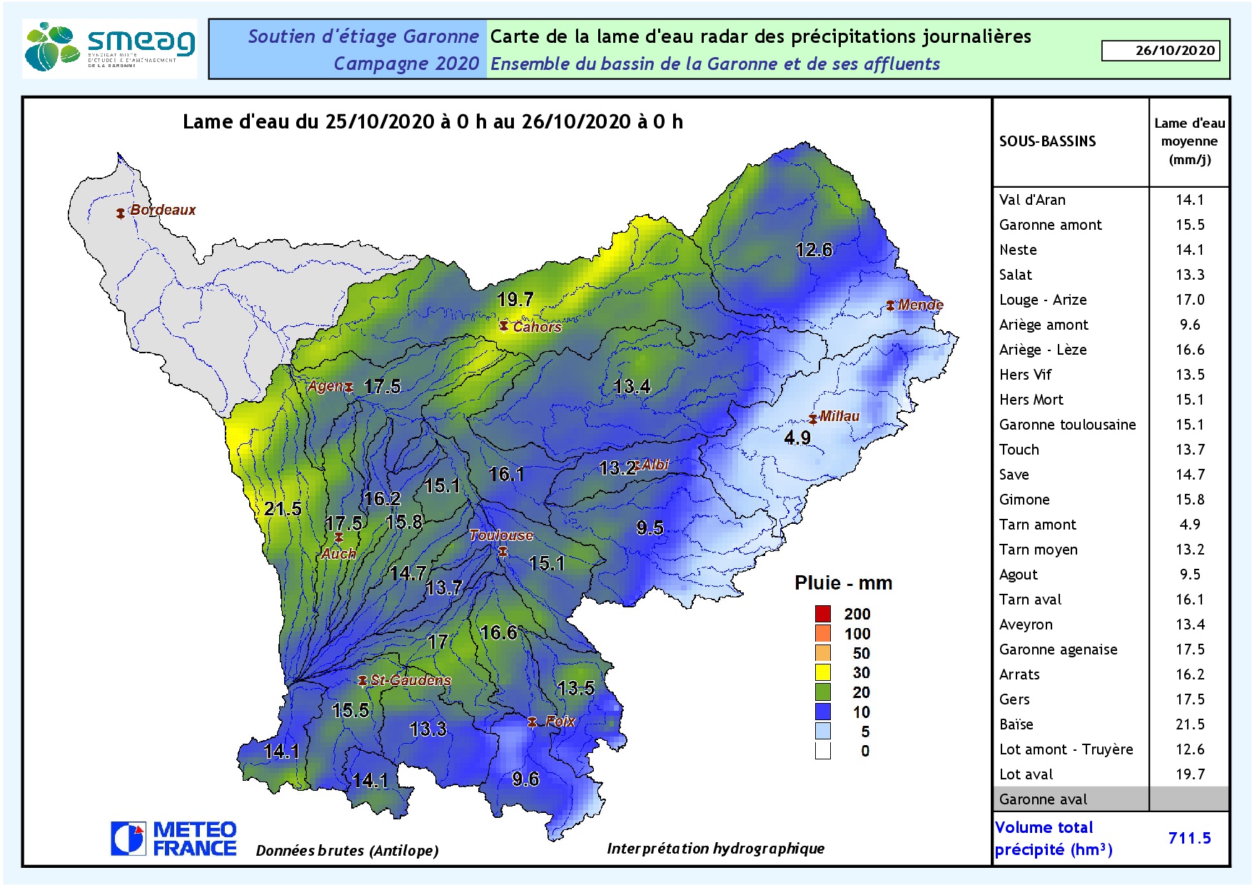 Cette carte illustre les quantités d'eau précipitées sur 24 heures par sous-bassins versants (source : images radar Météo France).