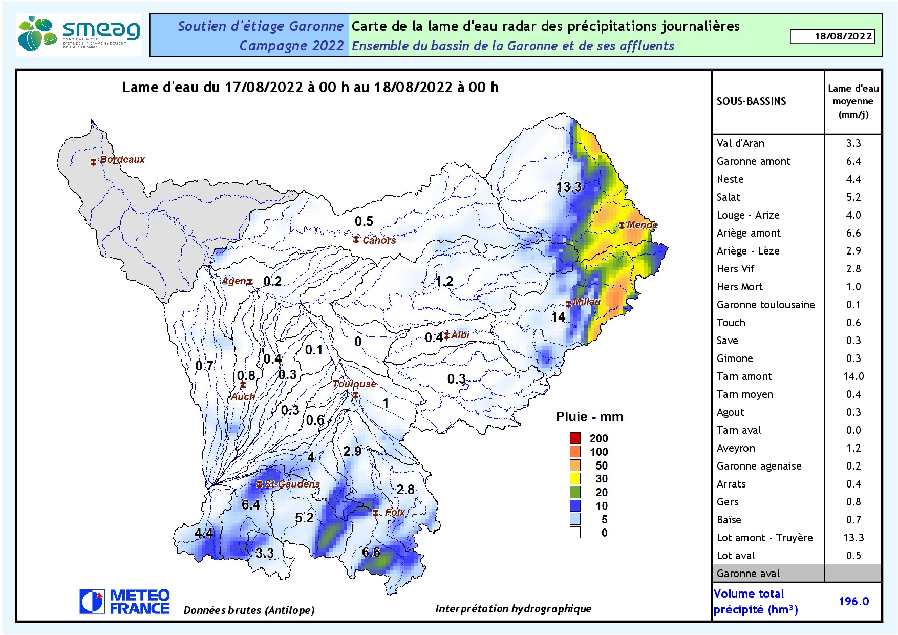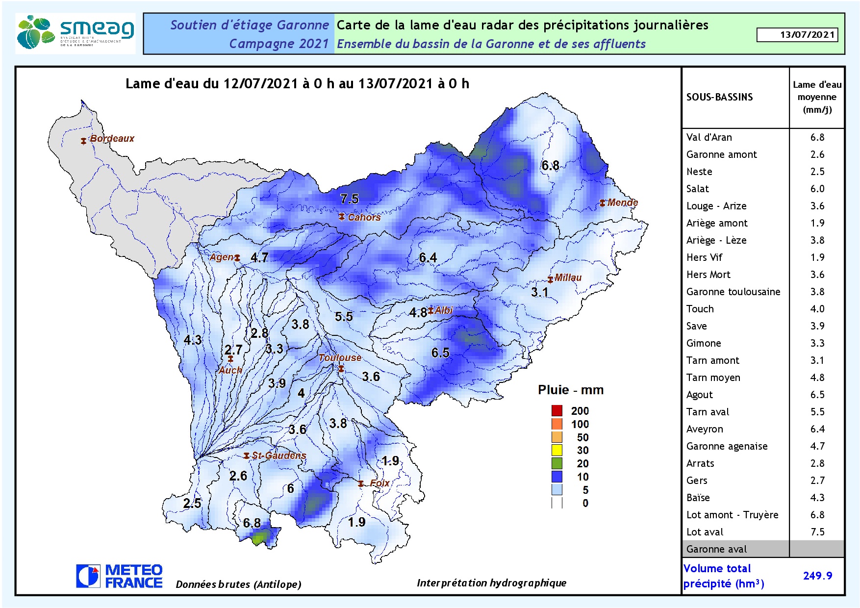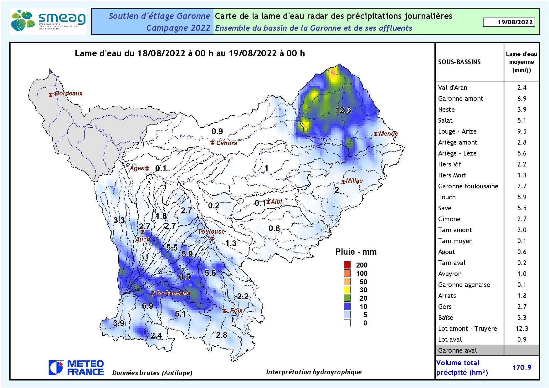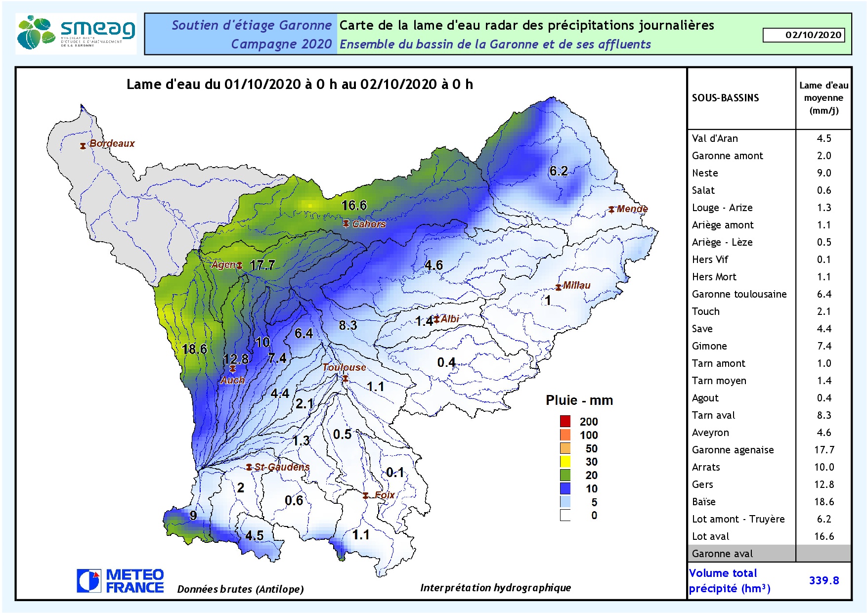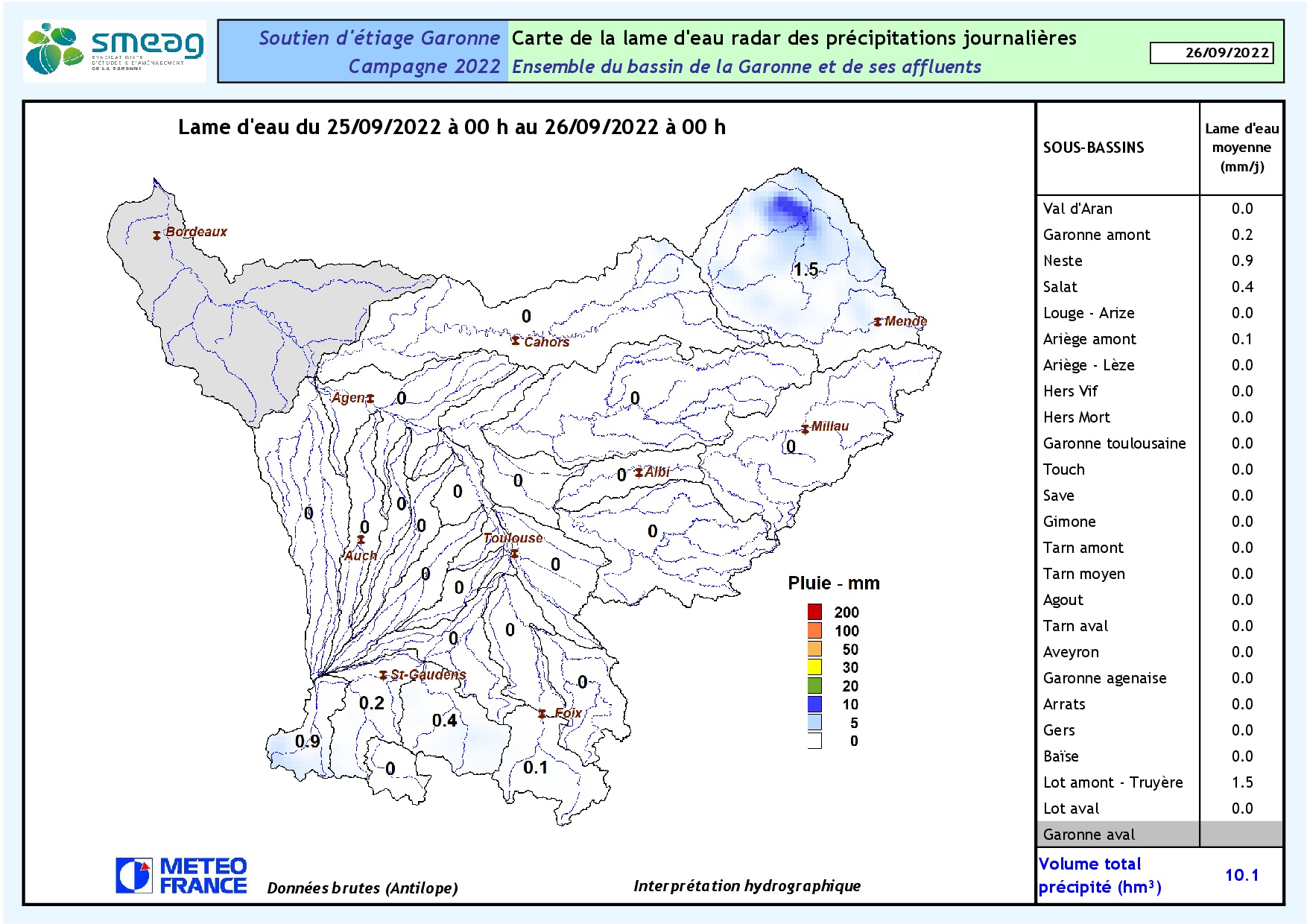 Cette carte illustre les quantités d'eau précipitées sur 24 heures par sous-bassins versants (source : images radar Météo France).
