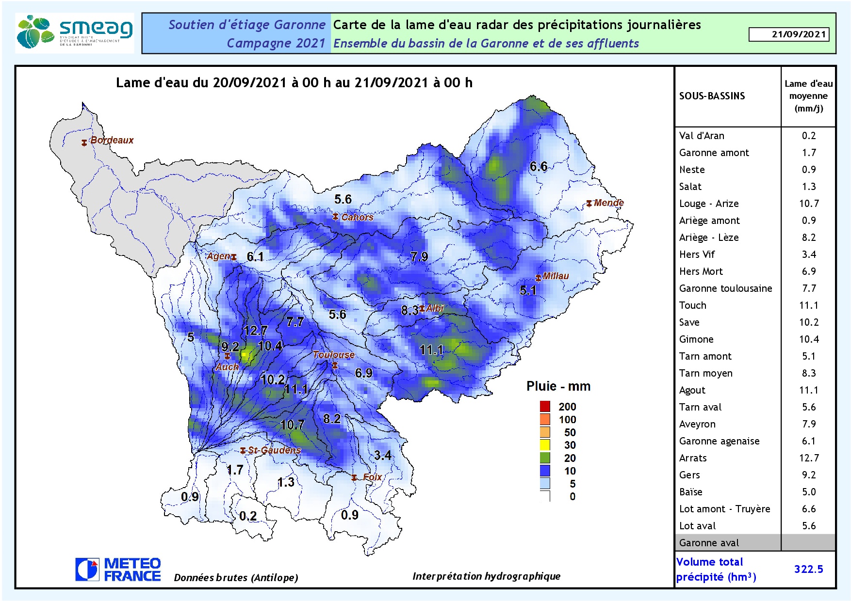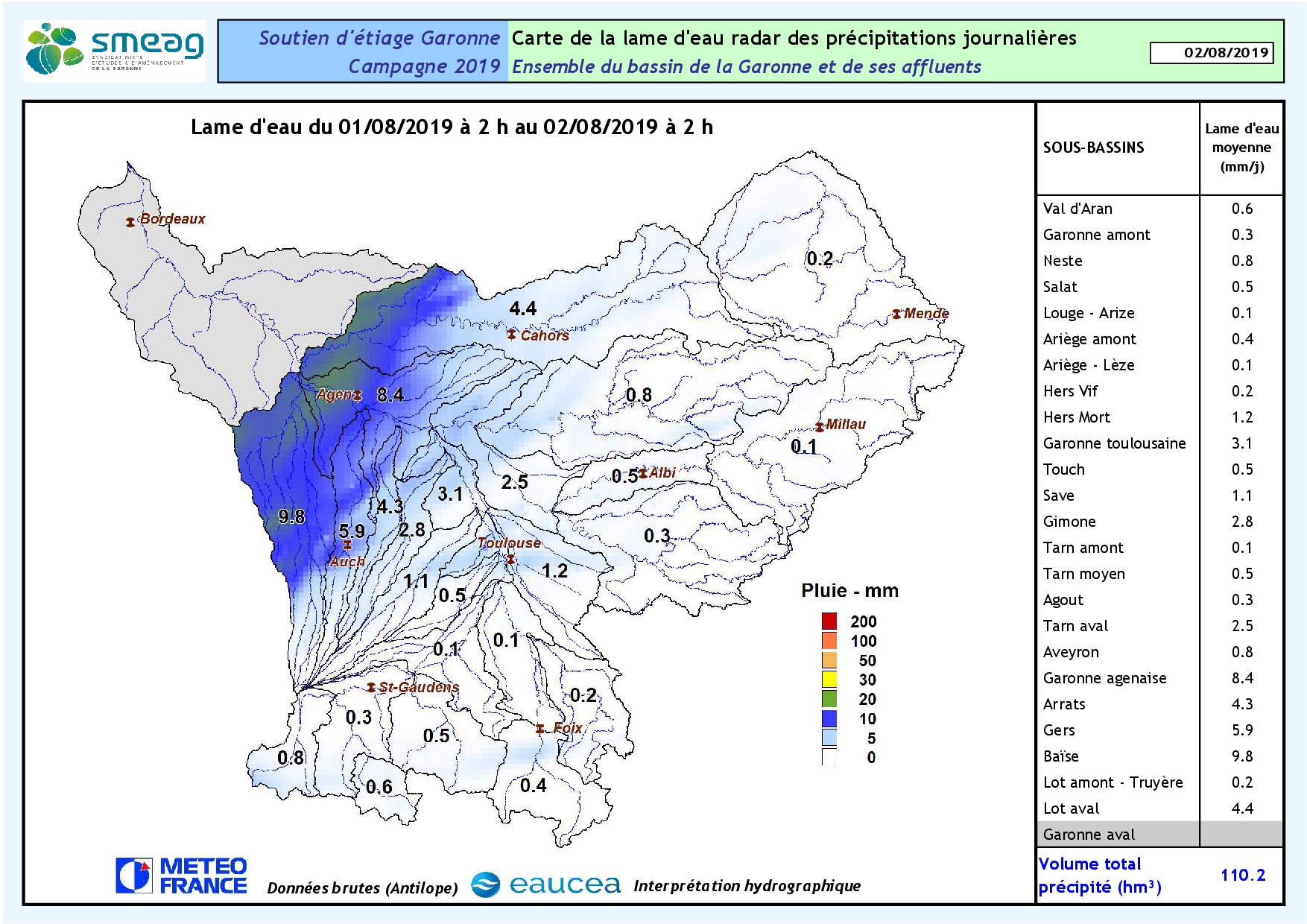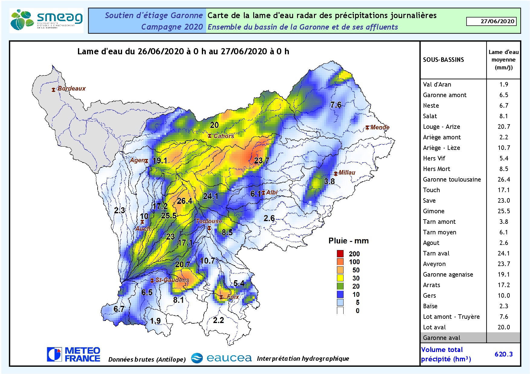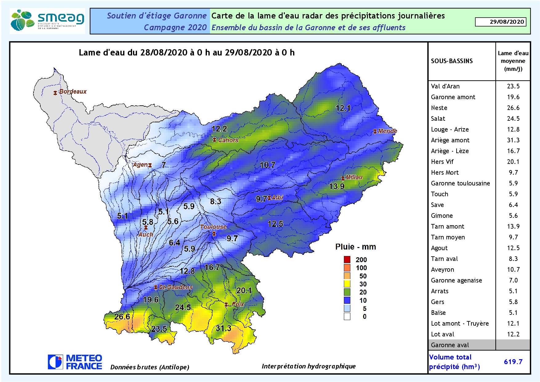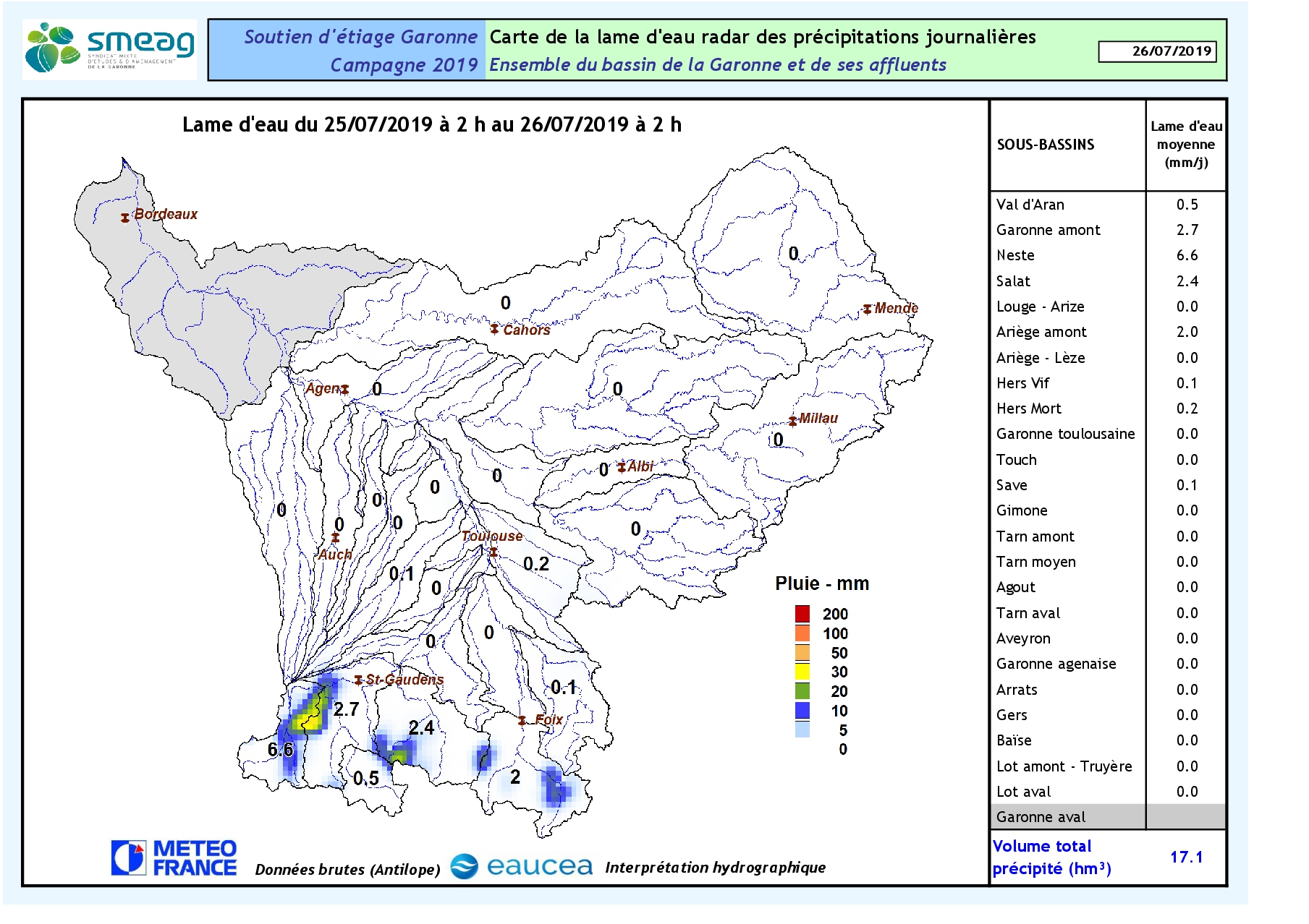 Cette carte illustre les quantités d'eau précipitées sur 24 heures par sous-bassins versants (source : images radar Météo France).