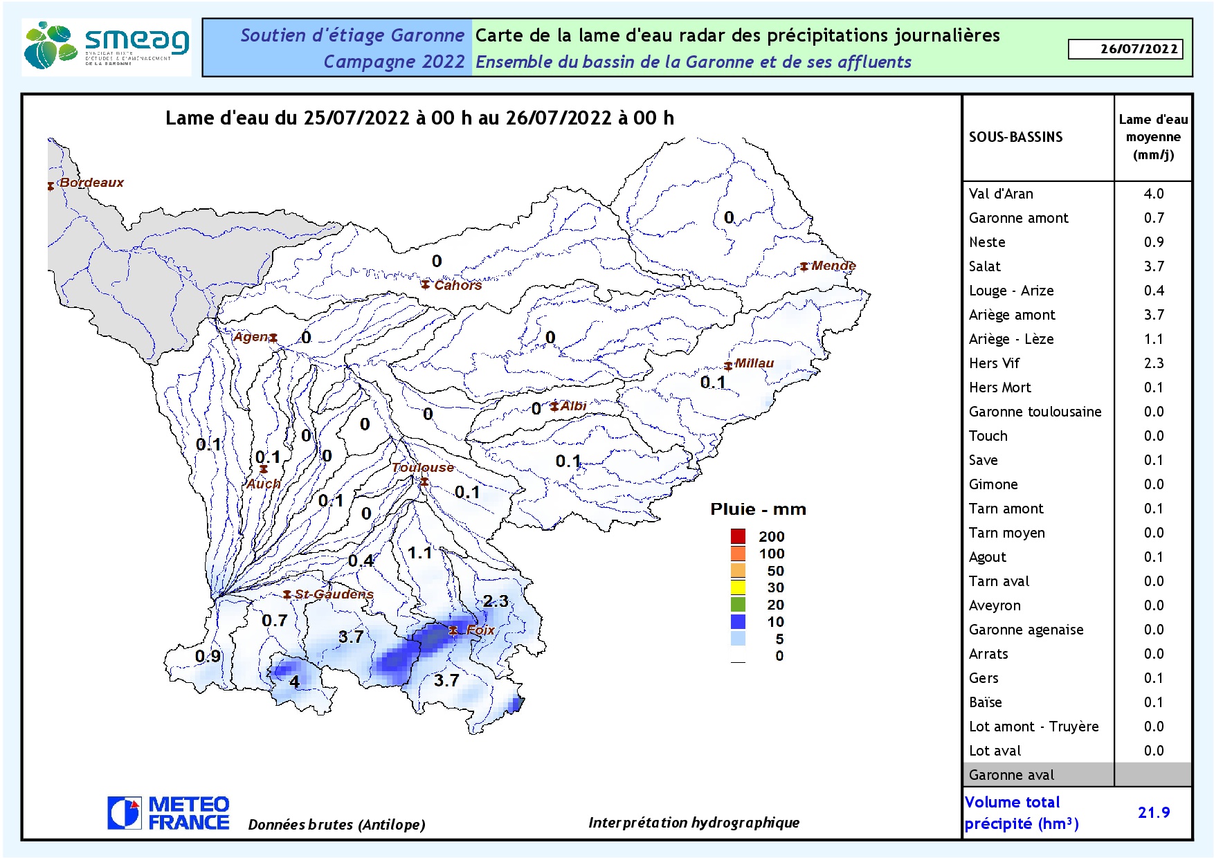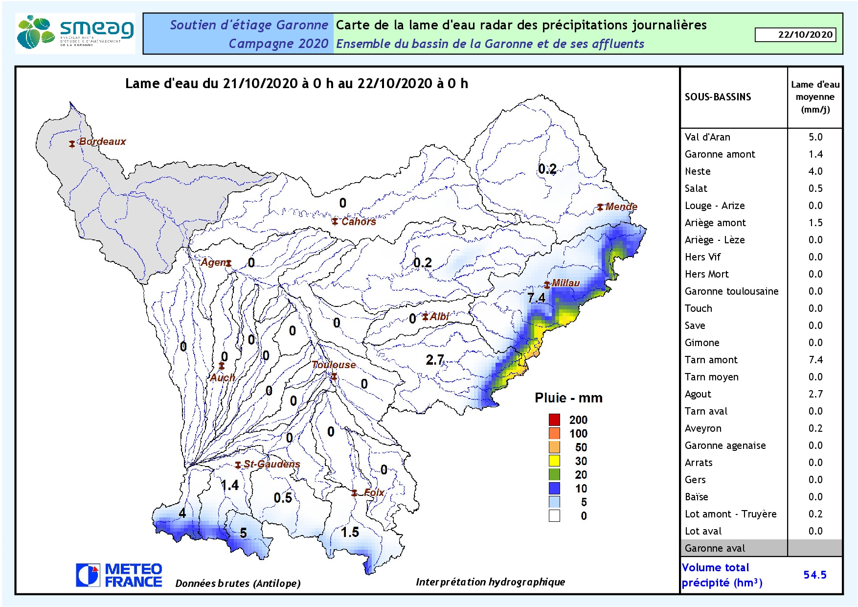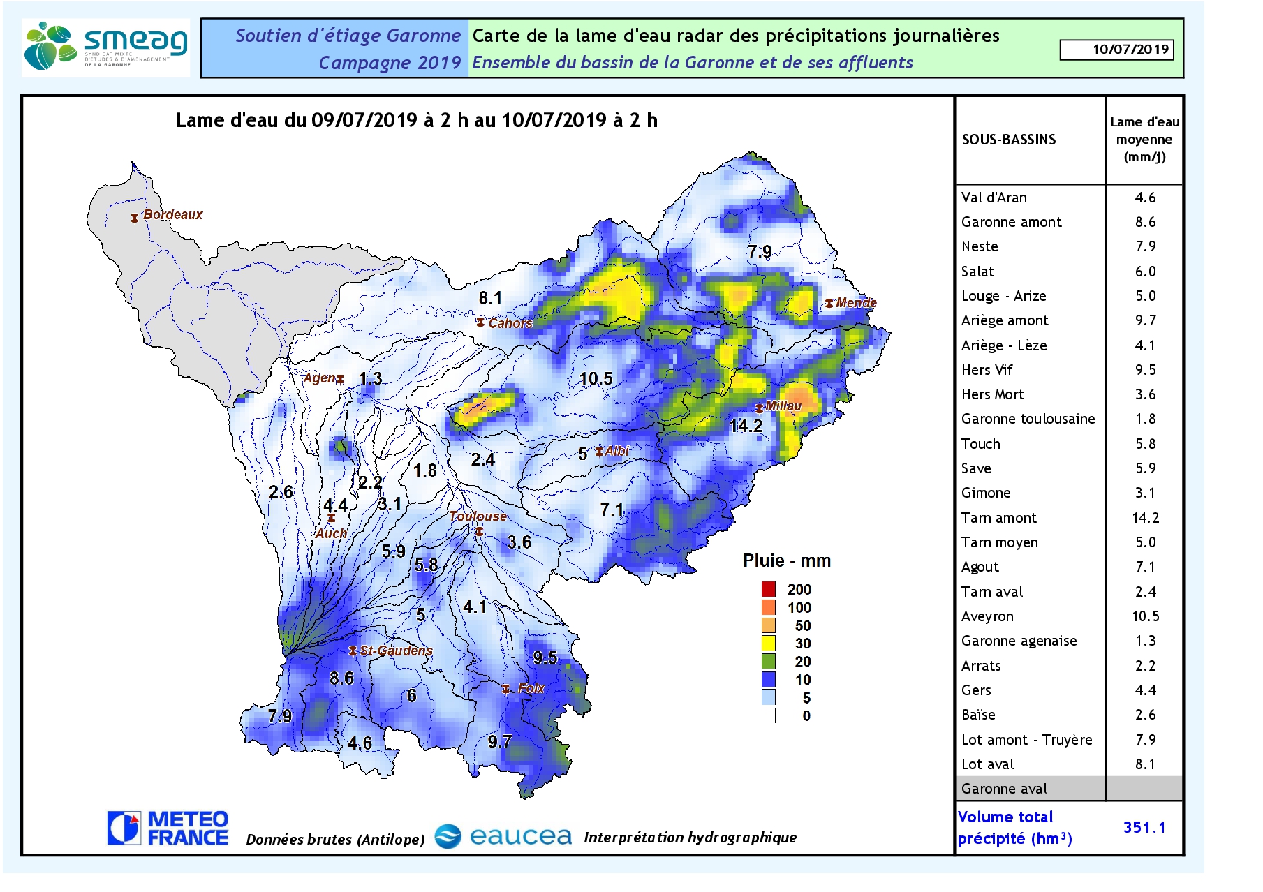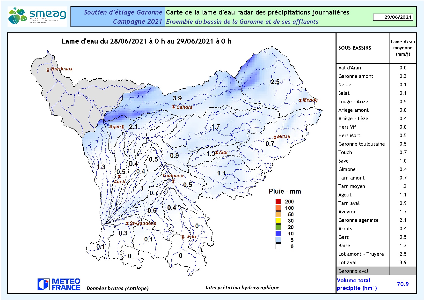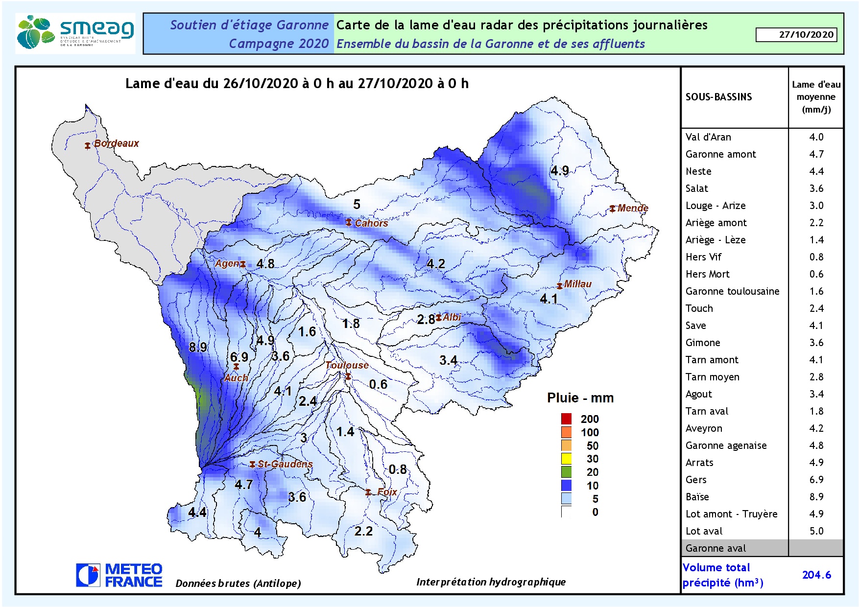 Cette carte illustre les quantités d'eau précipitées sur 24 heures par sous-bassins versants (source : images radar Météo France).