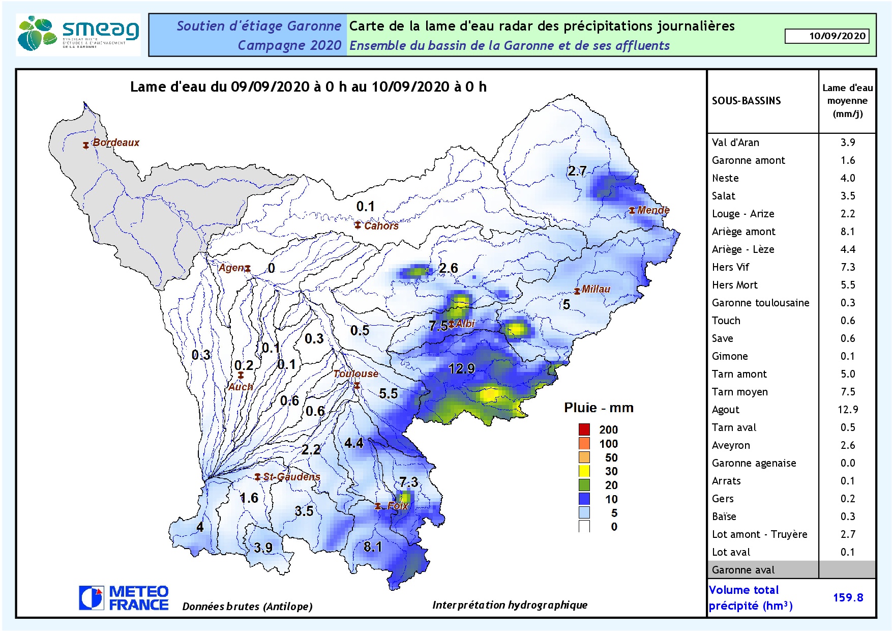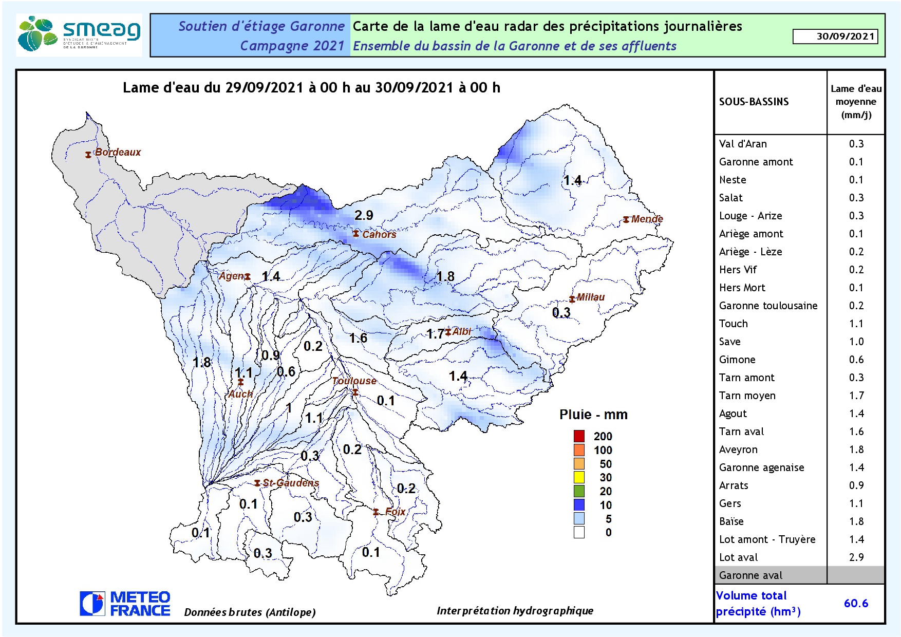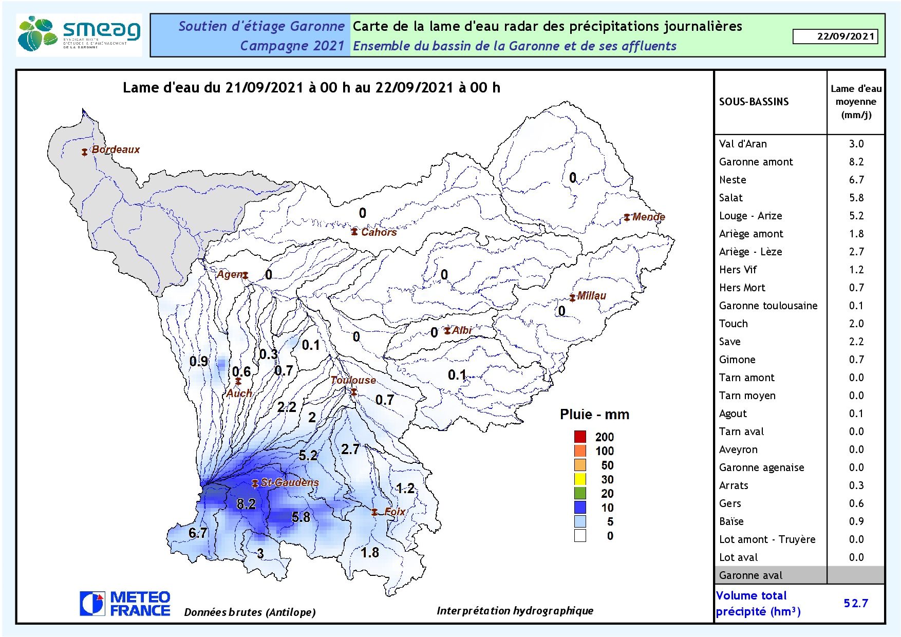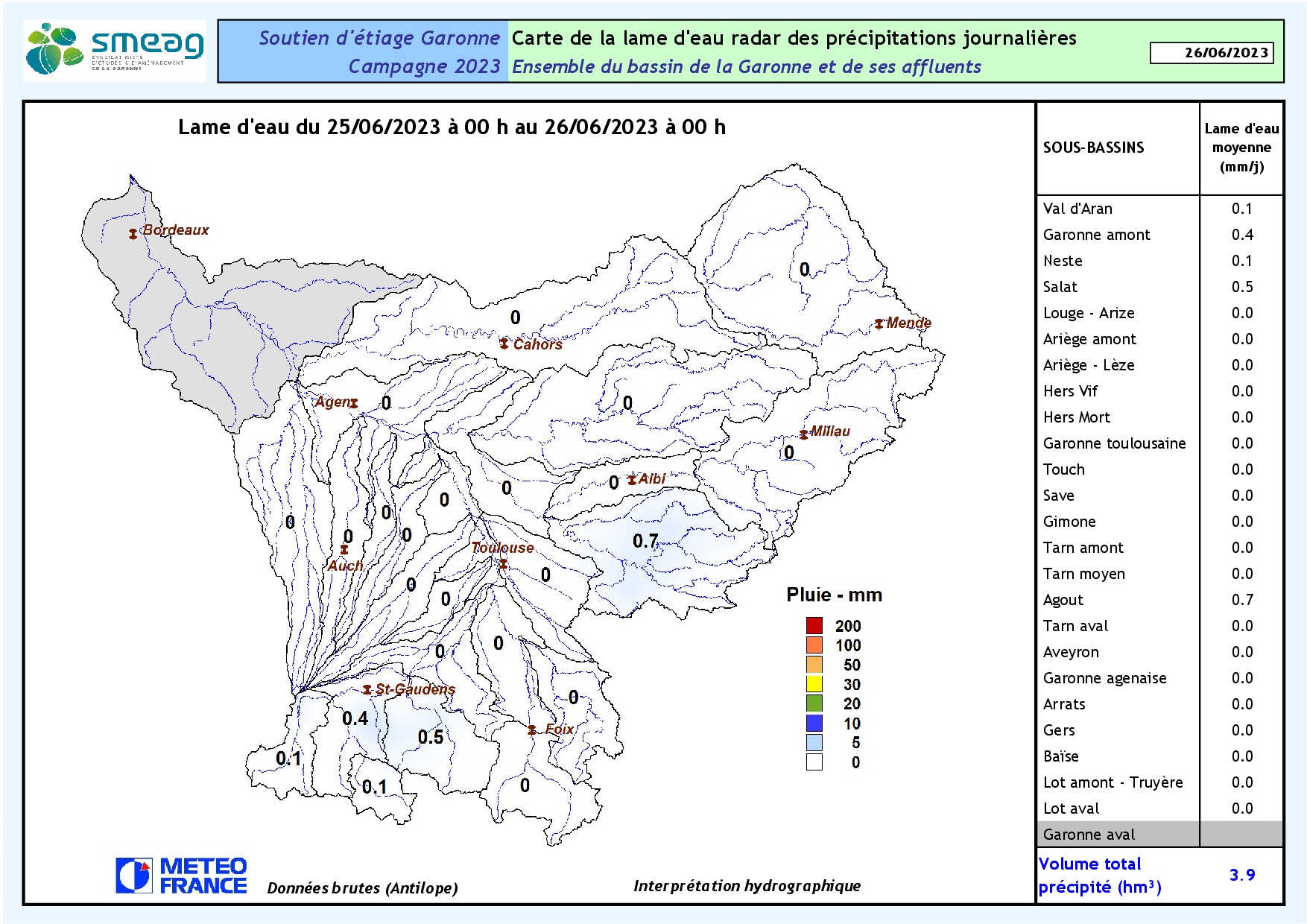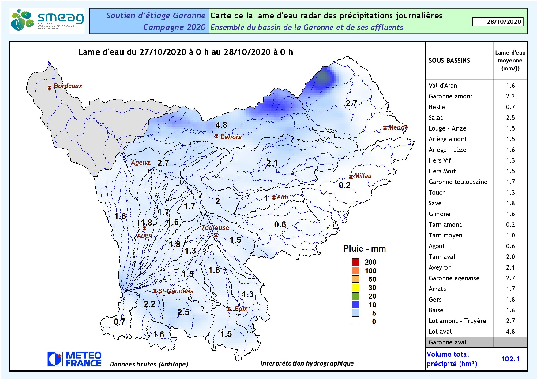 Cette carte illustre les quantités d'eau précipitées sur 24 heures par sous-bassins versants (source : images radar Météo France).