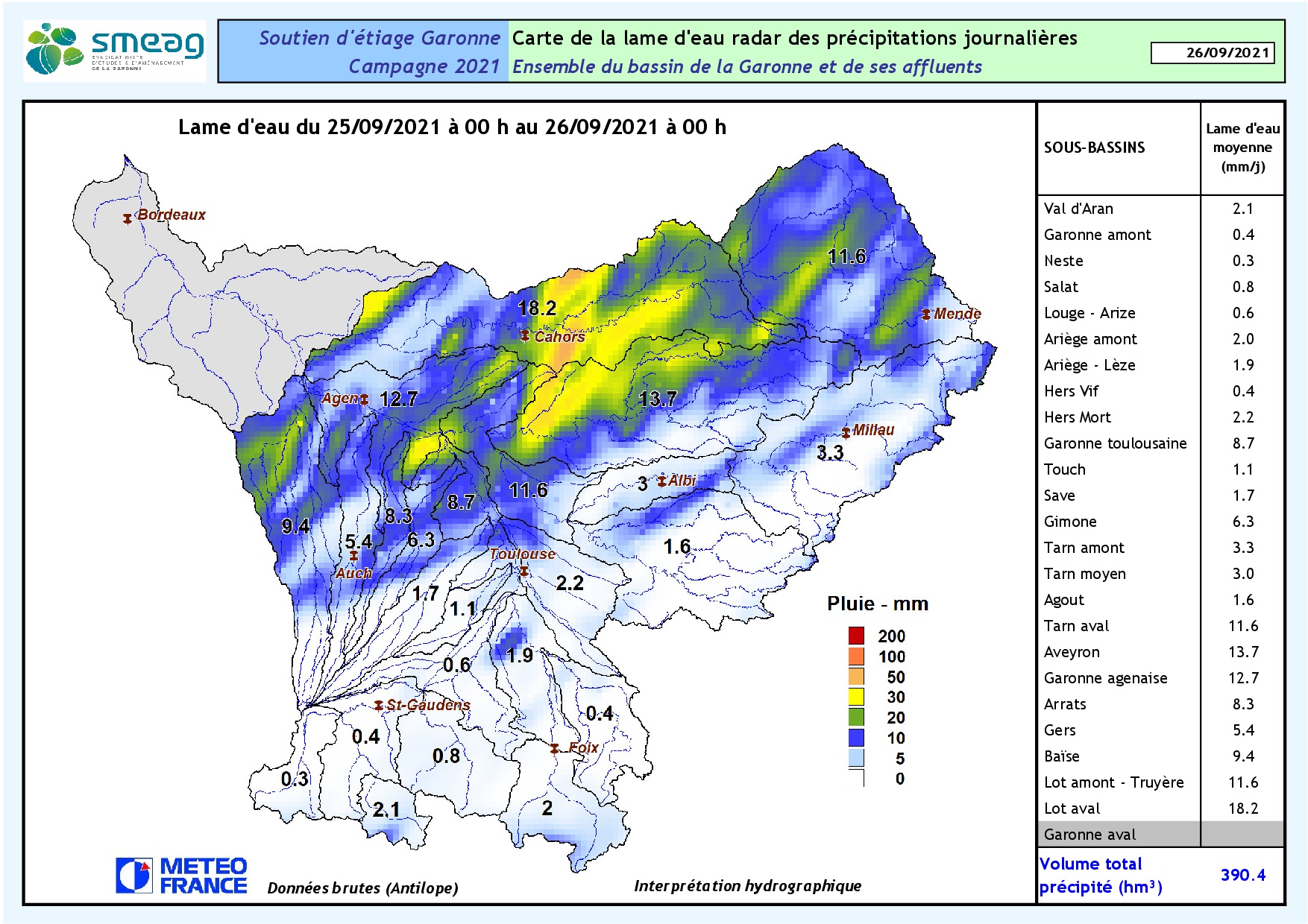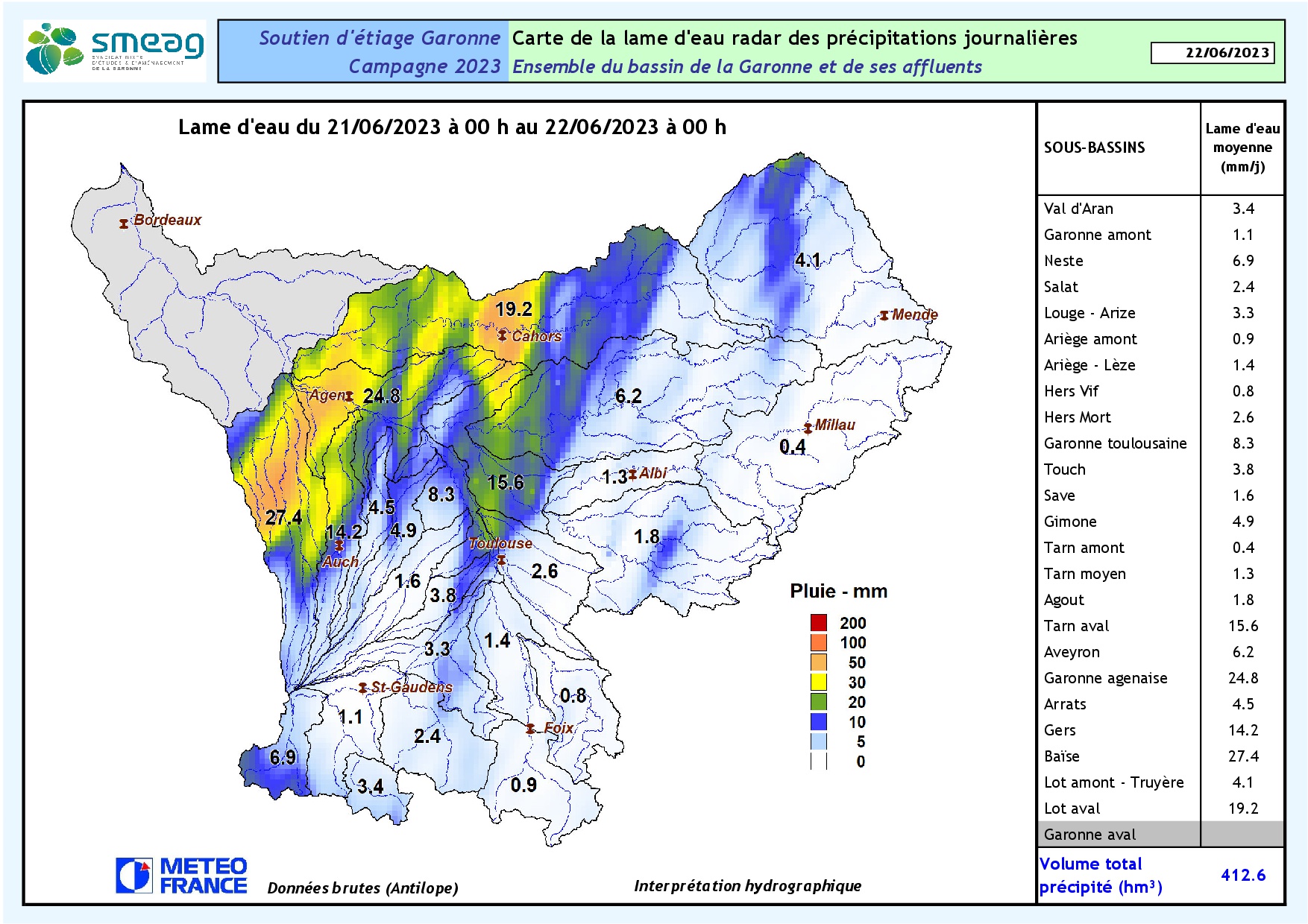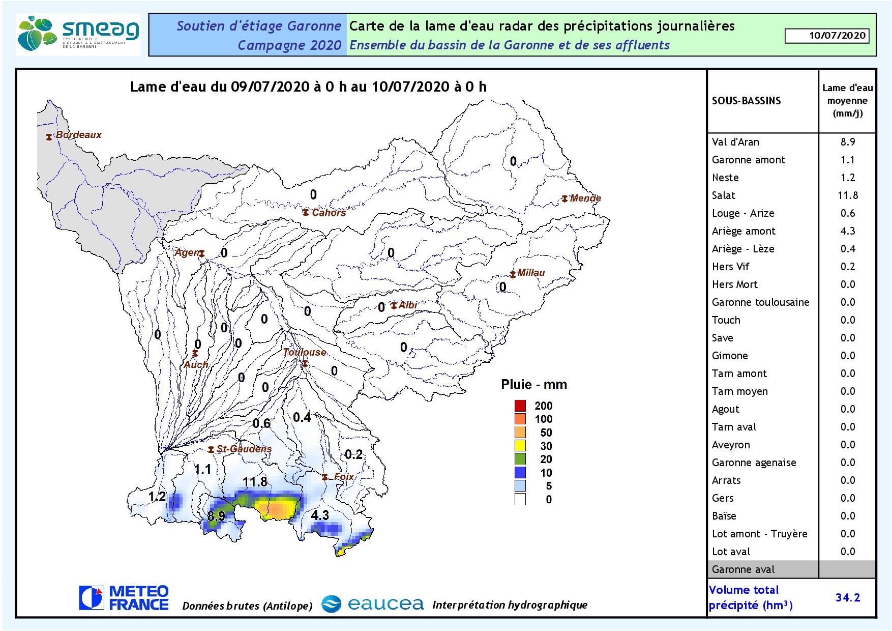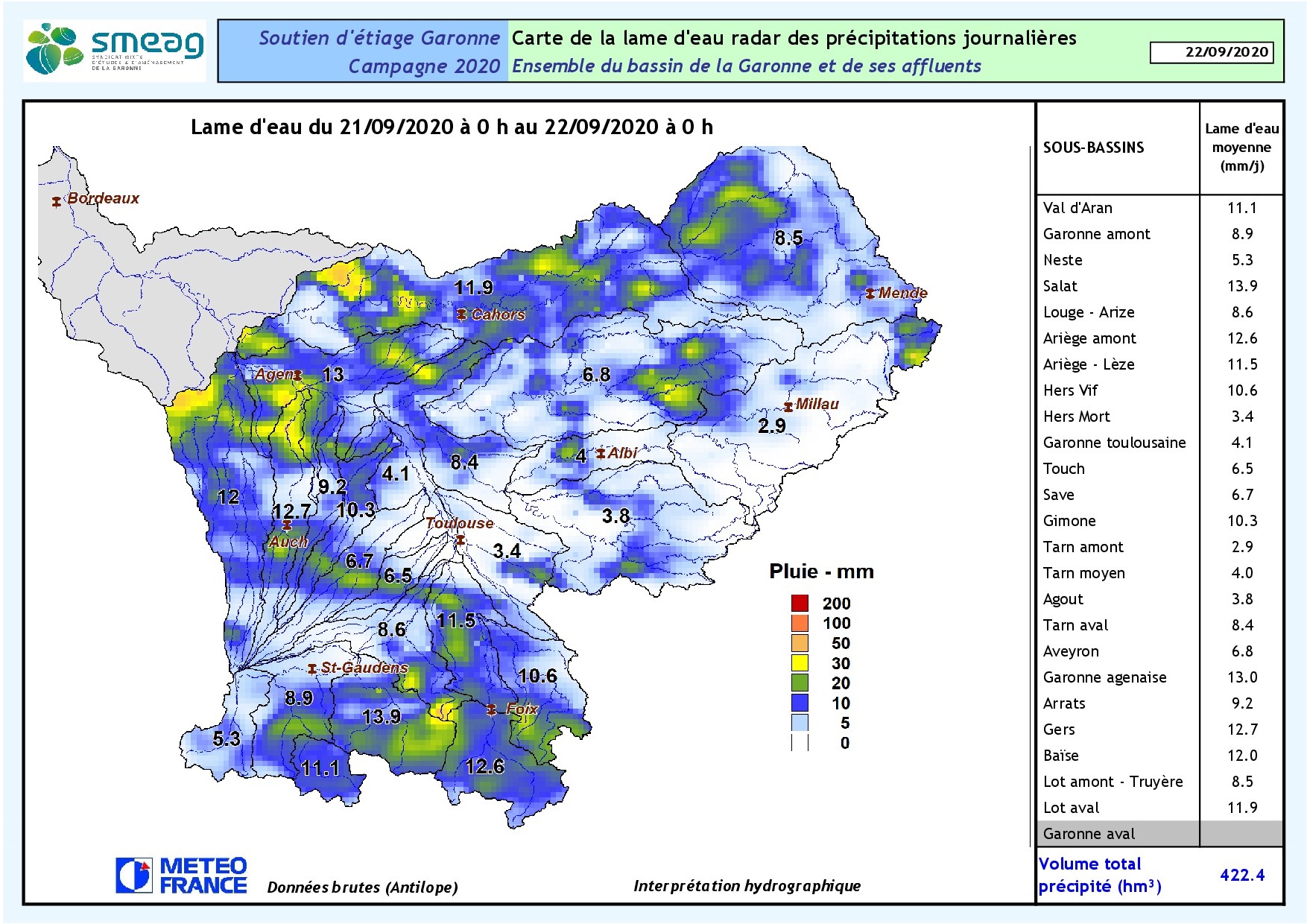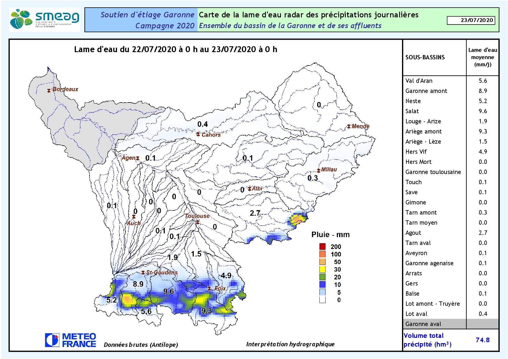 Cette carte illustre les quantités d'eau précipitées sur 24 heures par sous-bassins versants (source : images radar Météo France).