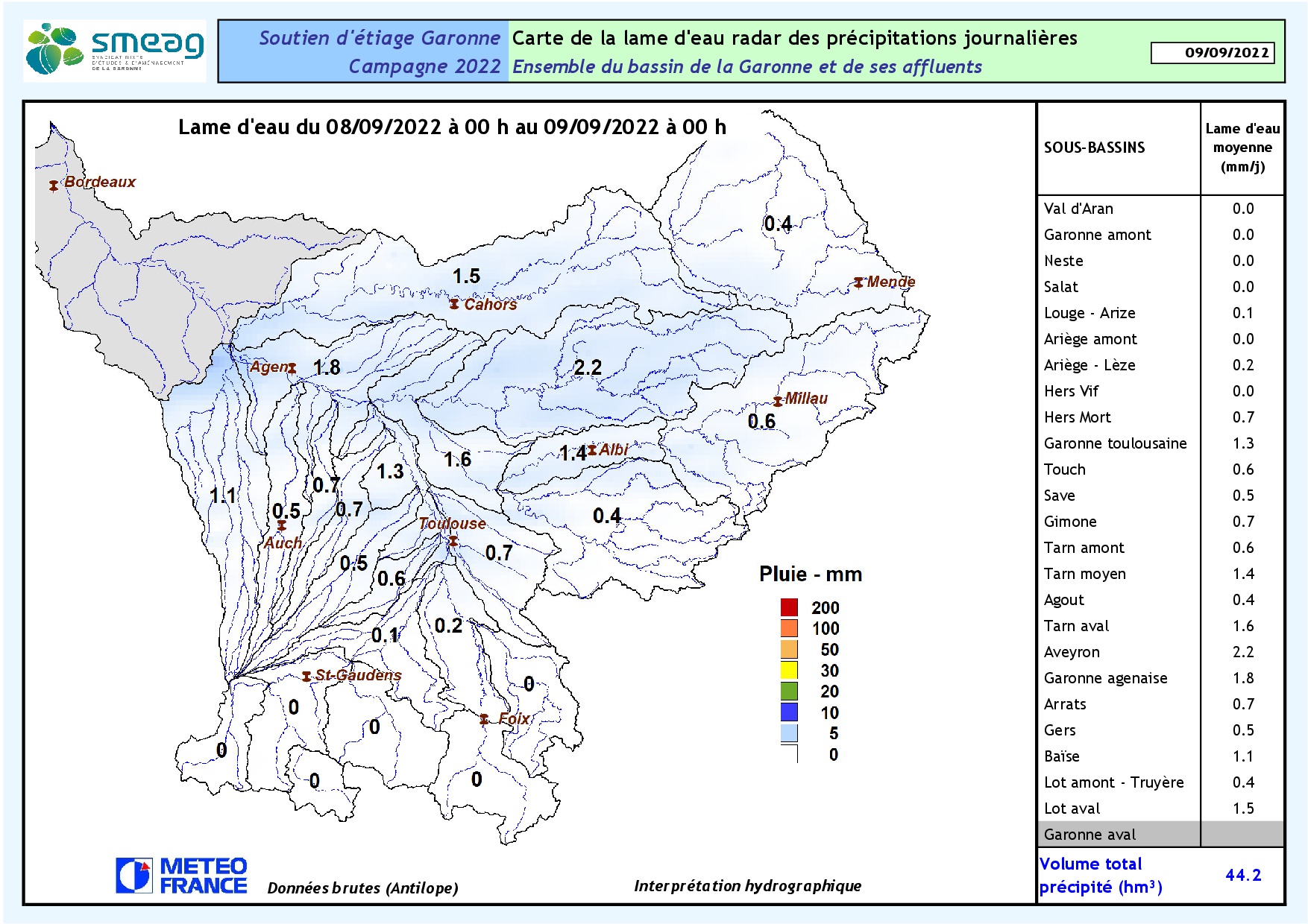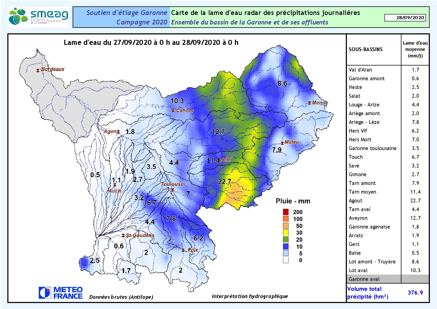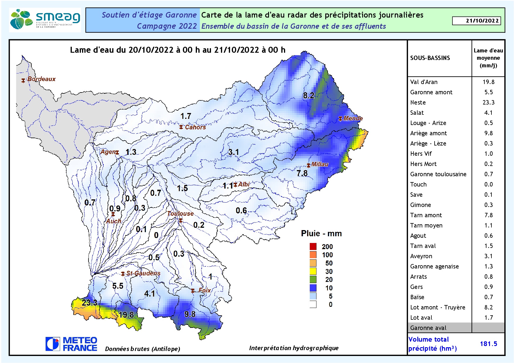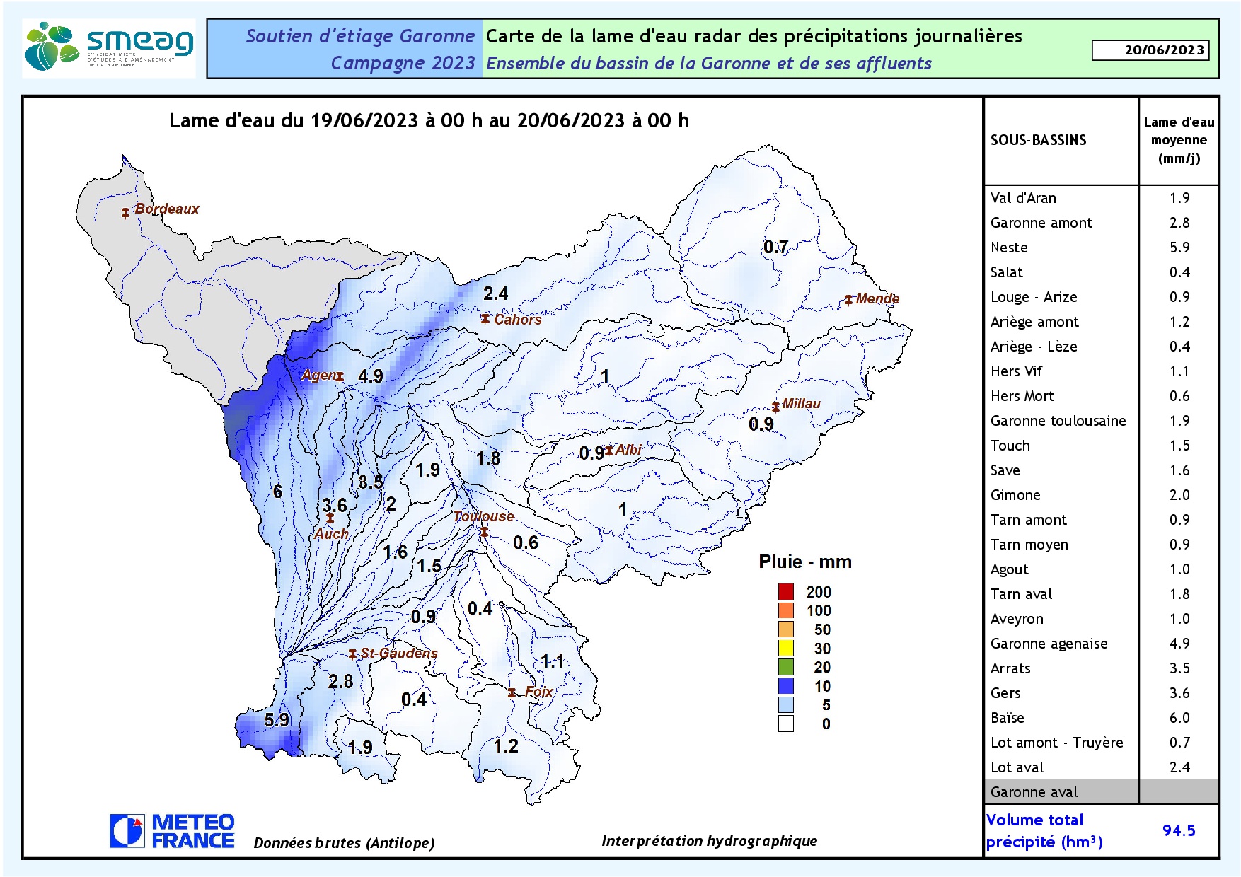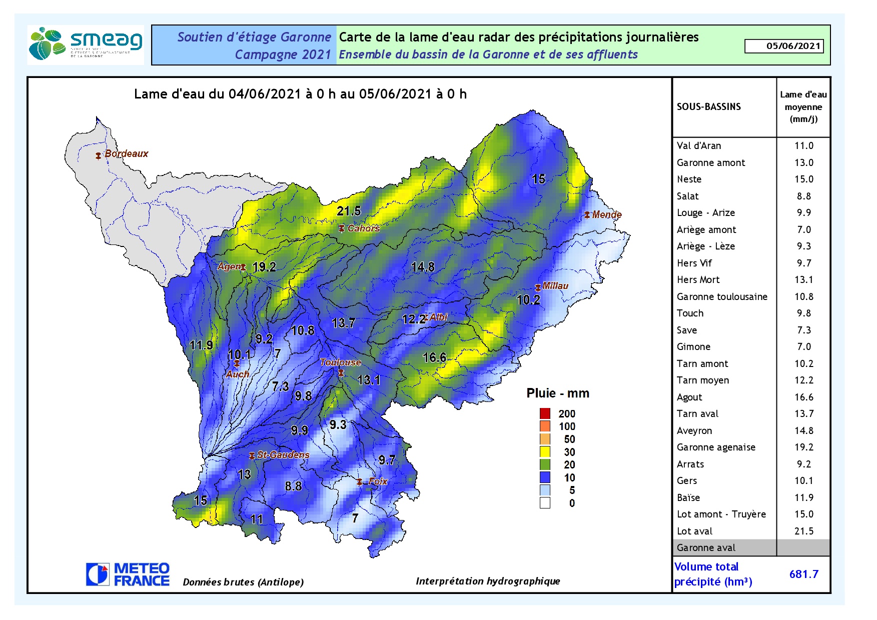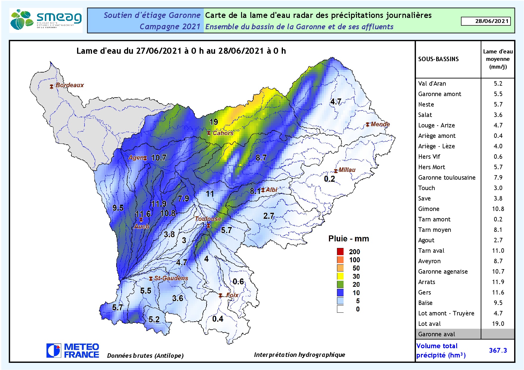 Cette carte illustre les quantités d'eau précipitées sur 24 heures par sous-bassins versants (source : images radar Météo France).
