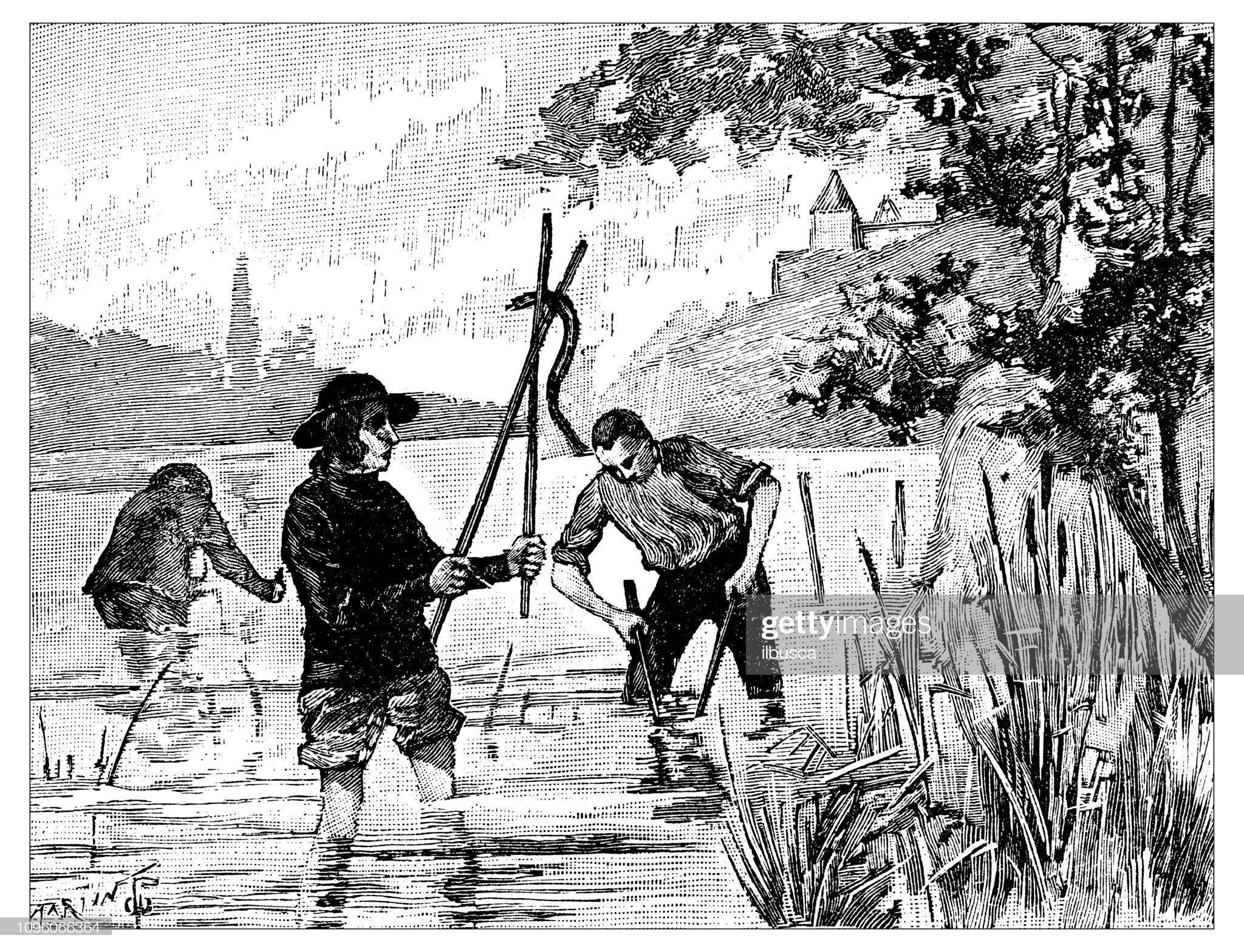 Ancienne illustration antique de gravure Français : pêche de la lamproie (source : getty images)