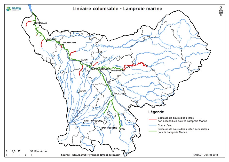 Linéaire colonisable de la lamproie marine sur la Garonne (source : Observatoire Garonne)