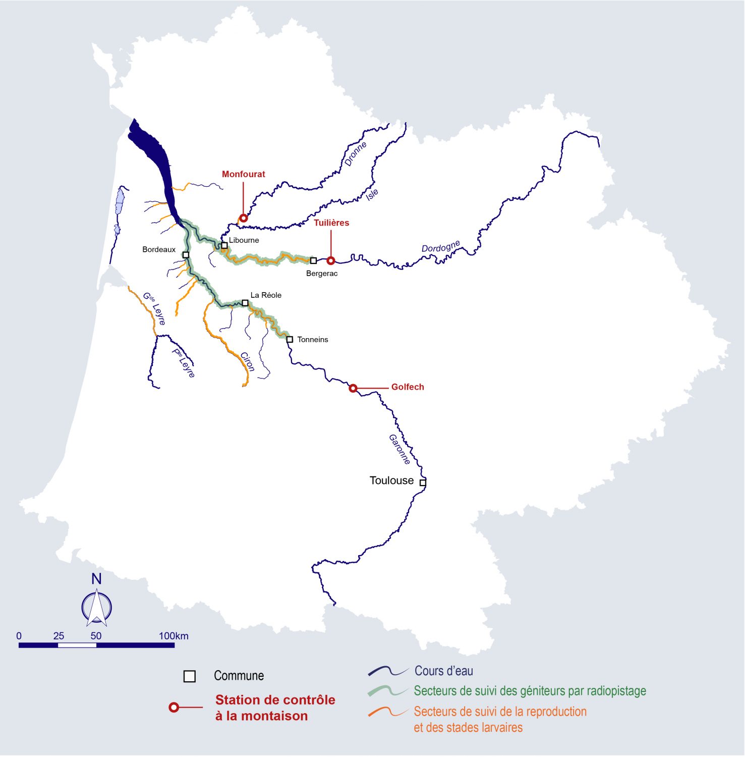 Carte des stations de contrôle de la lamproie marine (source : MIGADO)