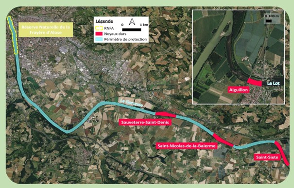 Depuis de nombreuses années, le seuil de Beauregard qui était un élément de fragmentation de la continuité écologique, se désagrège progressivement, ouvrant des brèches dans la structure. Cela permet aux grandes aloses de coloniser des sites de pontes, plus en amont de la RNN, jusqu’à Golfech (voir sites « noyaux durs » ci-dessous). Cependant, l’emprise actuelle de la RNN ne correspond plus à la réalité du terrain et un projet d’extension de la réserve est en cours. Cela permettra de protéger et suivre au mieux les sites de pontes et de croissance des alosons.