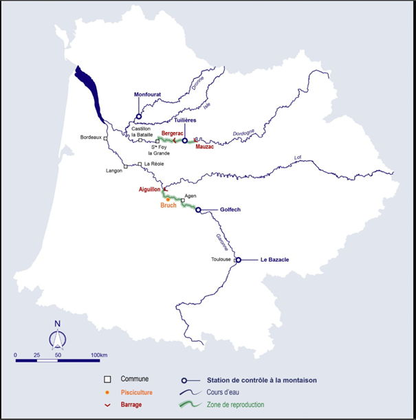 Plus spécifiquement sur la Garonne, les grandes aloses trouvent des zones de frayères favorables et se reproduisent en aval de Golfech, du fait d’obstacles sur le cours d’eau empêchant la remontée plus en amont (jusqu’à Toulouse). Chaque année, le stock reproducteur de la Garonne est évalué grâce au suivi de la reproduction naturelle effectué en aval de Golfech, porté par MIGADO.