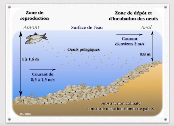 Le débit et la température de l’eau jouent un rôle essentiel dans la reproduction de la Grande alose. Le débit optimal pour l’activité de ponte de l’espèce se situe entre 150 et 450 m3/s. Sur le même principe, la température optimale de l’eau se trouve entre 12°C et 24°C. Les aloses fraient entre mai et mi-juillet sur des sites typiques caractérisés par une plage de substrat grossier délimitée en amont par une fosse et en aval par une zone peu profonde à courant rapide avec une qualité d’eau convenable. L’activité de ponte se déroule de nuit selon une succession de séquences comportementales très caractéristiques avec l’émission d’un bruit particulier qui constitue le phénomène de « bull » (Illustration ci-dessous).