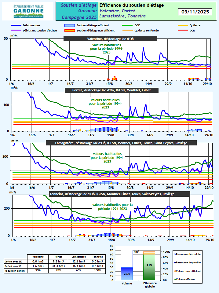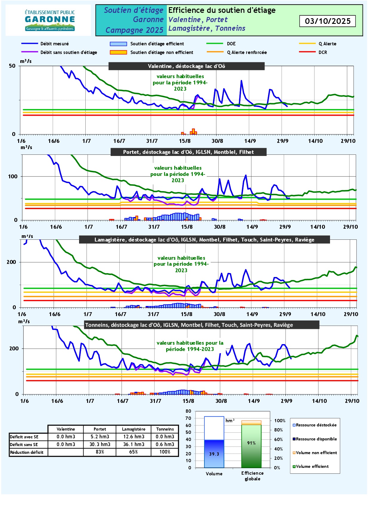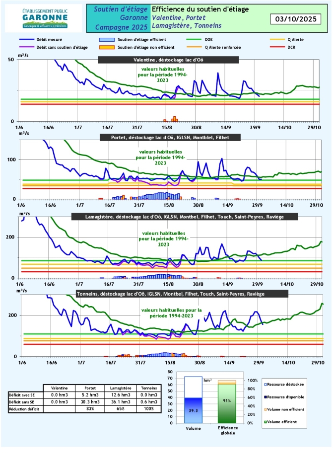 Ces schémas illustrent les débits, avec, et sans soutien d'étiage du 1er juin au 31 octobre, comparés aux valeurs habituelles pour la saison (courbe verte). L'illustration renseigne également sur l'efficience hydraulique du soutien d'étiage (en %) et sur les déficits, avec, et sans soutien d'étiage (en millions de m3).