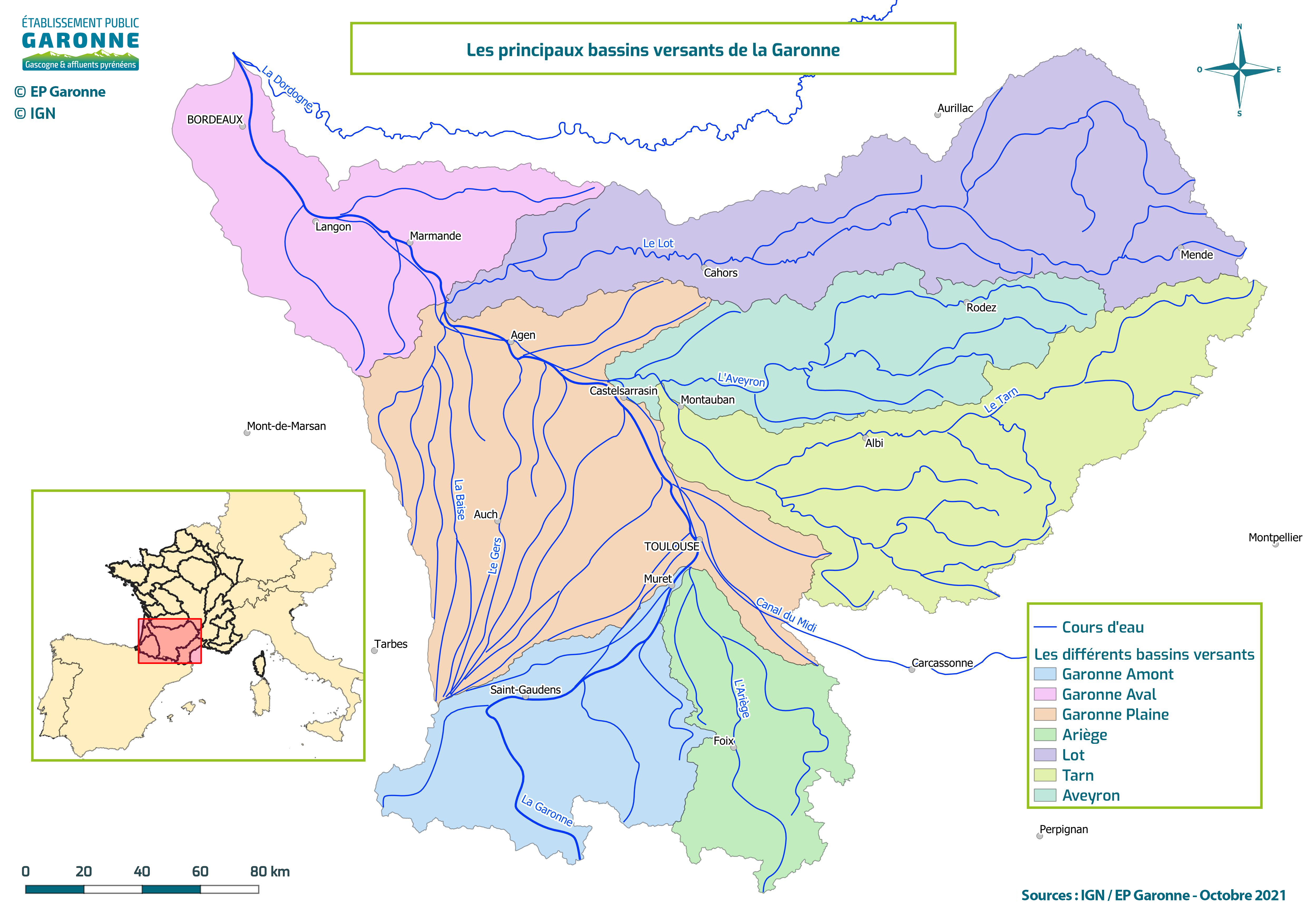 Le bassin de la Garonne draine un vaste bassin versant dont sa vallée est l’axe névralgique. Le bassin versant représente l’ensemble de la superficie alimentée par tous les cours d’eau et nappes souterraines qui convergent vers la Garonne et l'Estuaire.